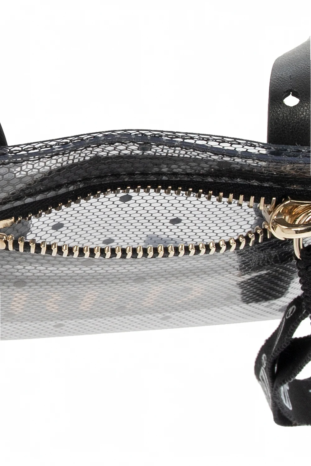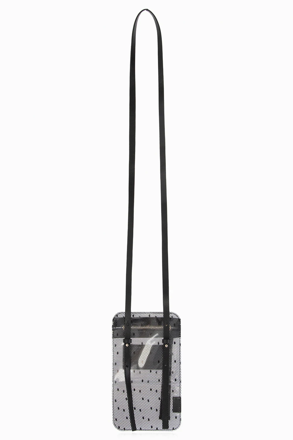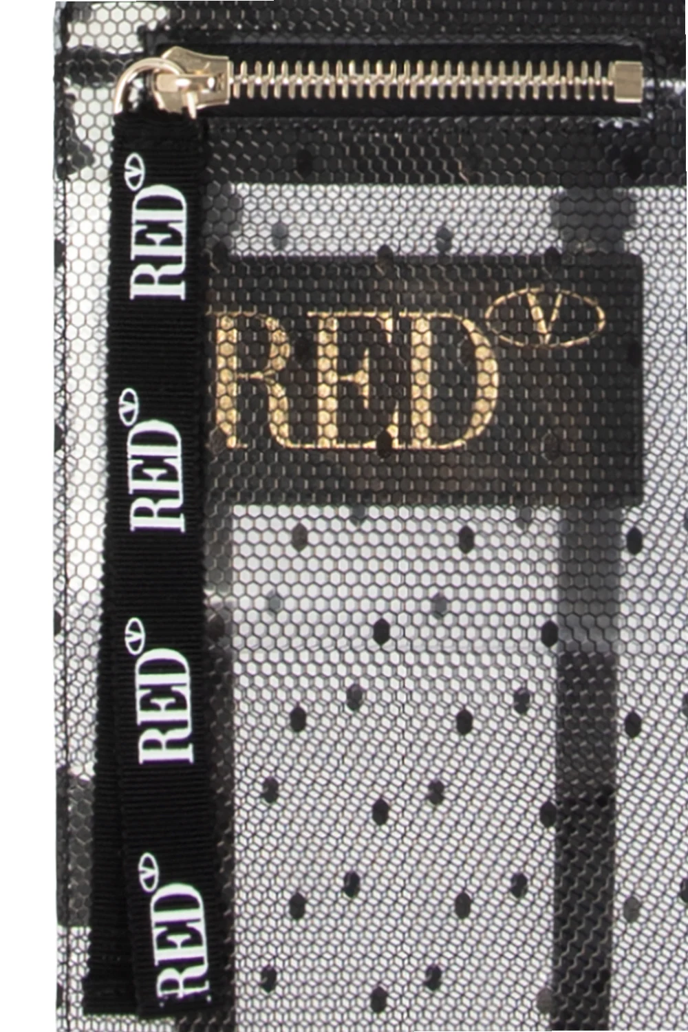 Czarne, transparentne etui na telefon Red Valentino. Zamykane na zamek. Ozdobione wzorem z logo w kolorze złotym. Pas na ramię.