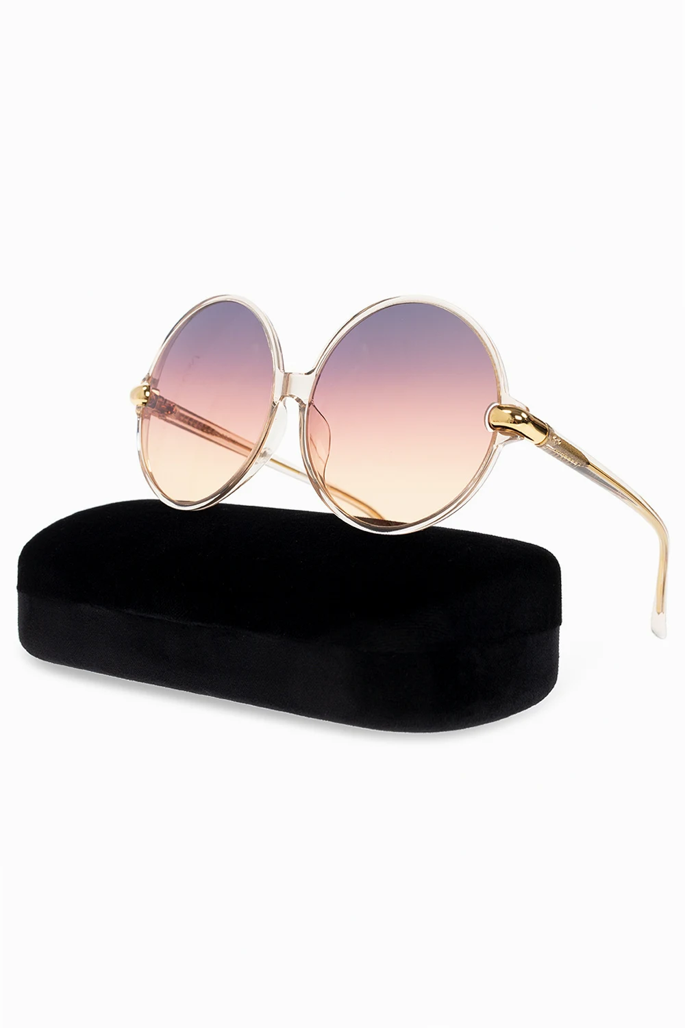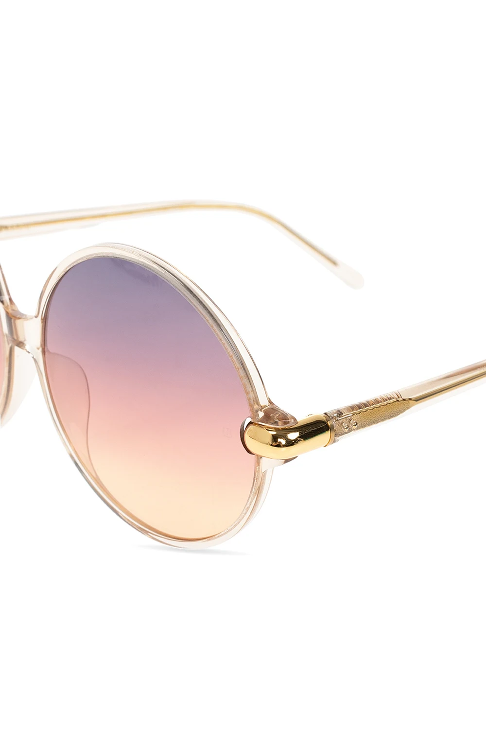 Kremowe, transparentne okulary przeciwsłoneczne Linda Farrow. Brązowo-pomarańczowe, gradientowe, certyfikowane szkła 100% UVA i UVB. Metalowe elementy w kolorze złotym. Dołączone etui.