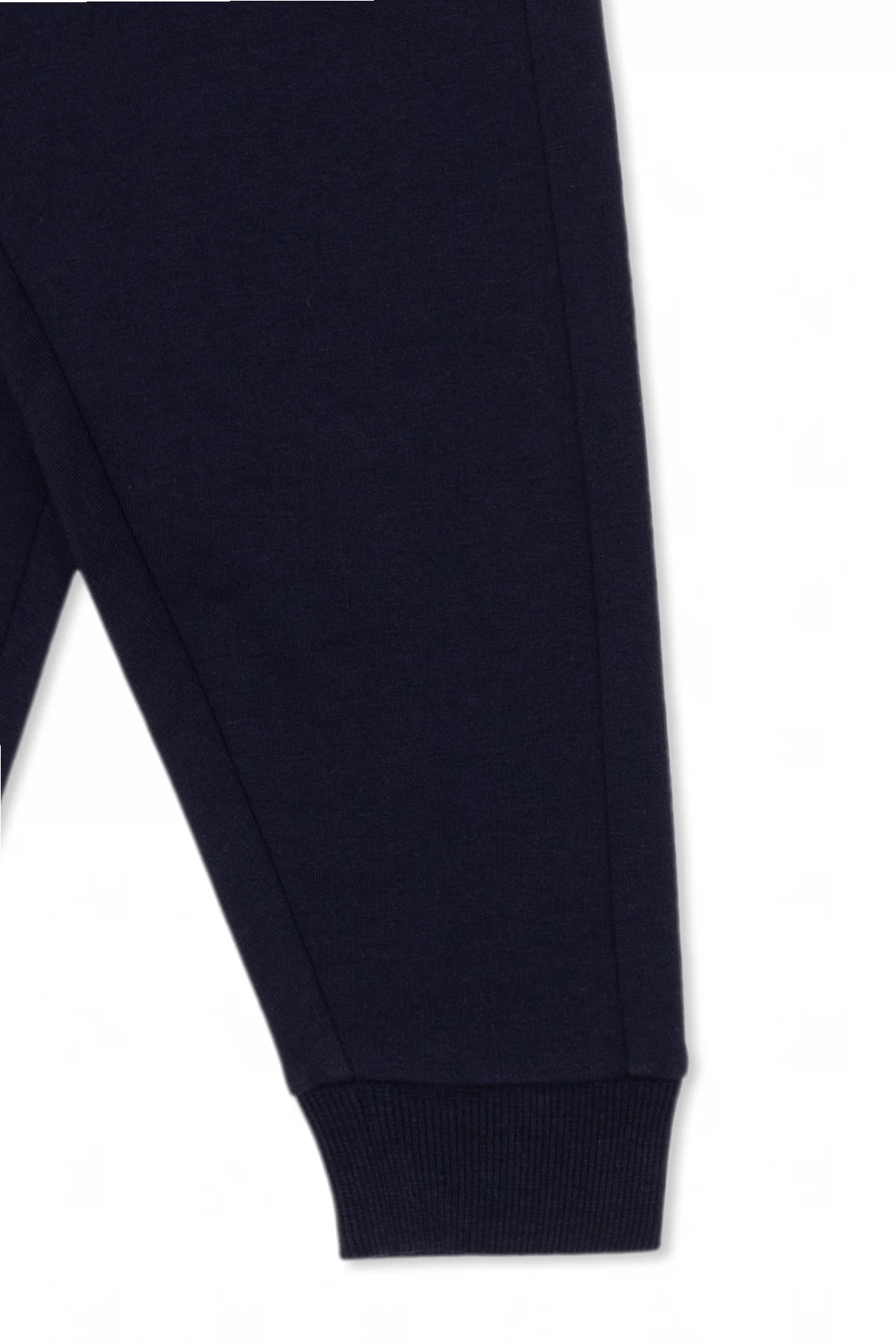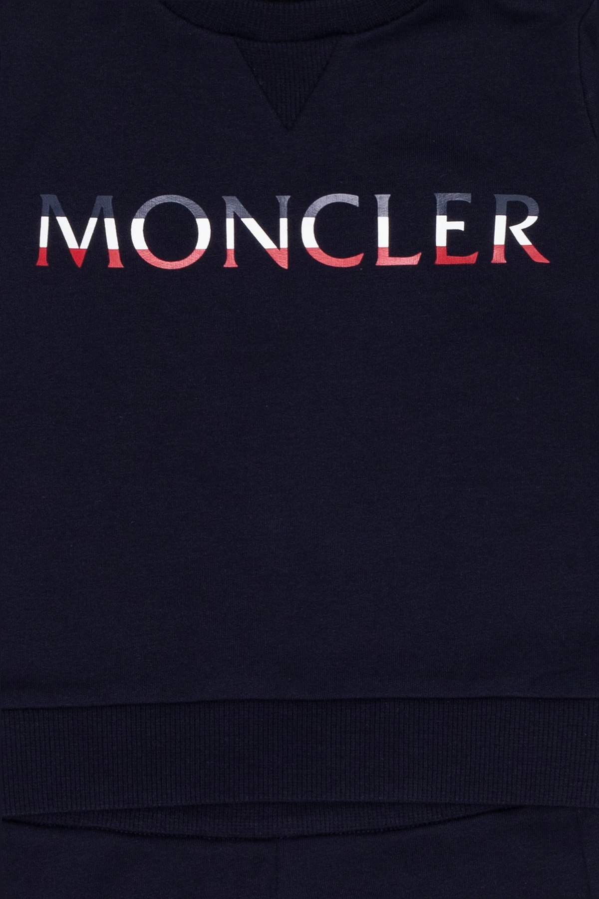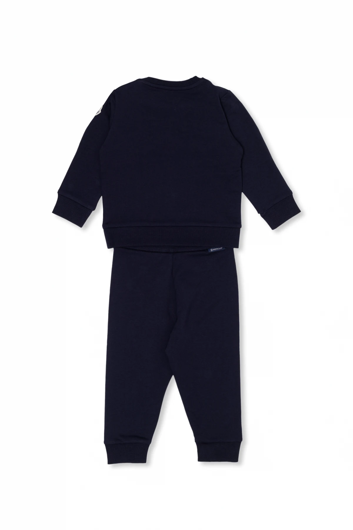 Komplet: granatowa bluza i spodnie dresowe Moncler Enfant. Wykonane z bawełny. Bluza ozdobiona nadrukiem. Okrągły dekolt z zapięciem na zatrzaski. Długie rękawy oraz dół wykończone ściągaczem. Spodnie z gumą wszytą w pasie. Długie nogawki zakończone ściągaczami.
