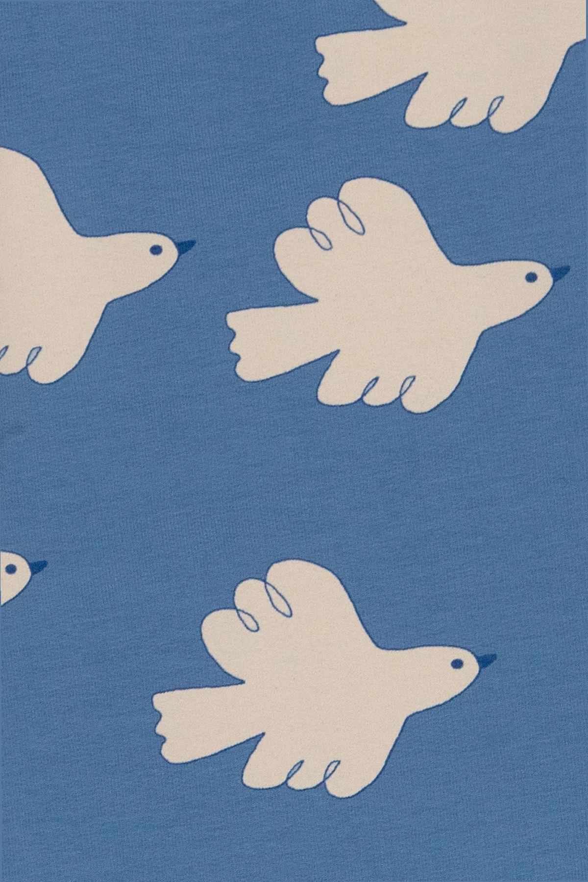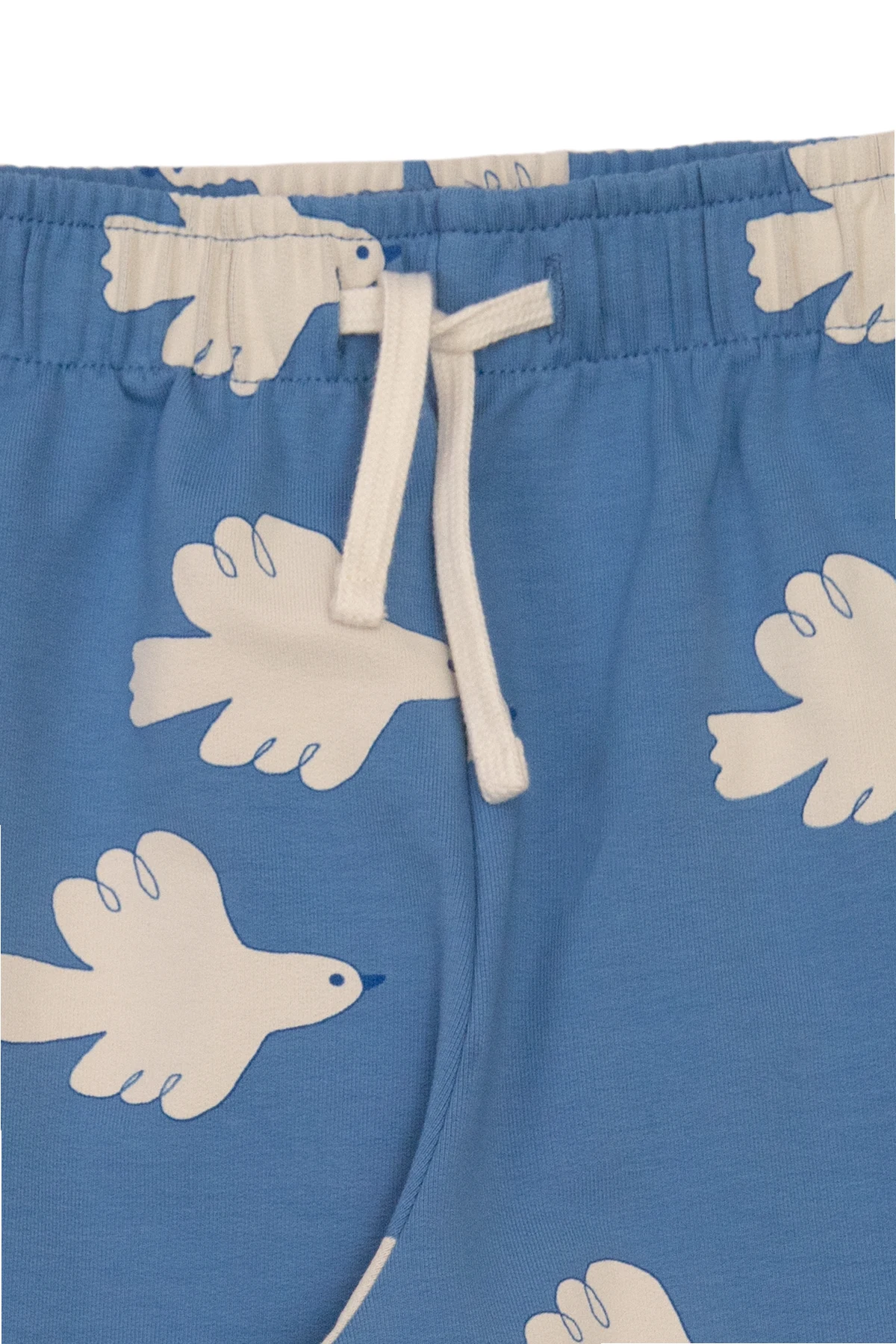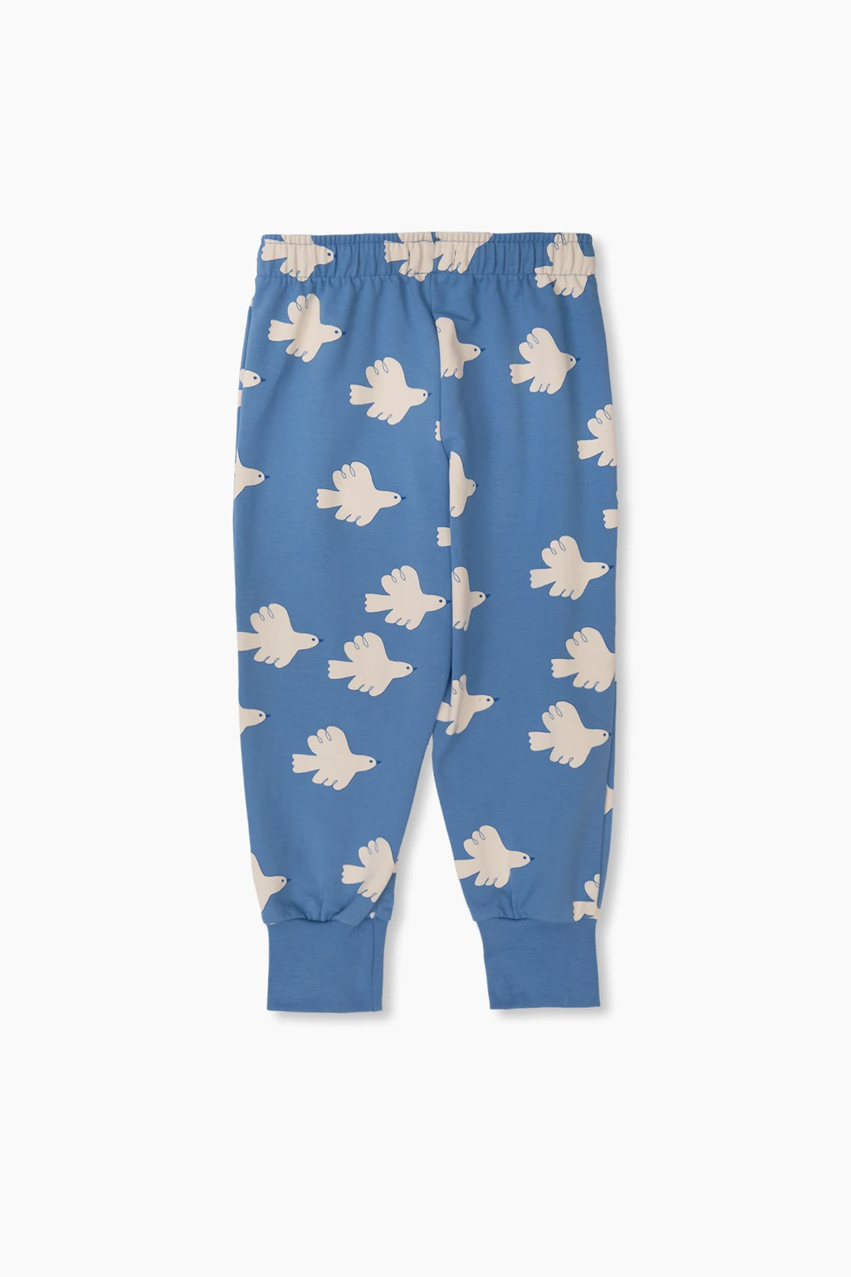 Niebieskie spodnie dresowe Tiny Cottons. Wykonane z bawełny Pima. W pasie wszyta guma ściągana trokami. Ozdobione białym wzorem z motywem gołębi. Długie nogawki zakończone ściągaczem.