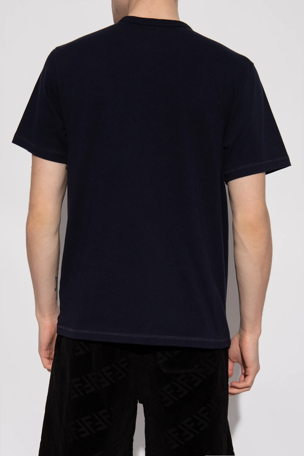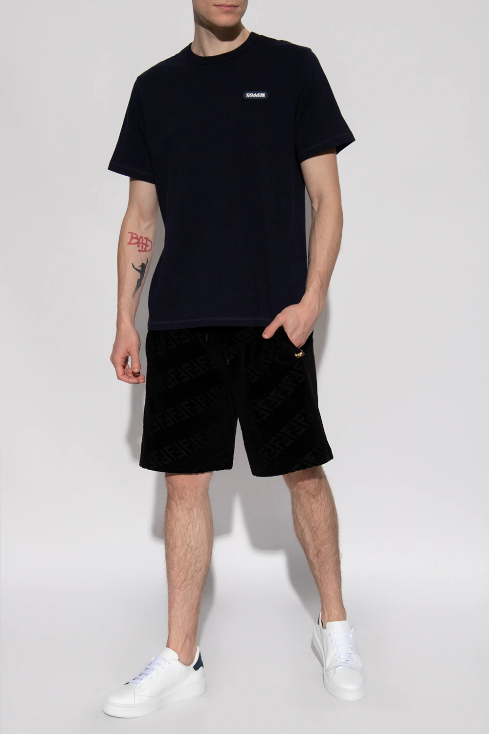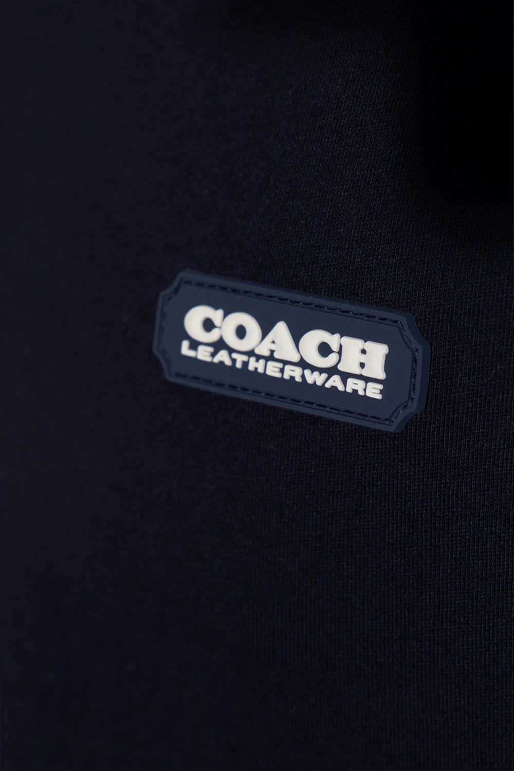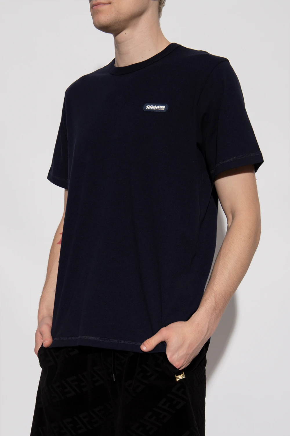 Granatowy, bawełniany t-shirt Coach. Z przodu ozdobiony aplikacją z logo. Okrągły dekolt. Krótkie rękawy.
