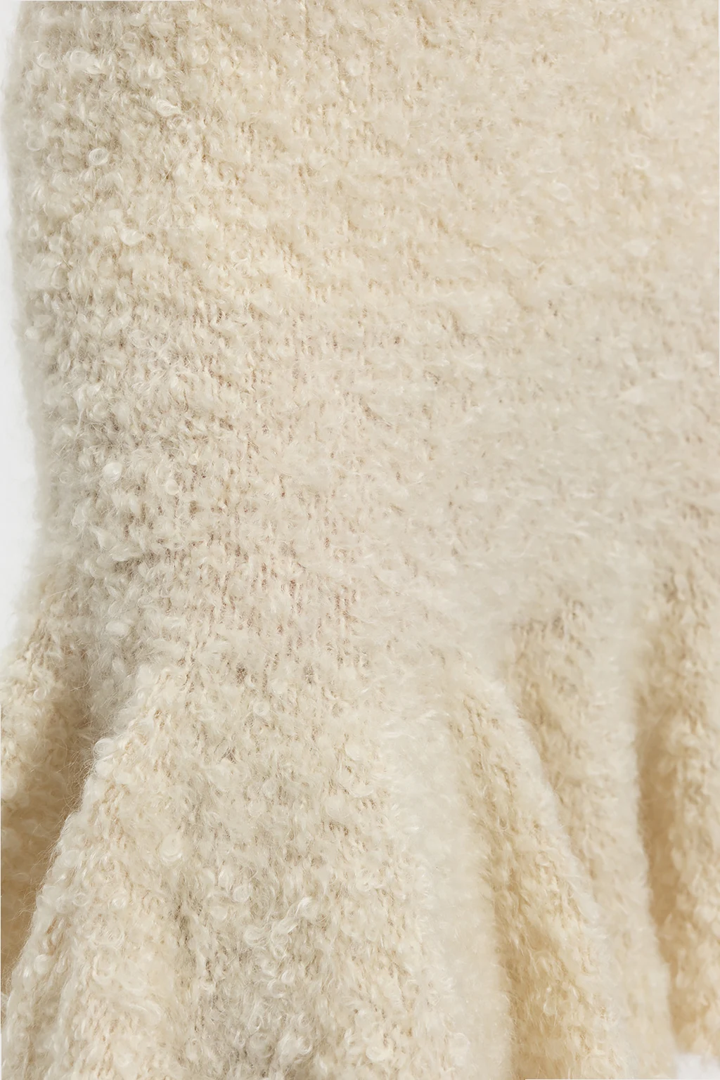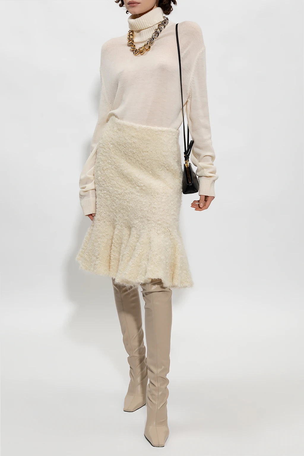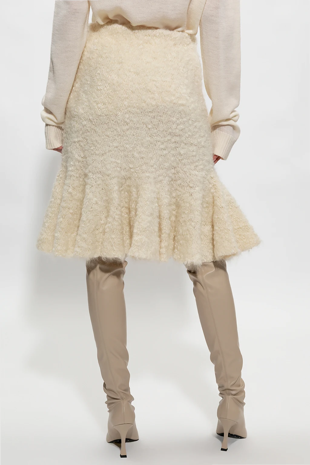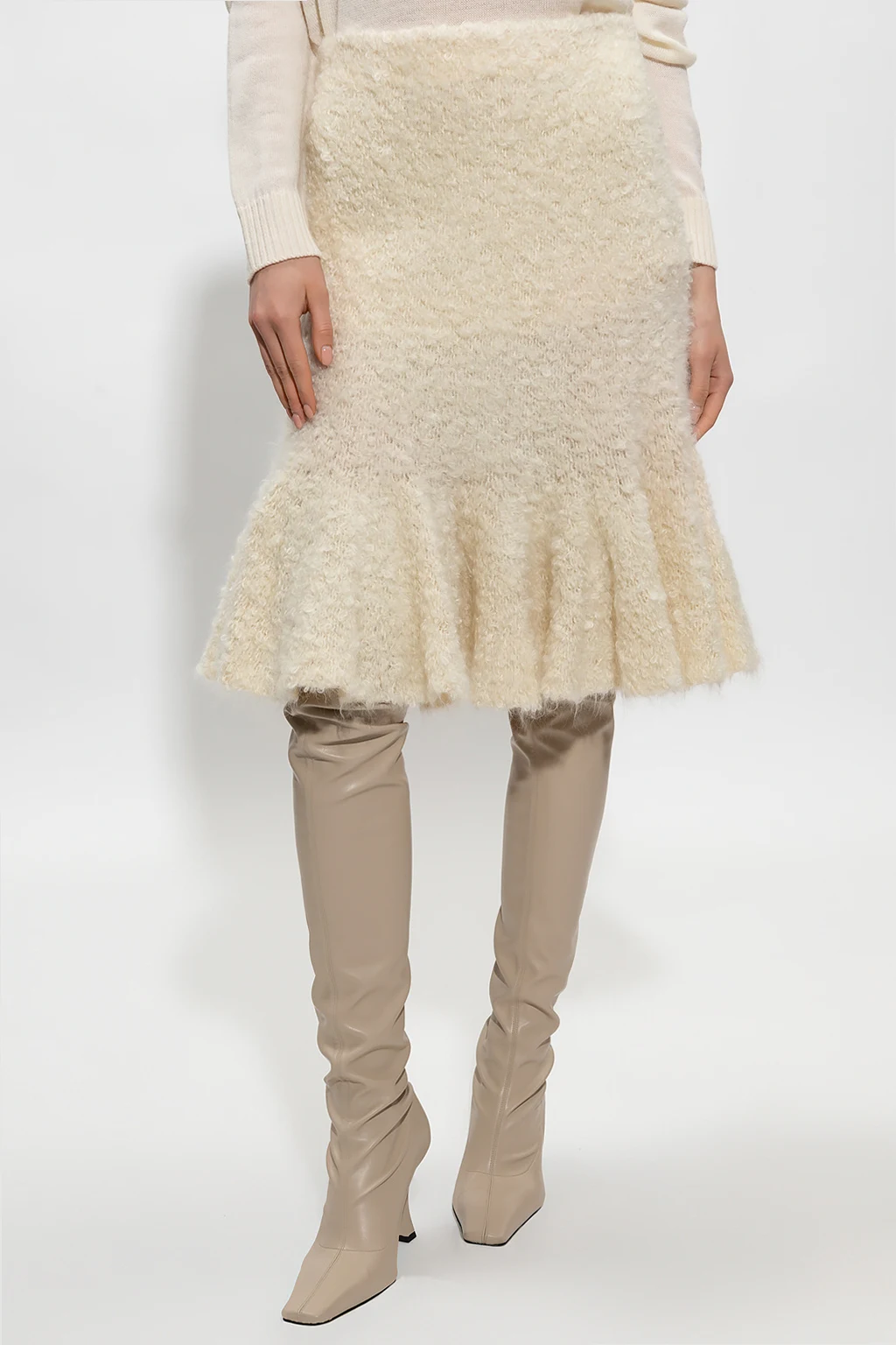 Kremowa spódnica Jil Sander. Wykonana z mieszanki moheru. Z boku zapinana na kryty zamek. Dół wykończony falbaną.