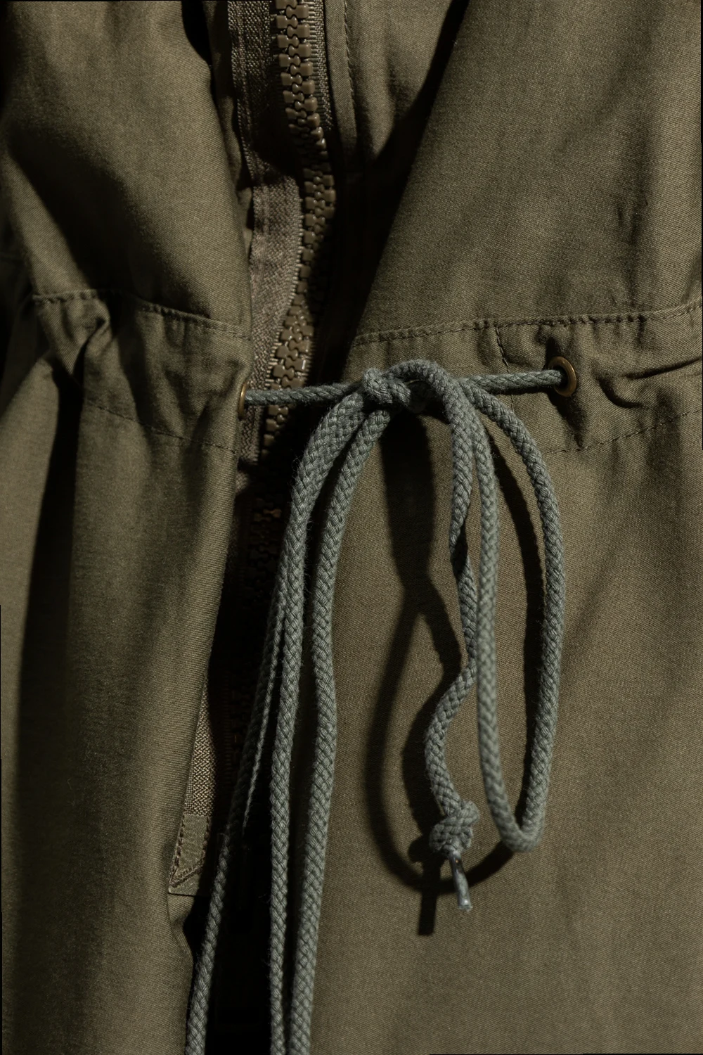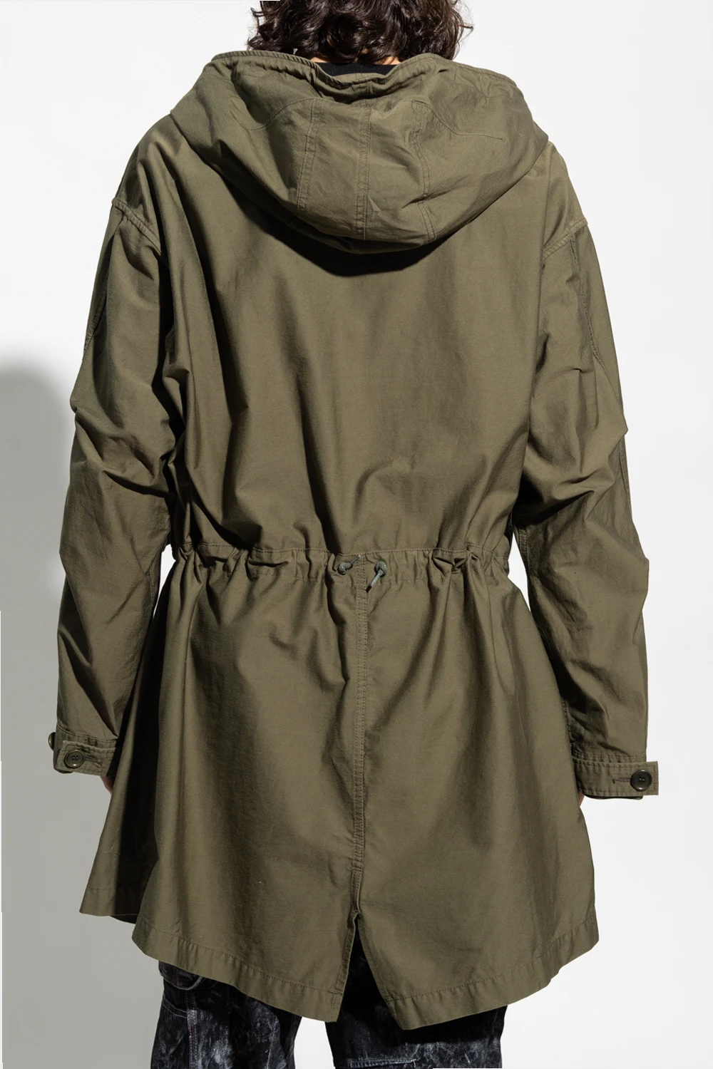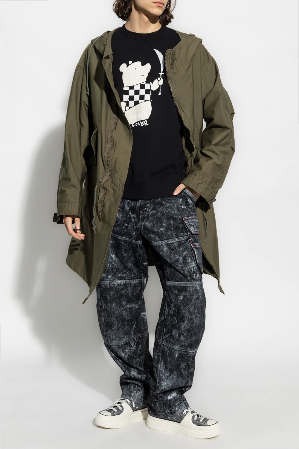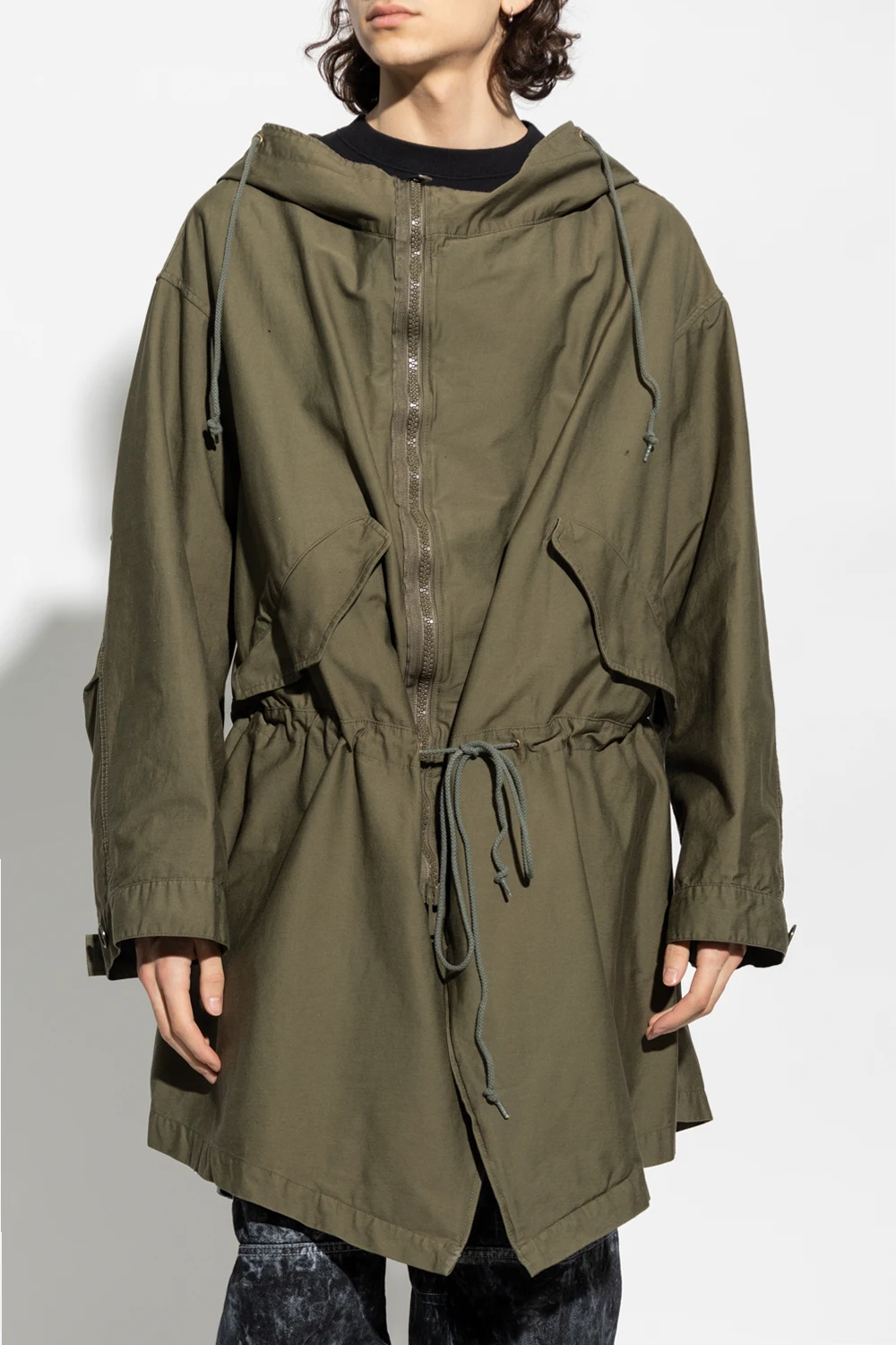 Kurtka w kolorze khaki typu 'oversize' Undercover. Wykonana z mieszanki bawełny. Zapinana na zamek. Kaptur ściągany trokami. Dwie kieszenie z zapięciem na zatrzask. W pasie ściągana trokami. Długie rękawy zakończone zapięciem na guzik. Asymetryczny dół.