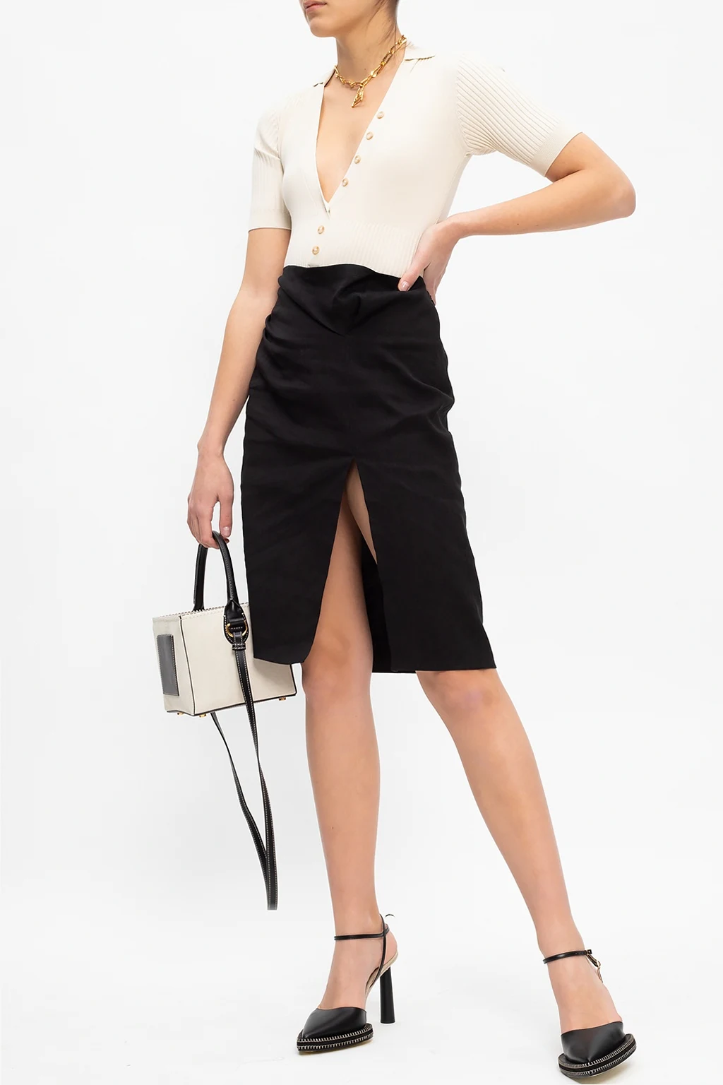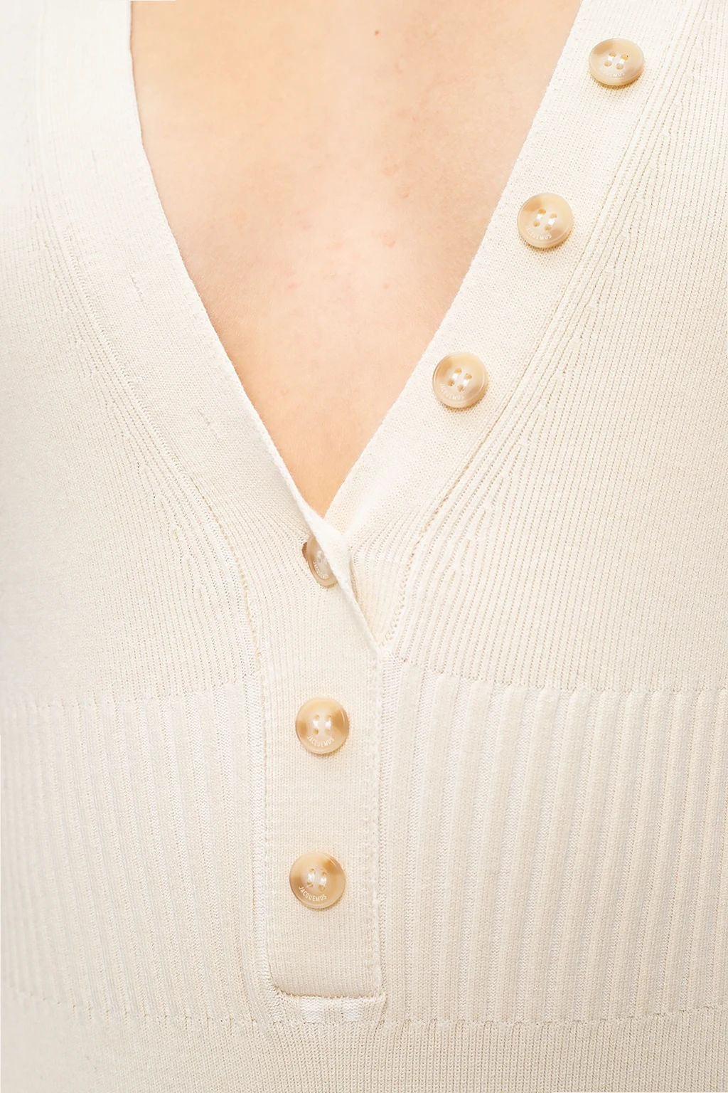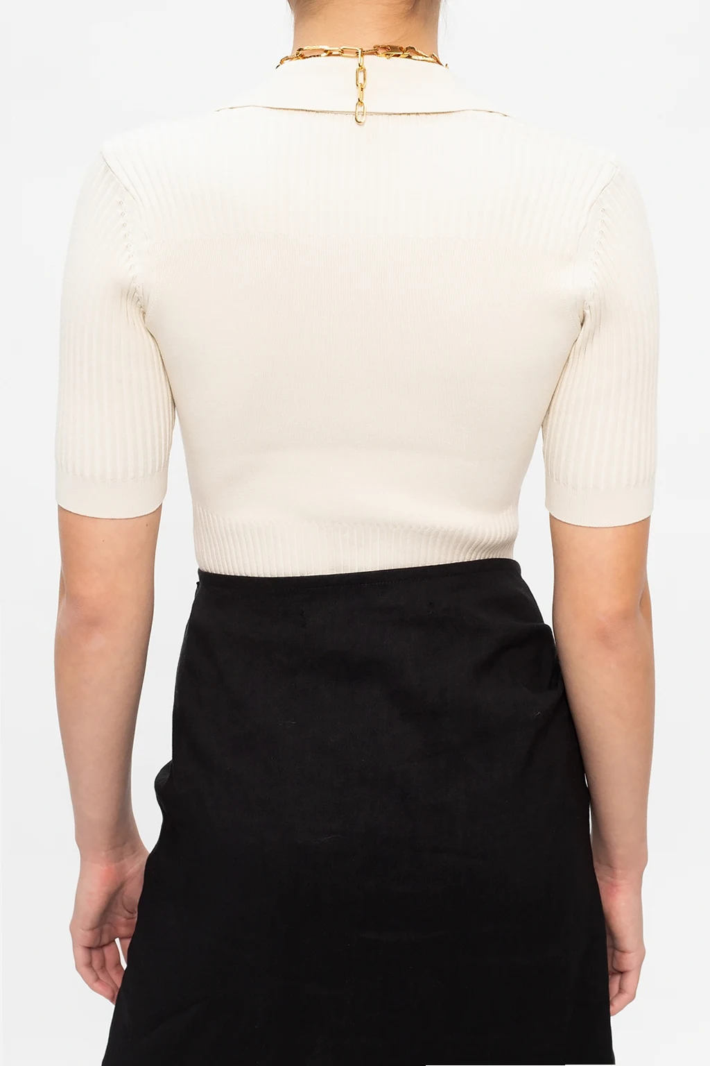Beżowe, prążkowane body, model ‘Le Body Yauco’ Jacquemus. Zapinane na guziki. Krótki rękaw.