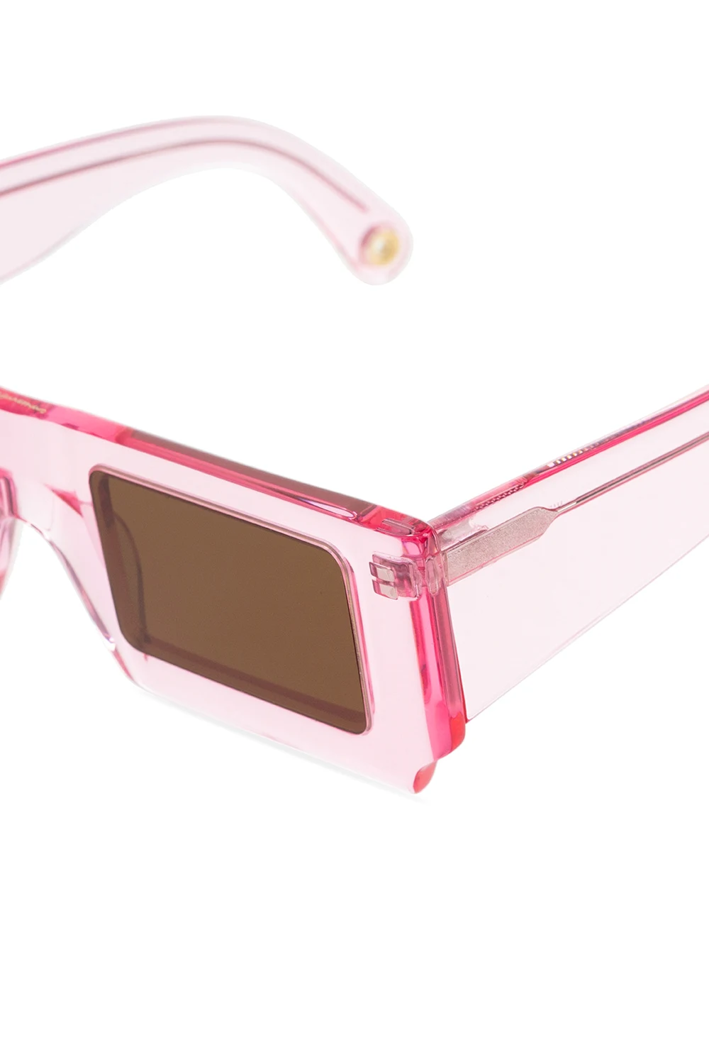 Jasnoróżowe, transparentne okulary, model ‘Le Soleil’ Jacquemus. U góry logo w kolorze srebrnym. Soczewki w kolorze brązowym.