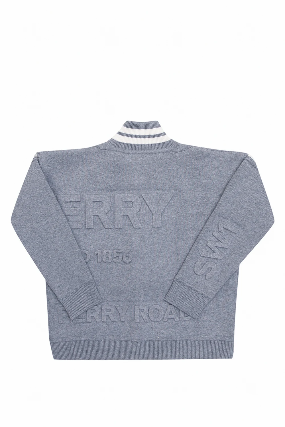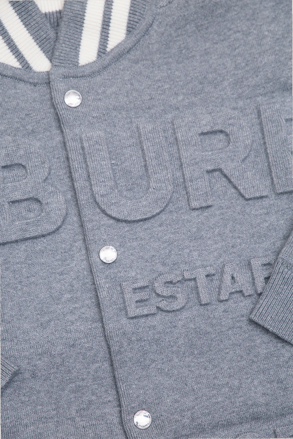 Szaro-biała bluza typu ‘bomber’ Burberry Kids. Zapinana na zatrzaski. Ozdobiona wypukłym logo na przodzie, tyle oraz rękawach. Ozdobne biało-szare ściągacze. Długie rękawy.