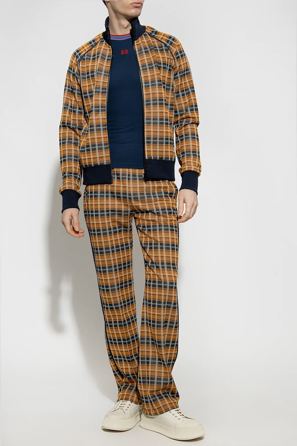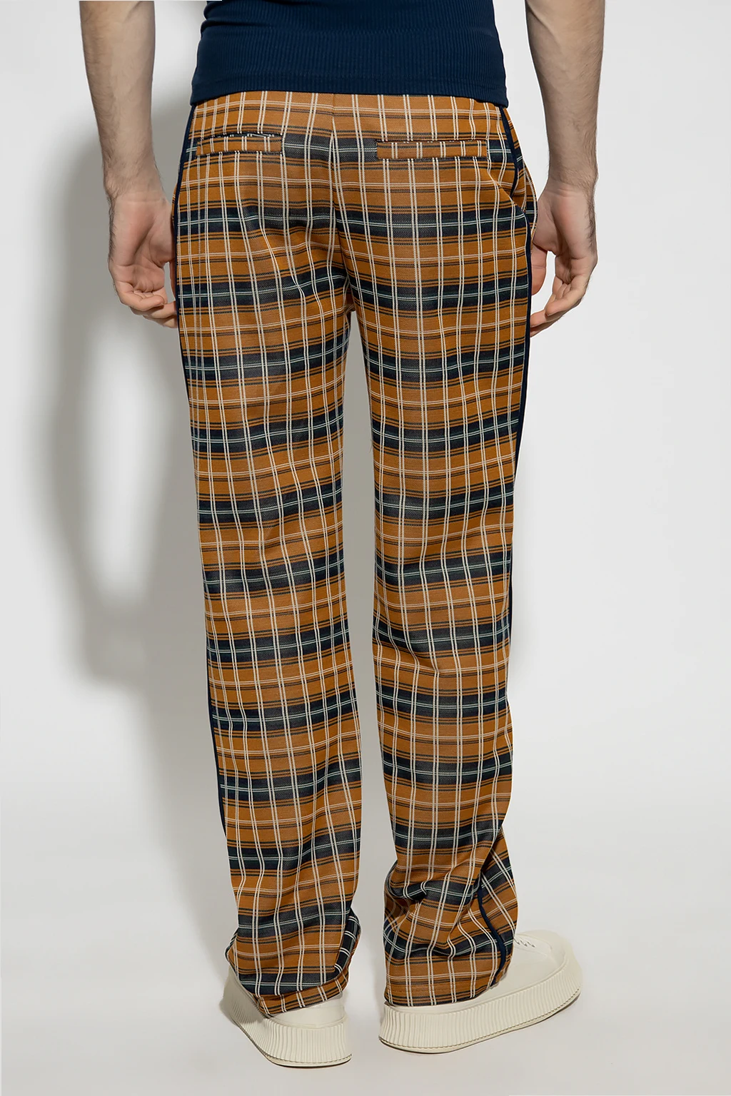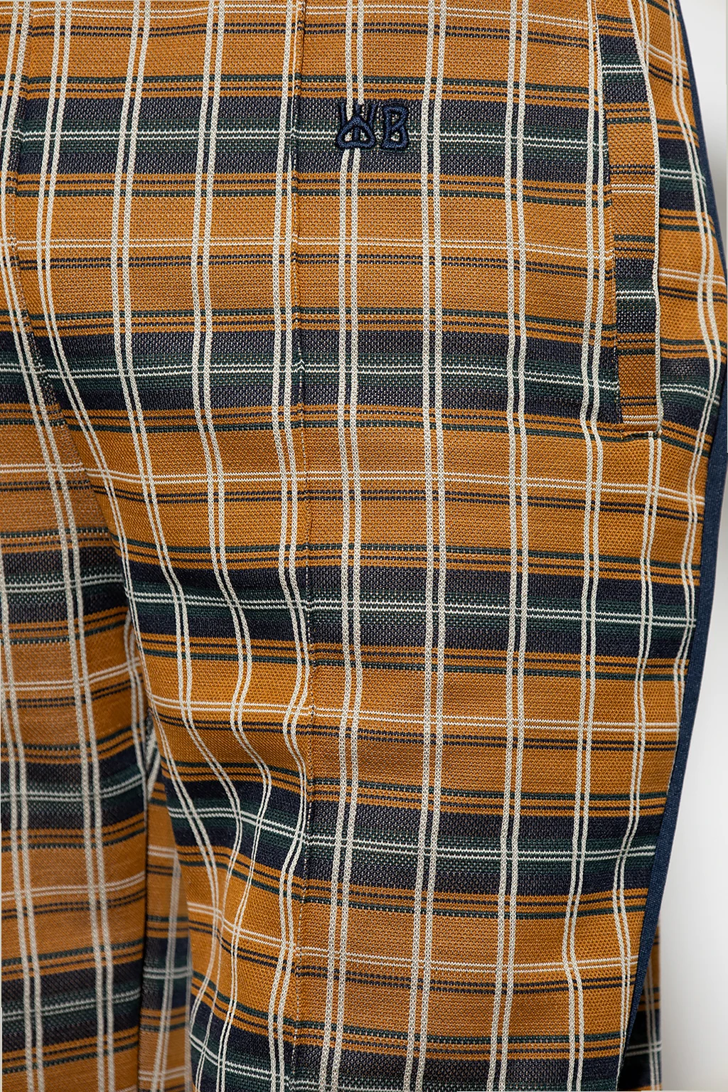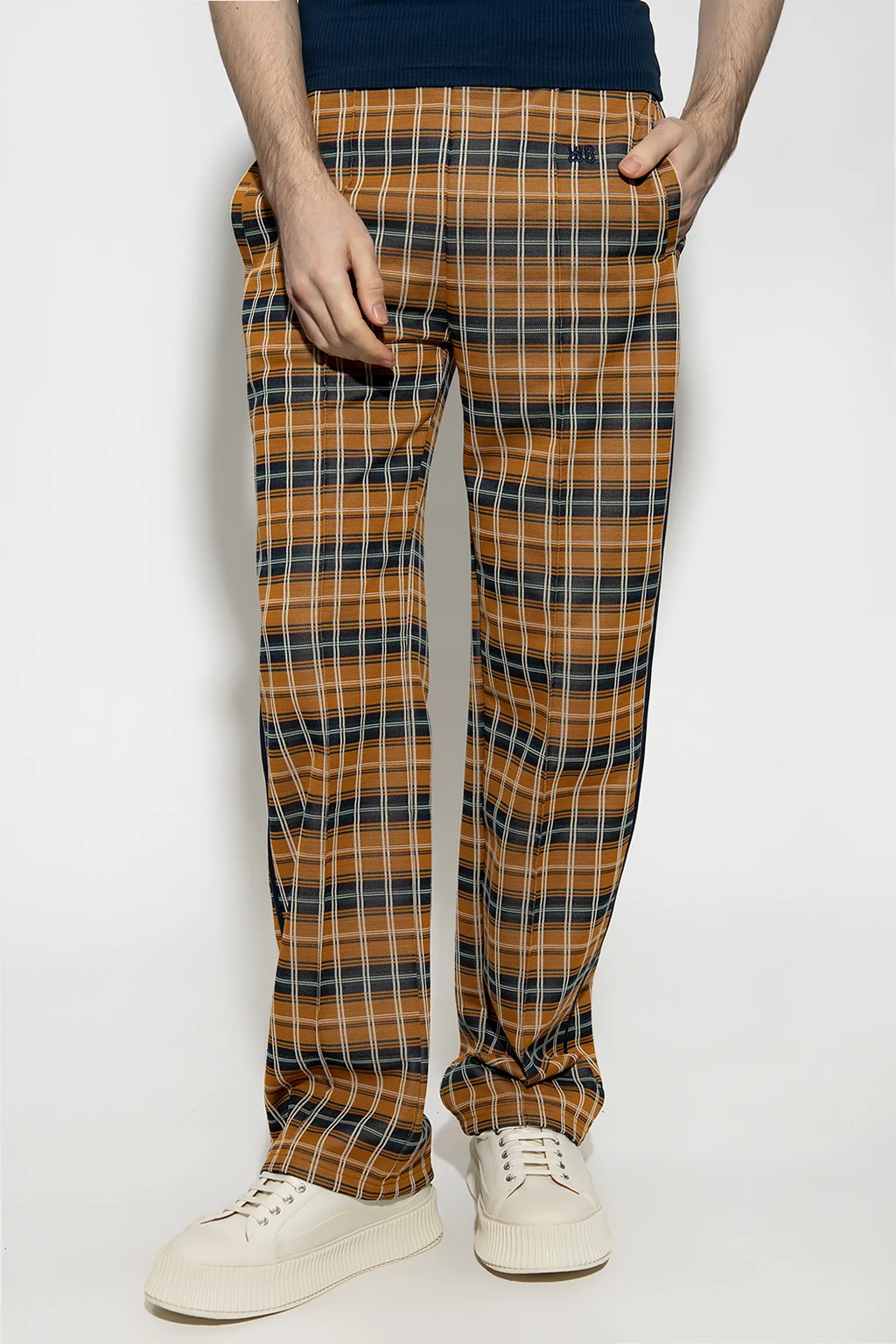 Brązowe spodnie, model ‘Samuel’ Wales Bonner. Wykonane z materiału z recyklingu i bawełny. W pasie wszyta guma ściągana trokami. Ozdobiona granatowo-zielono-białym wzorem w kratę. Cztery wsuwane kieszenie: dwie z przodu i dwie z tyłu. Po bokach lamówka, z przodu przeszycie. Długie nogawki o prostym kroju.