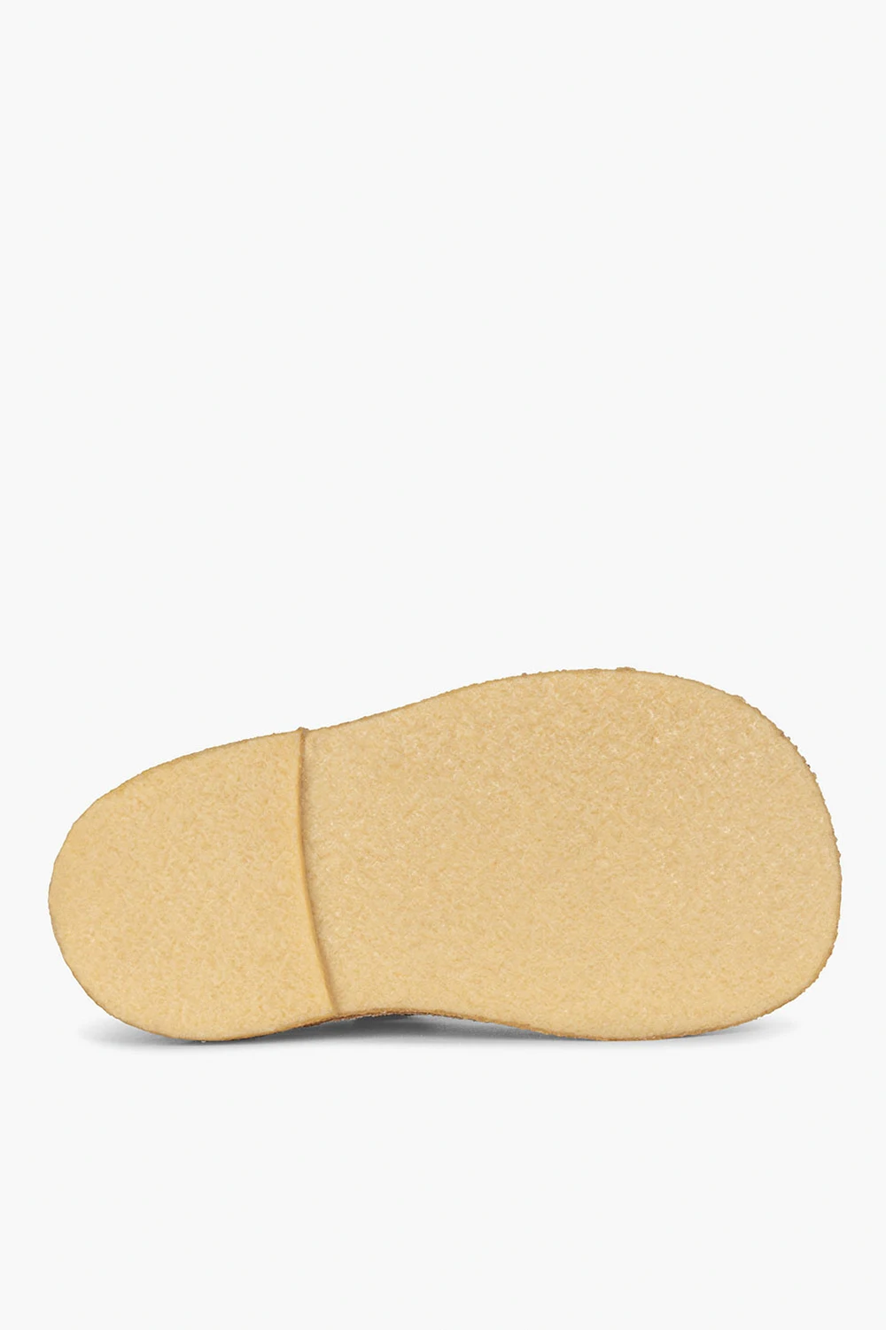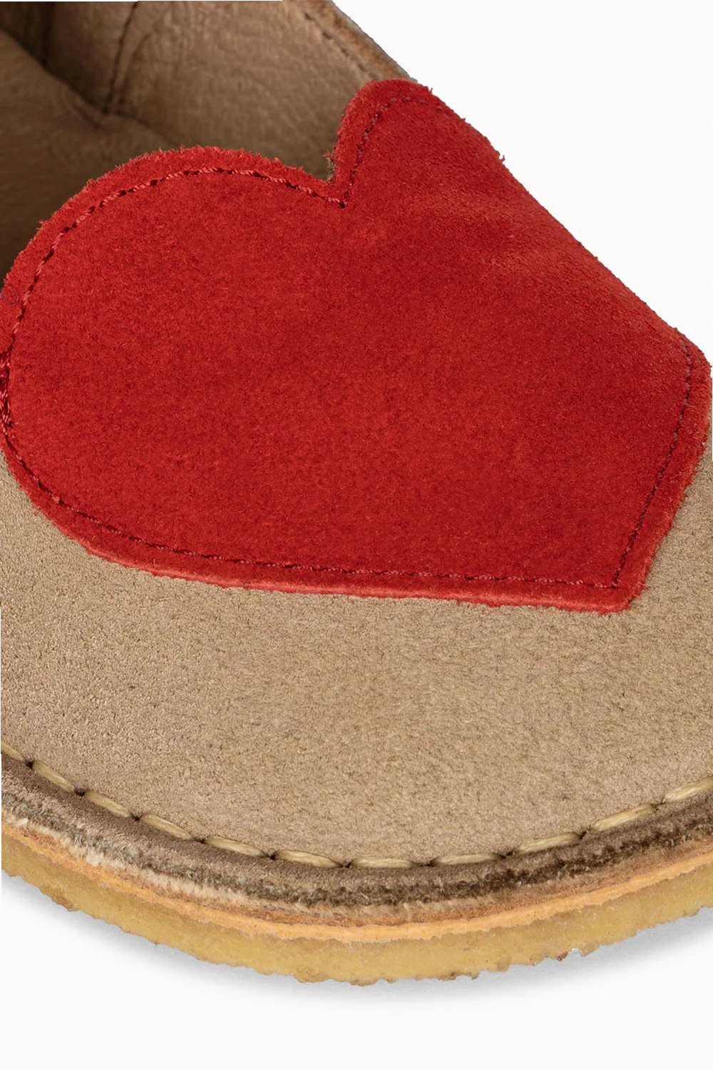 Czerwono-granatowo-brązowe buty, model ‘Minnie’ Konges Slojd. Wykonane z zamszu. Zapinane na rzep. Z przodu ozdobione naszytym motywem serca. Wyściełana, wyjmowana wkładka. Beżowa, gumowa podeszwa.