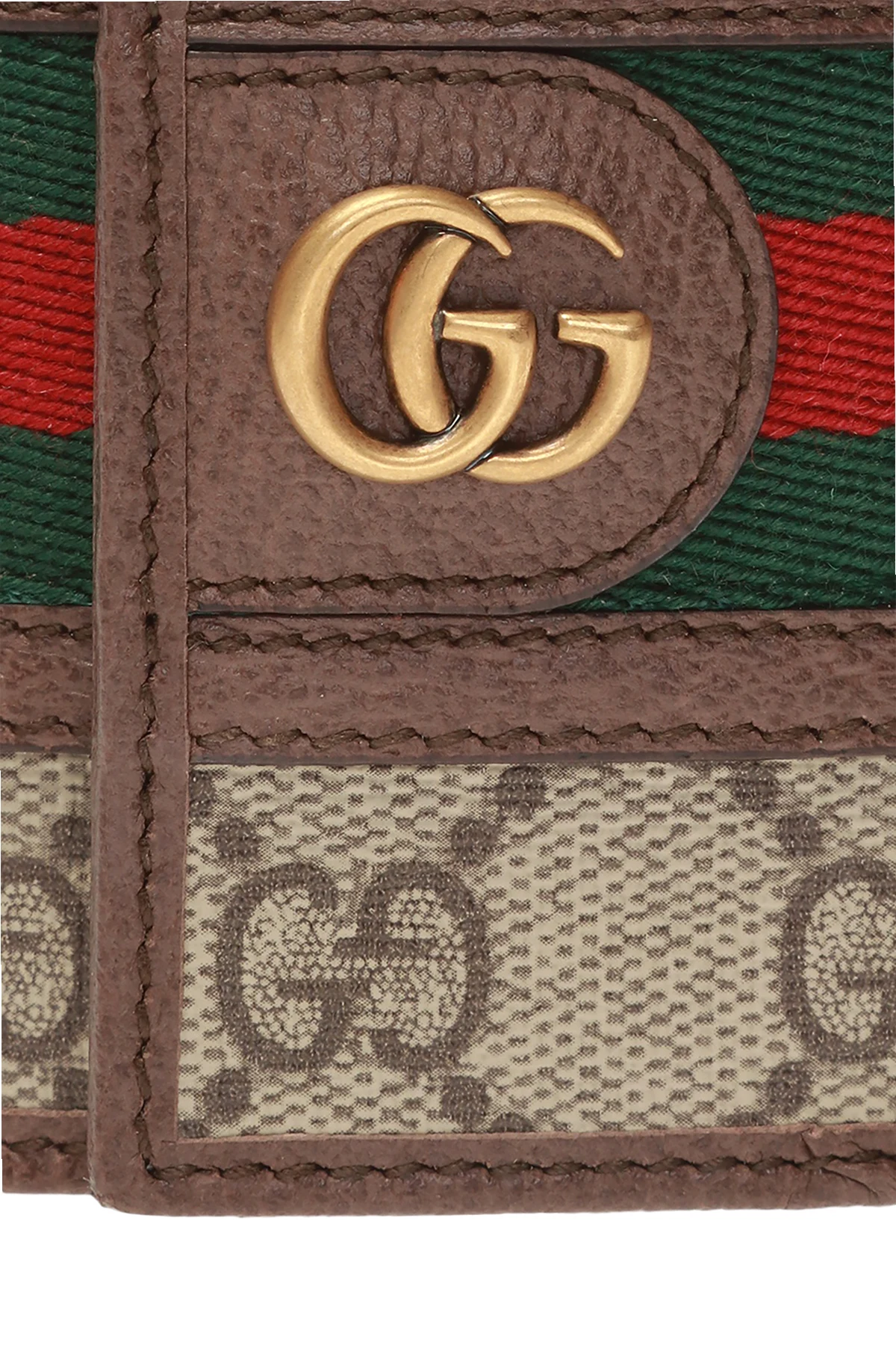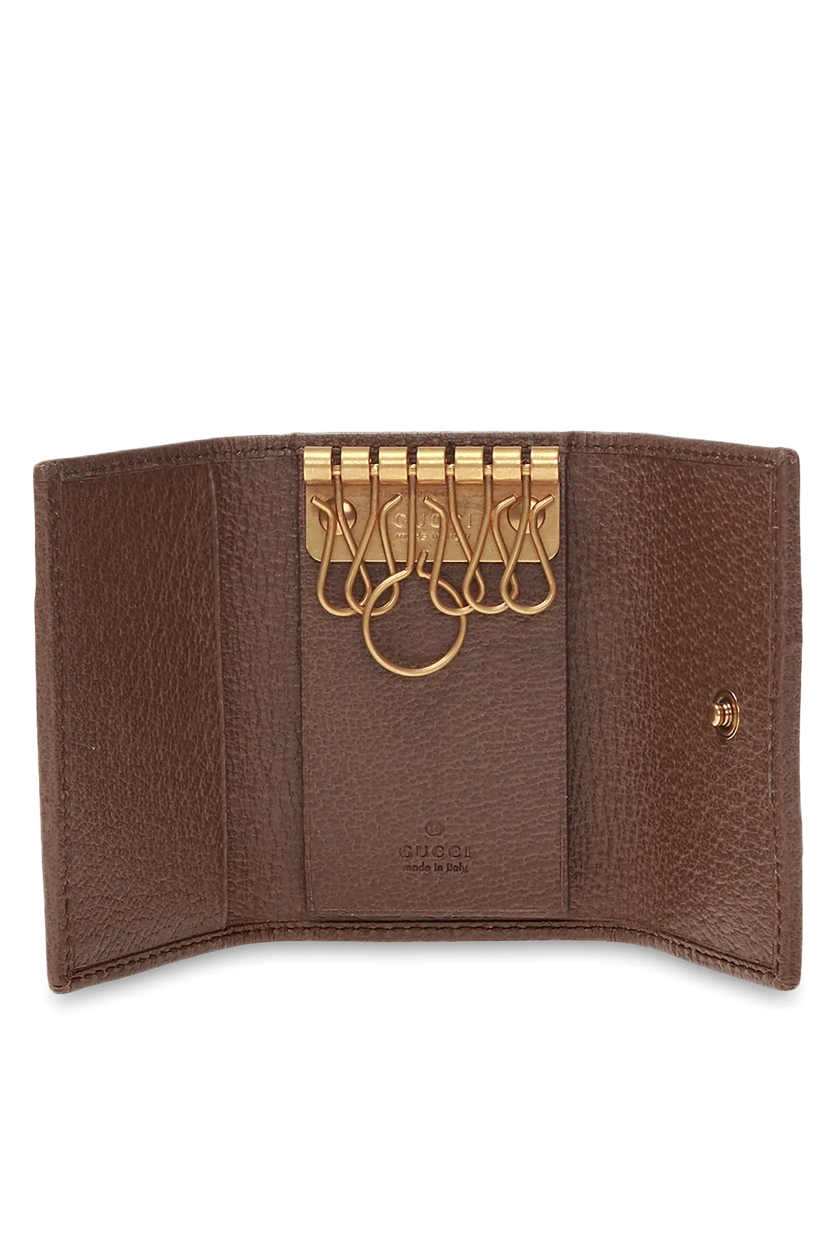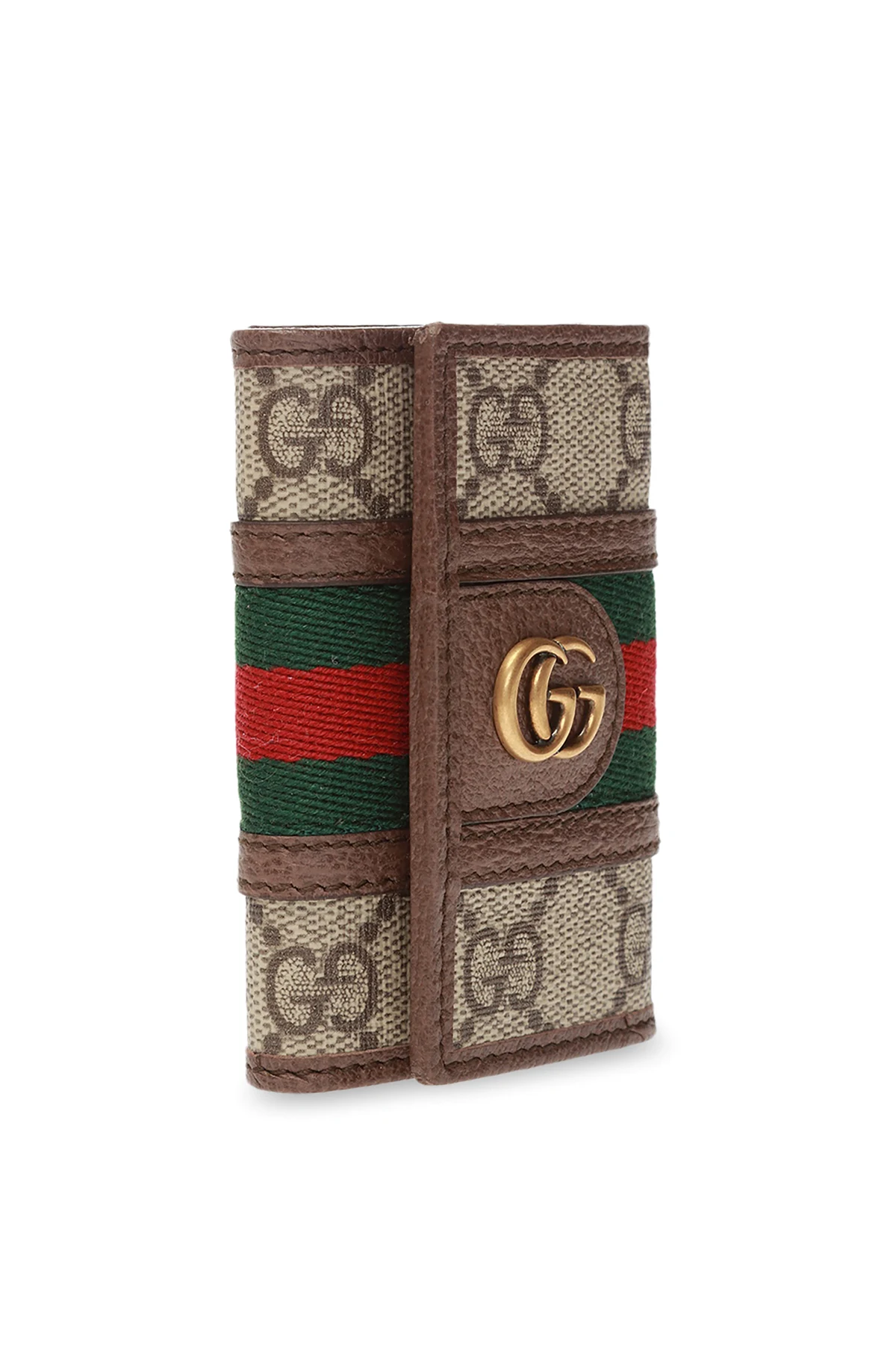Brązowe etui na klucze Gucci. Wykonane z płótna ‘GG Supreme’ oraz skóry. Zamykane na zatrzask. Ozdobione charakterystycznym dla marki motywem paska ‘Web’ w kolorze zielono-czerwono-zielonym oraz metalowym logo w kolorze postarzanego złota. Sześć zawieszek na klucze oraz jedno miejsce na kartę.