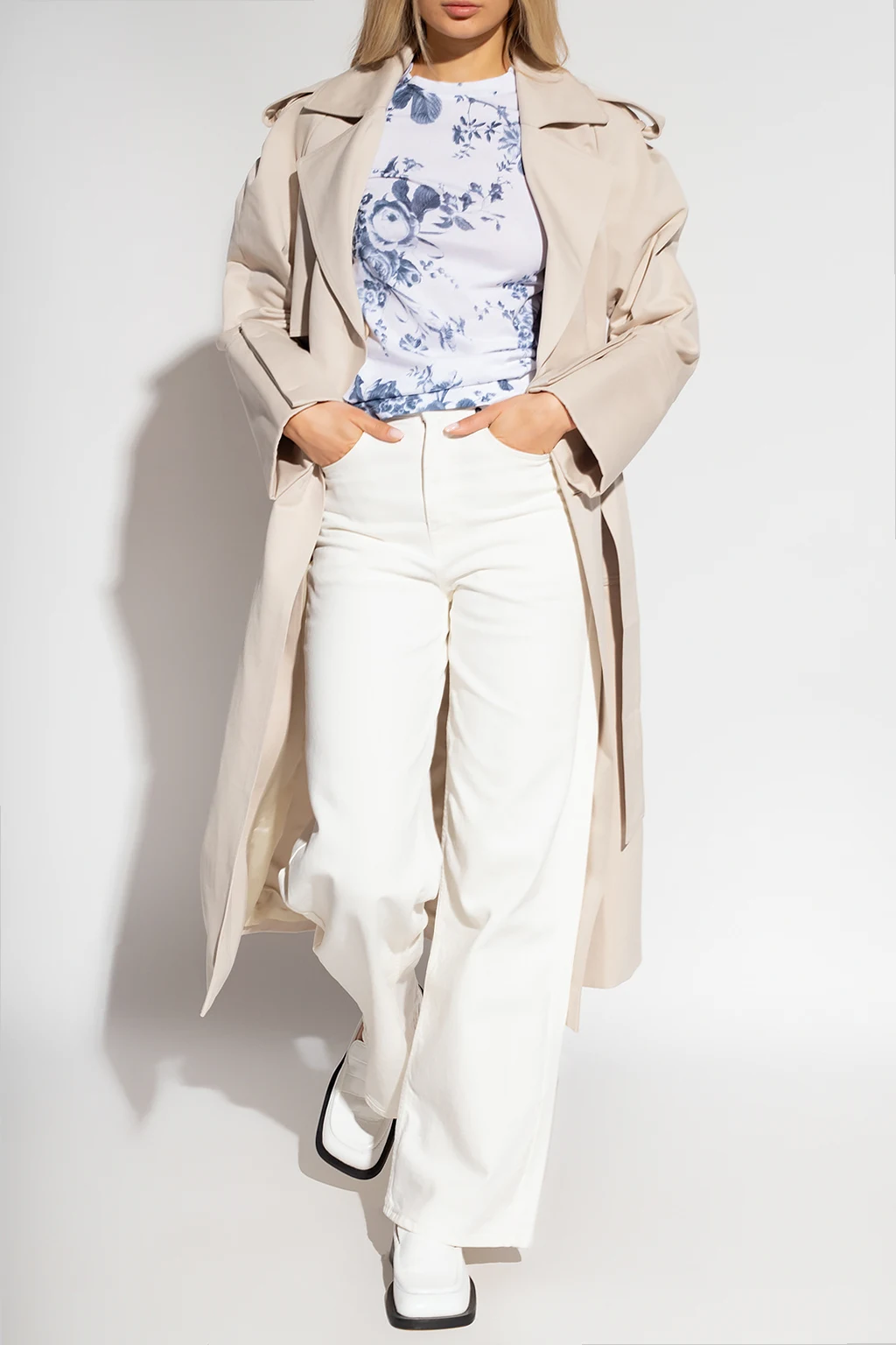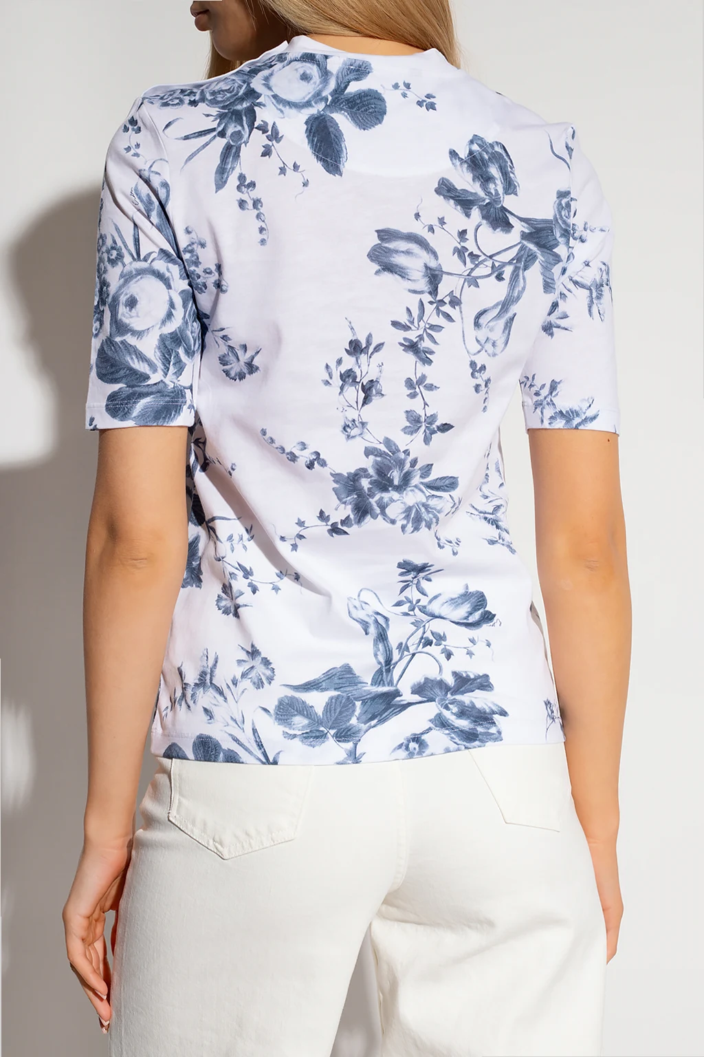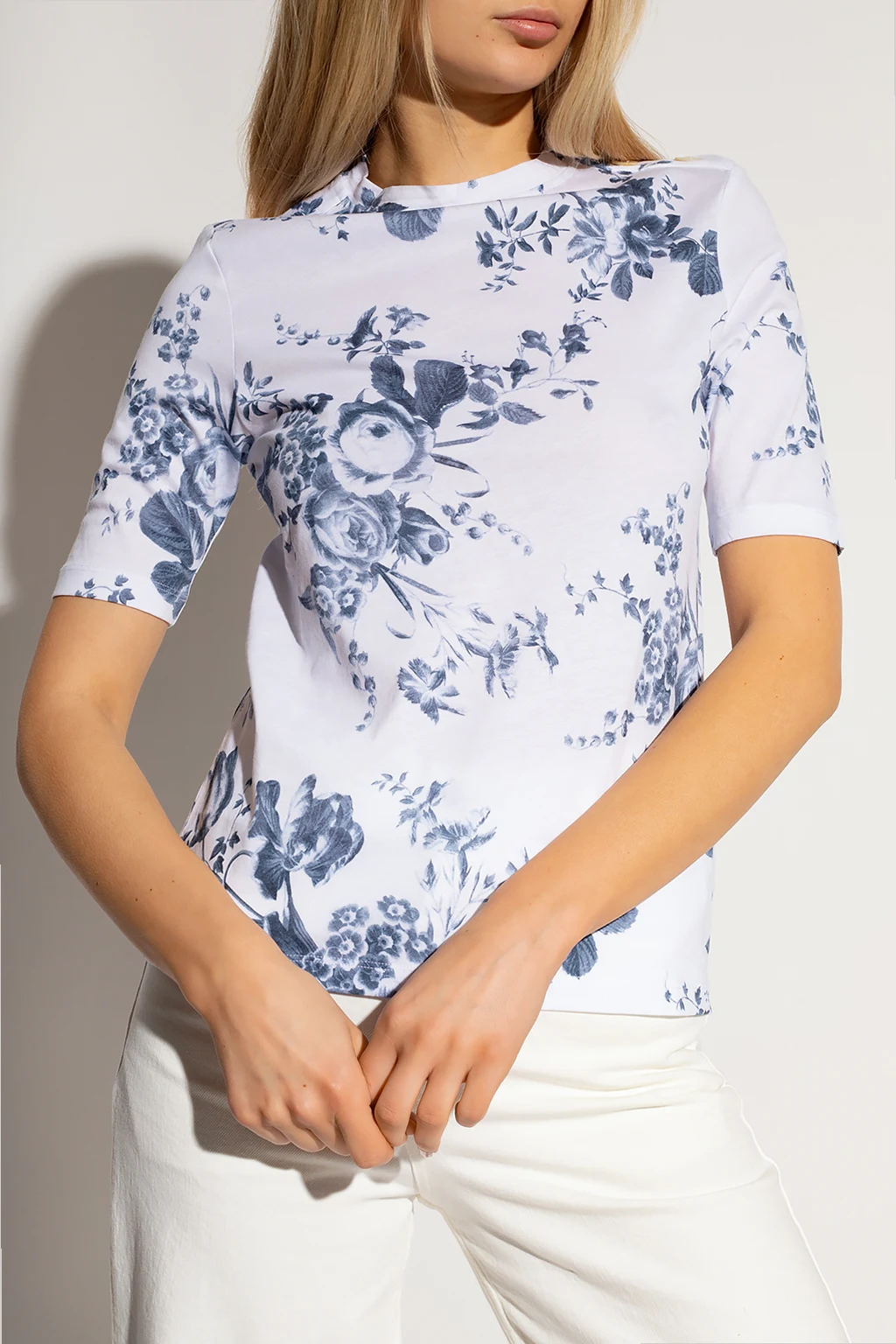 Biało-niebieski, bawełniany t-shirt, model ‘Sophia’ Erdem. Przy okrągłym dekolcie ozdobna patka z guzikami. Ozdobiony nadrukiem z motywem kwiatowym ‘Constance Bouquet’, oddającym hołd florystce Constance Spry. Lekko dopasowany krój, krótkie rękawy.