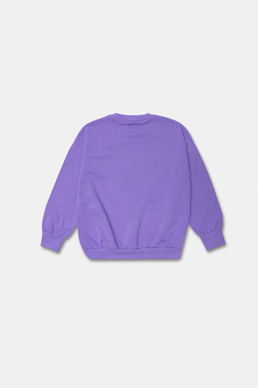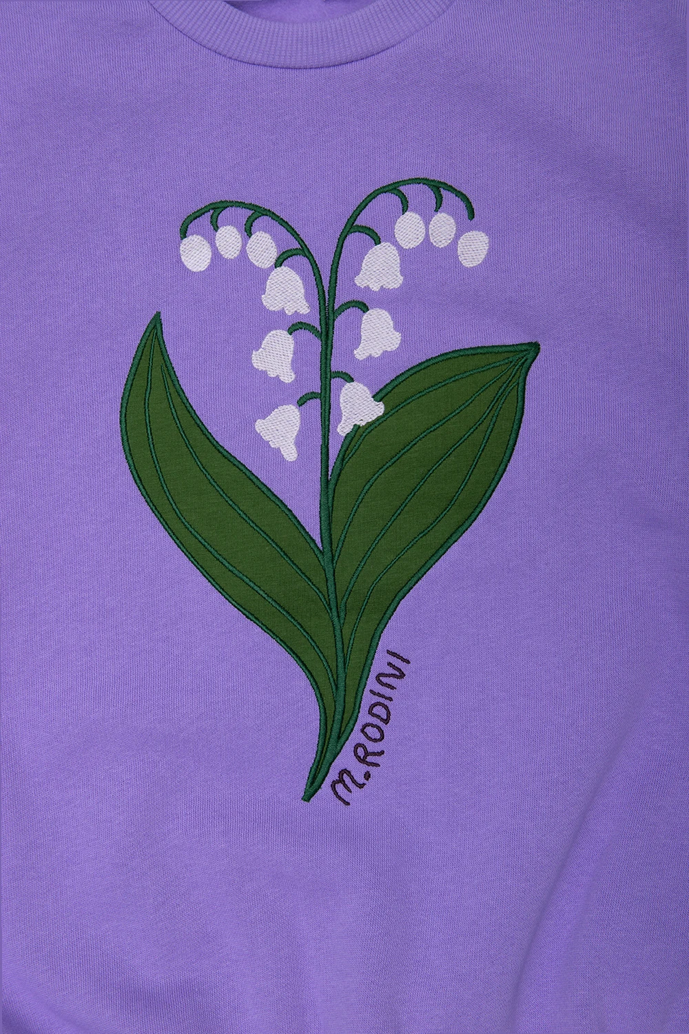 Fioletowa bluza o luźnym kroju Mini Rodini. Wykonana w 100% z bawełny organicznej z certyfikatem GOTS. Z przodu ozdobiona kolorowym haftem z motywem kwiatowym i logo. Okrągły dekolt. Długie rękawy i dół bluzy zakończone ściągaczem.