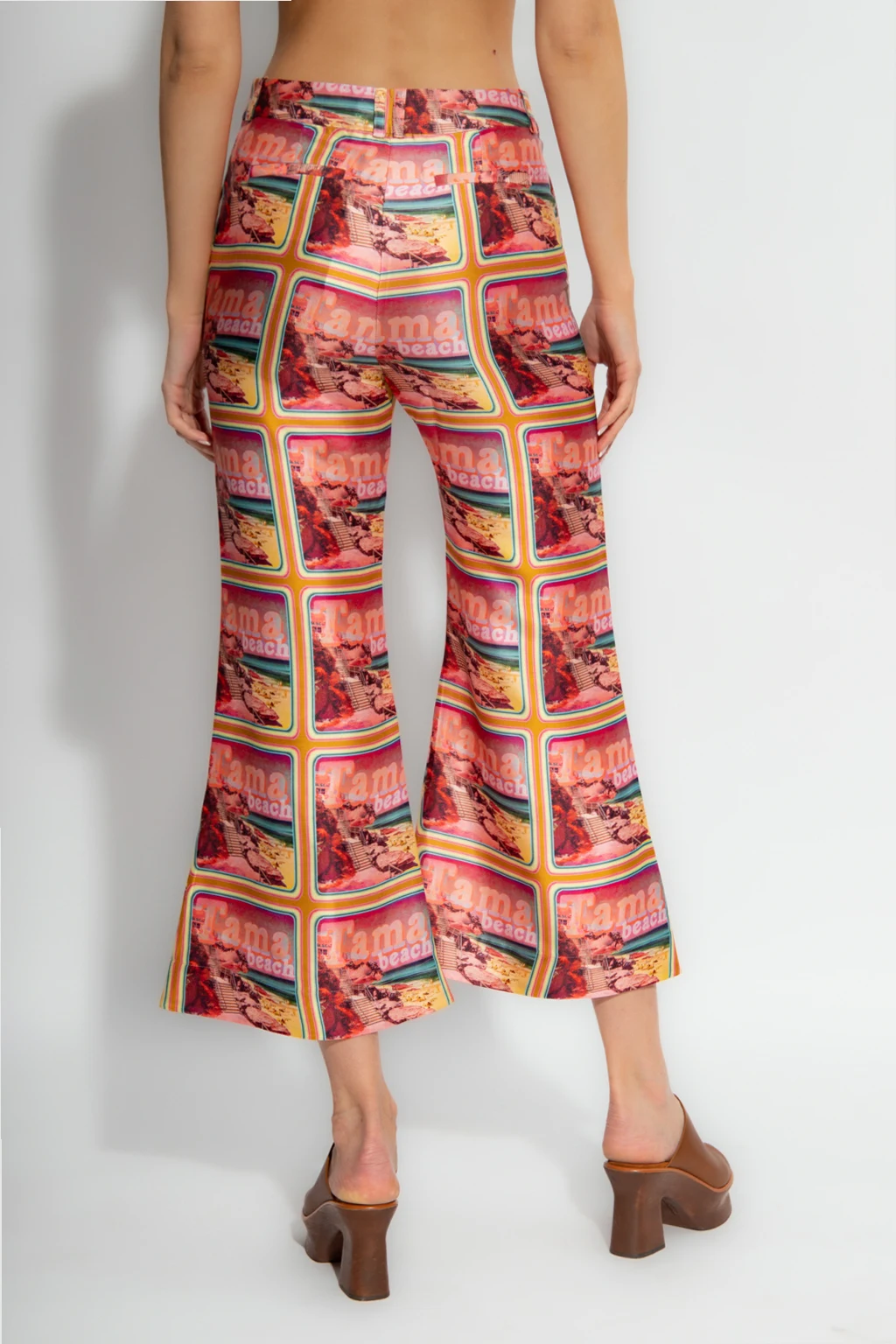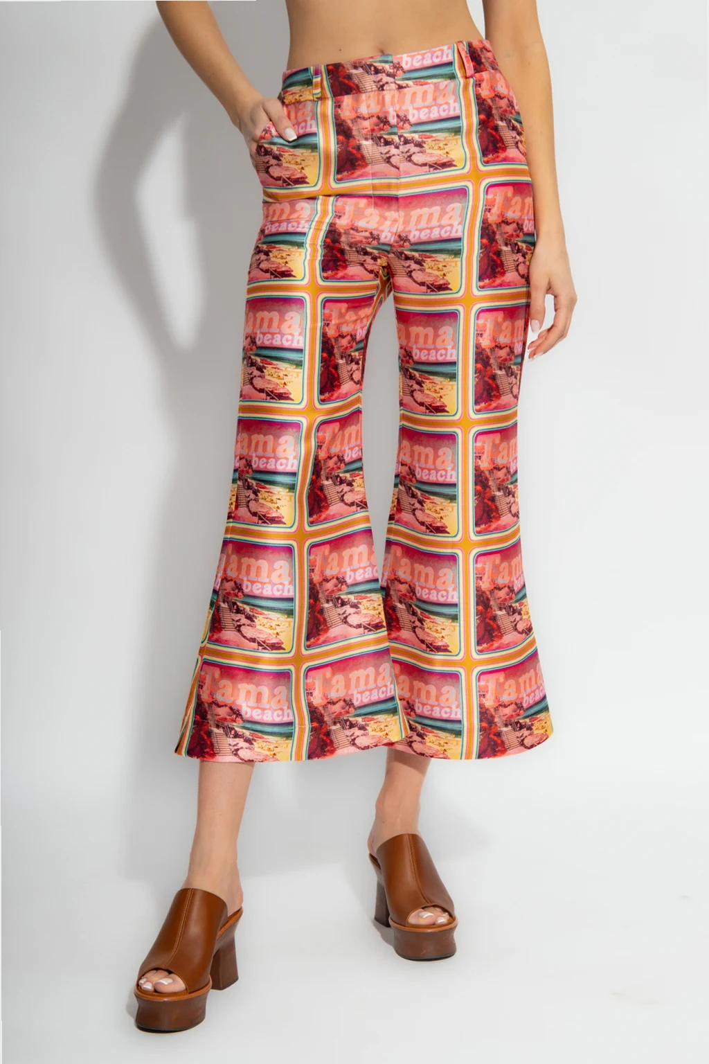 Kolorowe spodnie Zimmermann. Wykonane z jedwabiu. Zapinane na zaczepy, guzik oraz zamek. Ozdobione wzorem. Cztery wsuwane kieszenie. Nogawki o długości przed kostkę rozszerzające się ku dołowi.