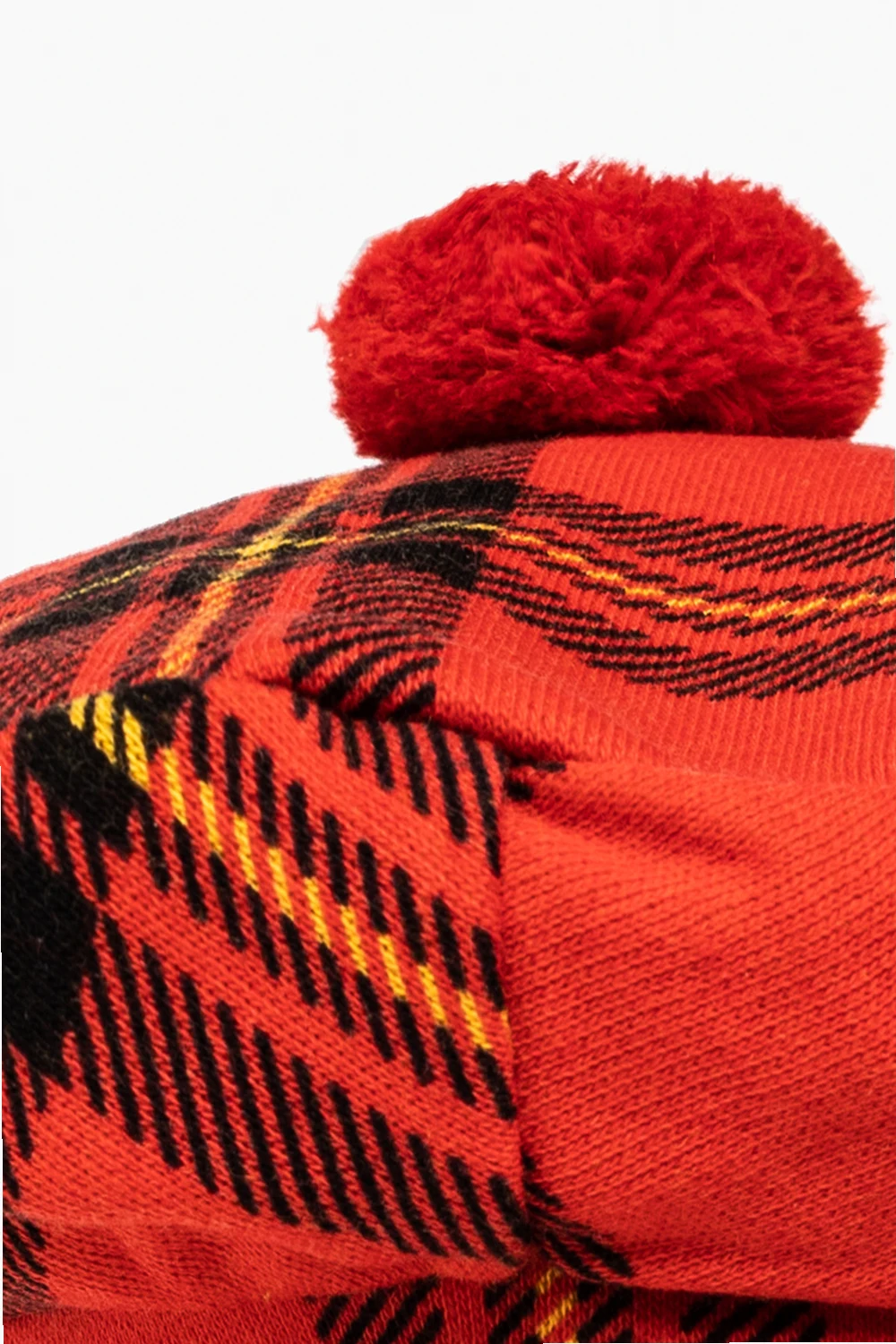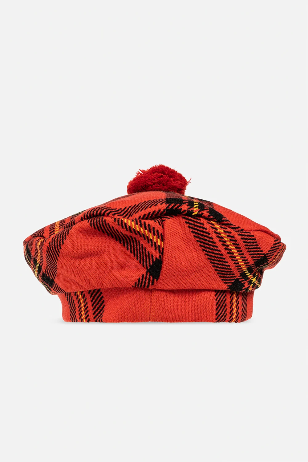 Czerwony beret z pomponem Mini Rodini. Wykonany z bawełny organicznej z certyfikatem GOTS. Ozdobiony wzorem w czarno-żółtą kratę.