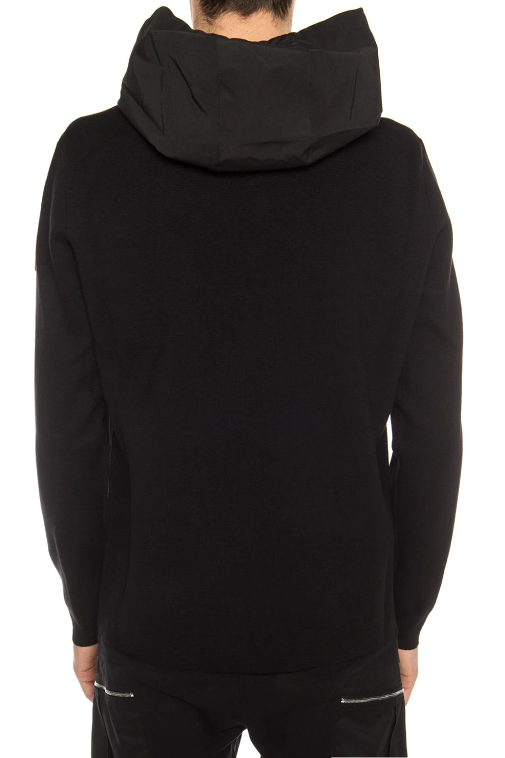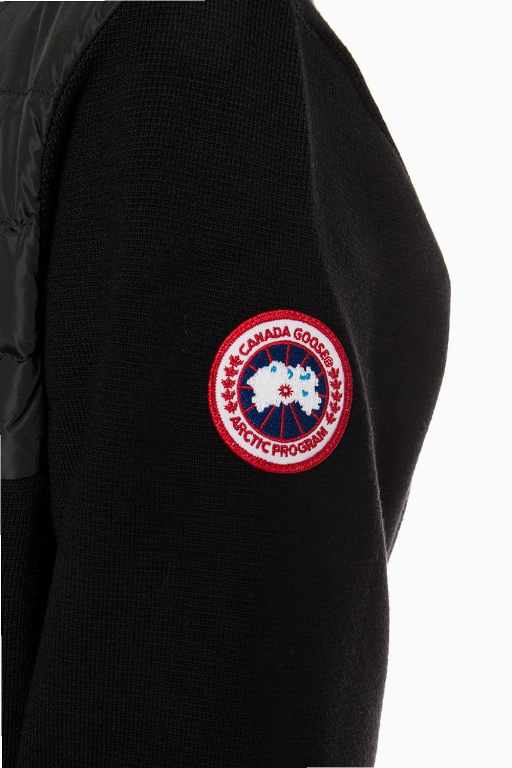 Czarna, wełniana bluza z kapturem Canada Goose. Wykończona pikowanym materiałem. Zapinana na krótki zamek. Ozdobiona naszywką z logo w kolorze biało-czerwono-niebieskim. Kaptur ściągany trokami. Dół i długie rękawy zakończone ściągaczami.