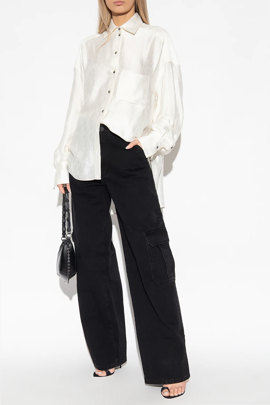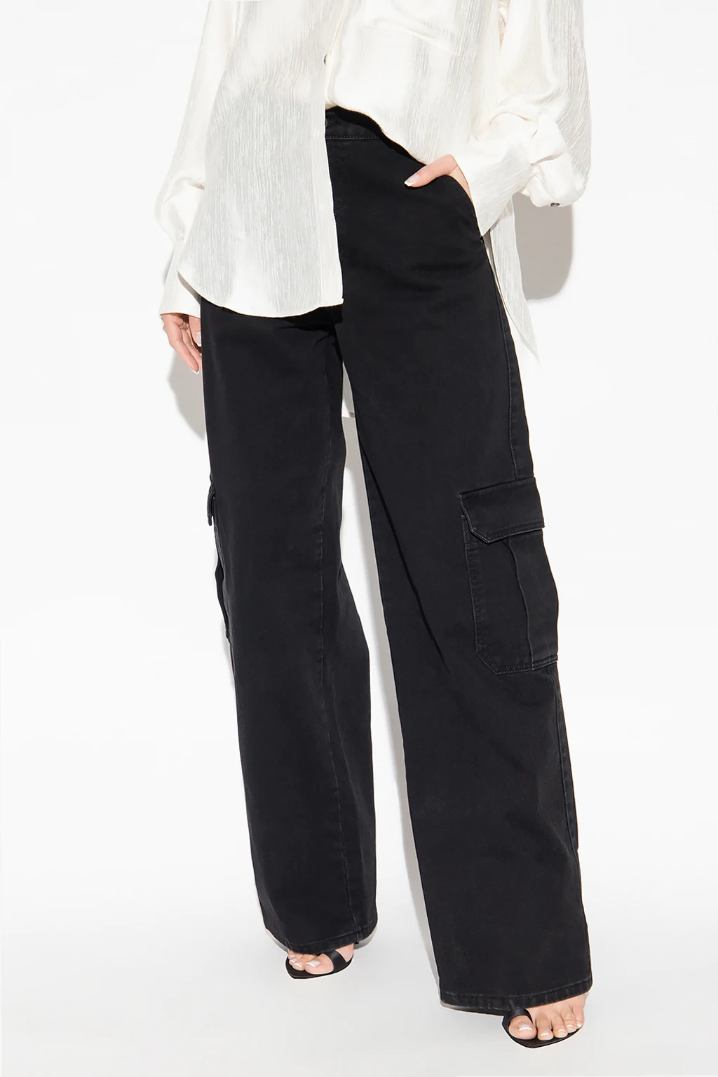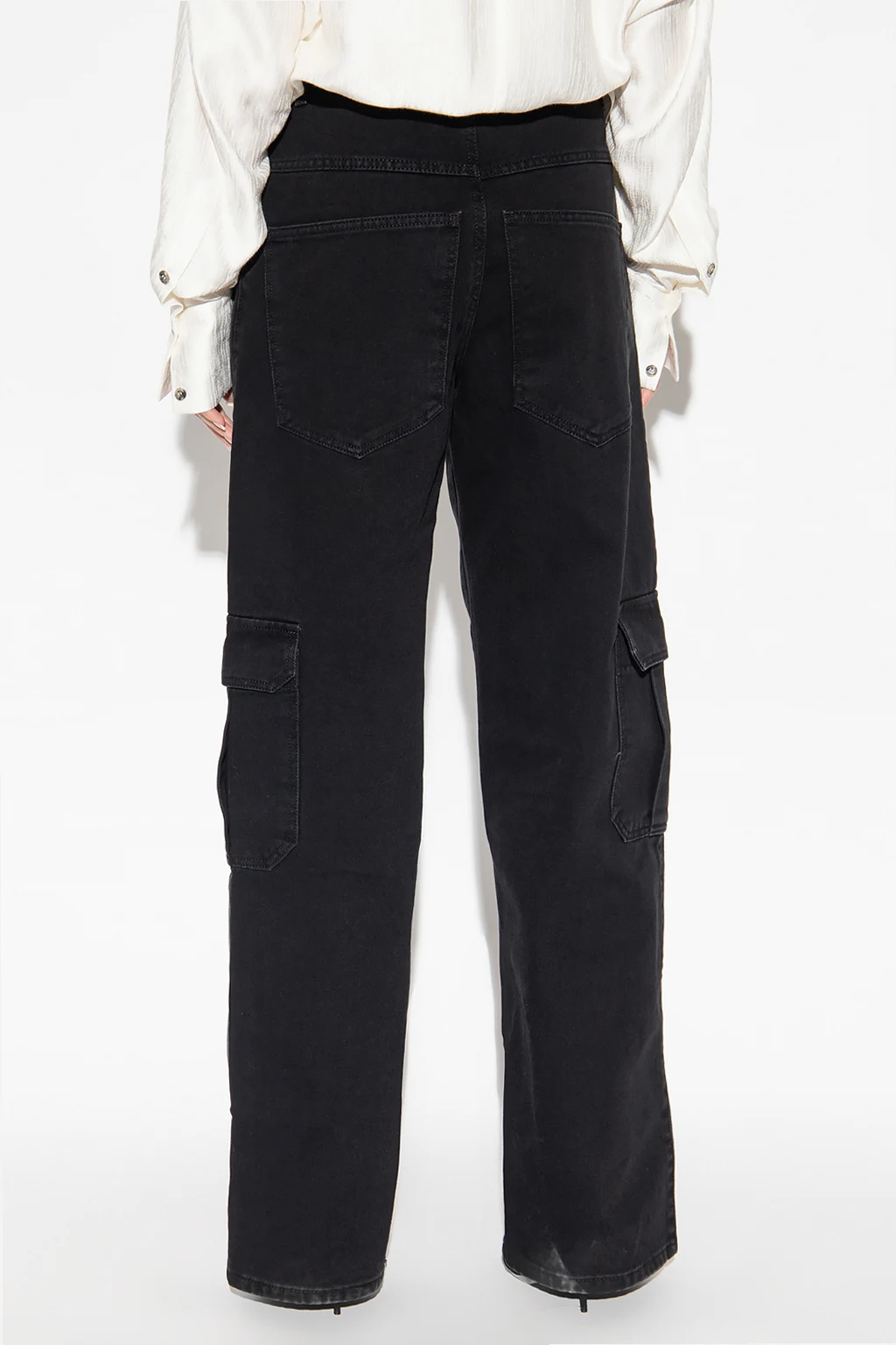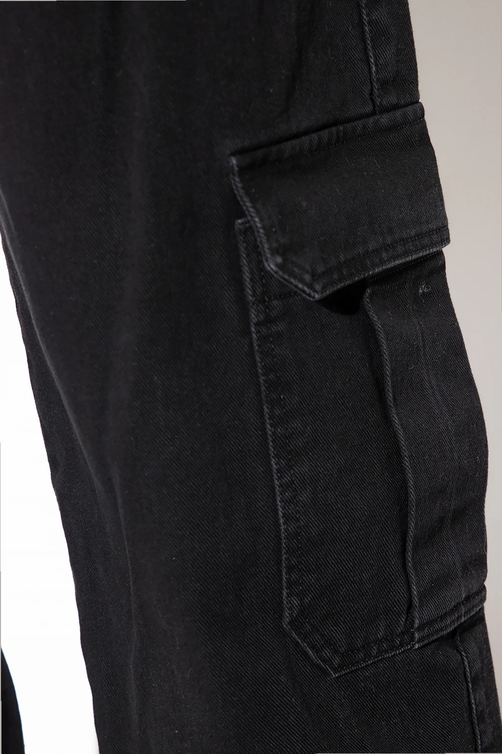 Czarne jeansy typu ‘cargo’, model ‘Sado’ The Mannei. Zapinane na zamek i guzik. Z tyłu naszywka z wytłoczonym logo. Sześć kieszeni cztery wsuwane i dwie z patką. Długie, szerokie nogawki.