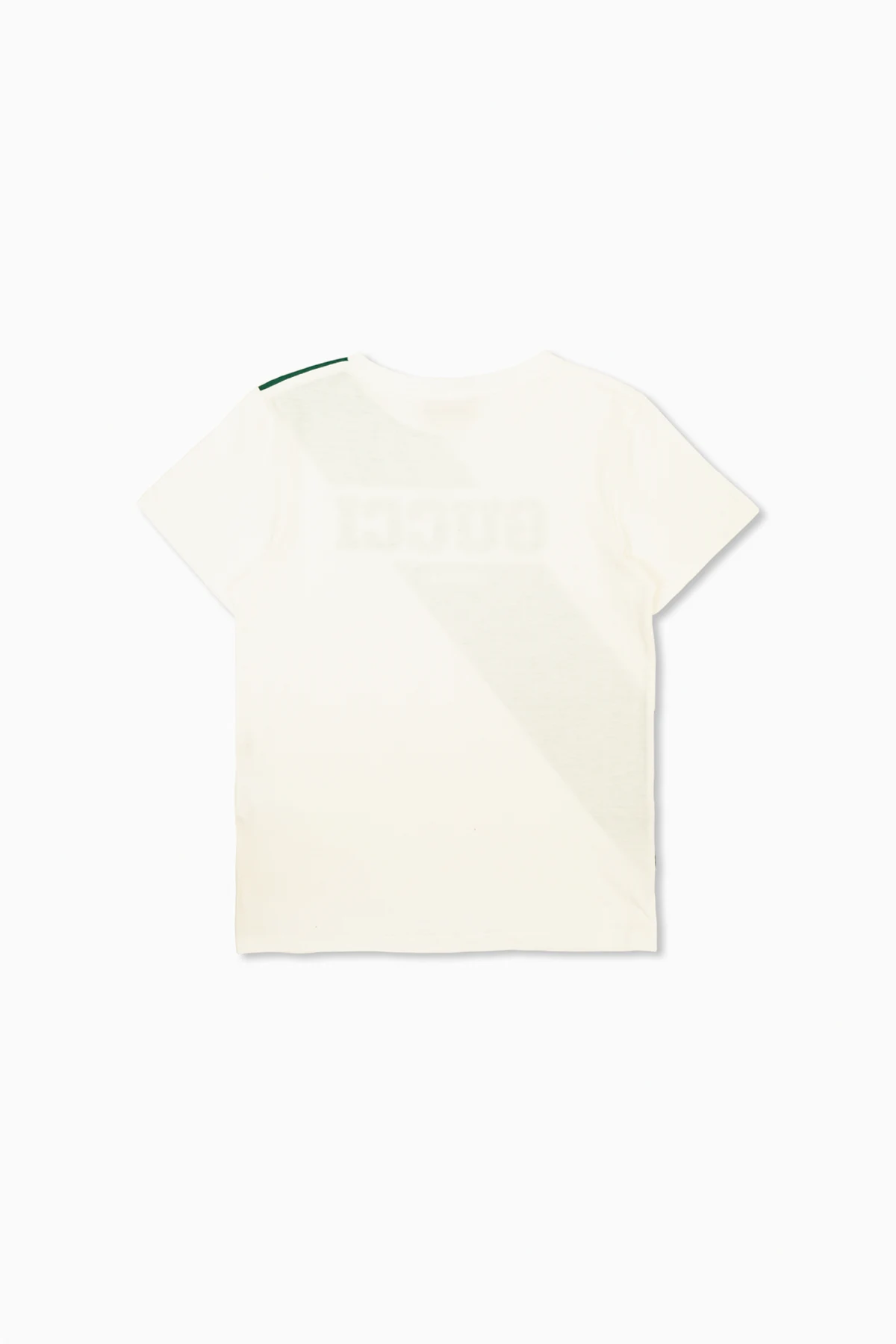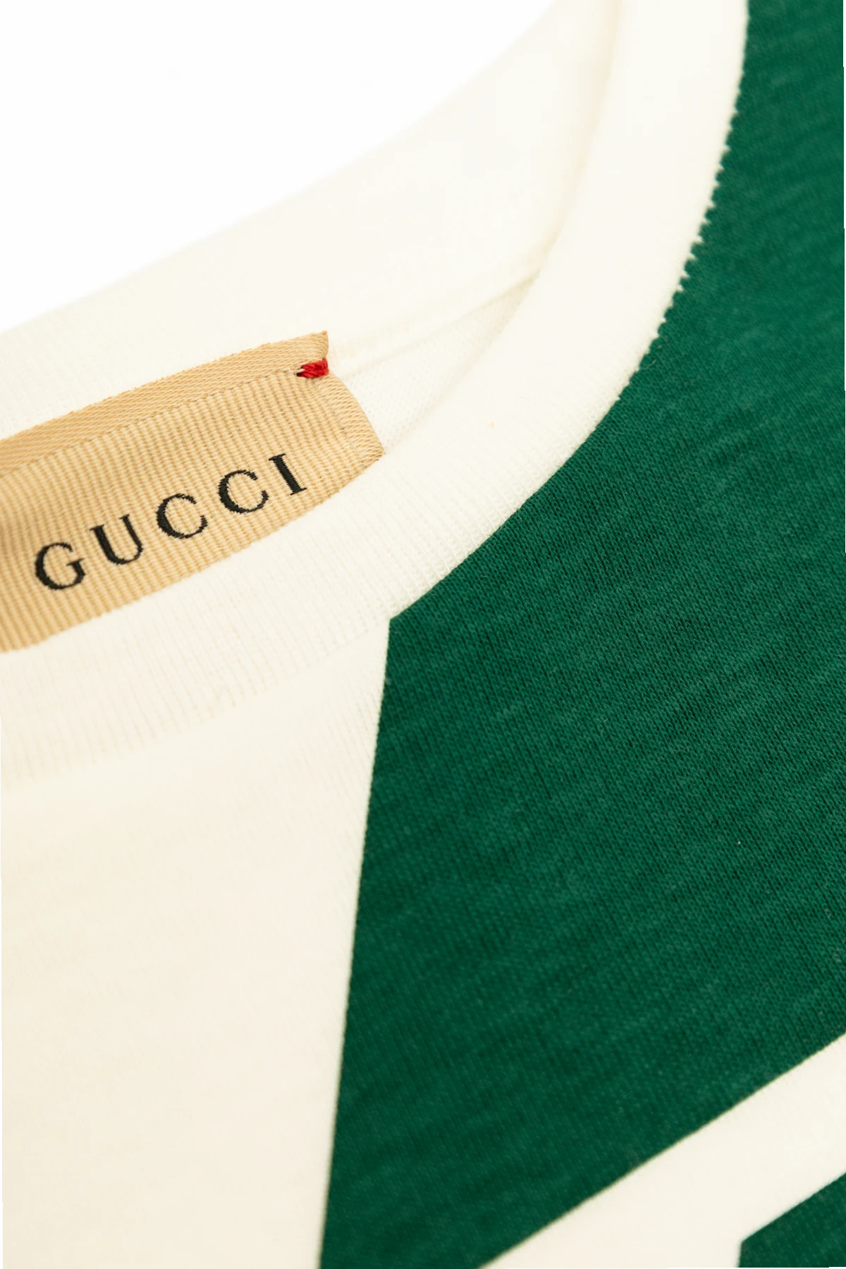 Na tylnej stronie koszulki subtelnie widoczny jest cień napisu "GUCCI" oraz zielonego pasa, co nadaje jej wyjątkowy, designerski wygląd. Wewnętrzna metka przy kołnierzyku z napisem "GUCCI" w czarnym kolorze na beżowym tle stanowi elegancki akcent, potwierdzający autentyczność produktu.
