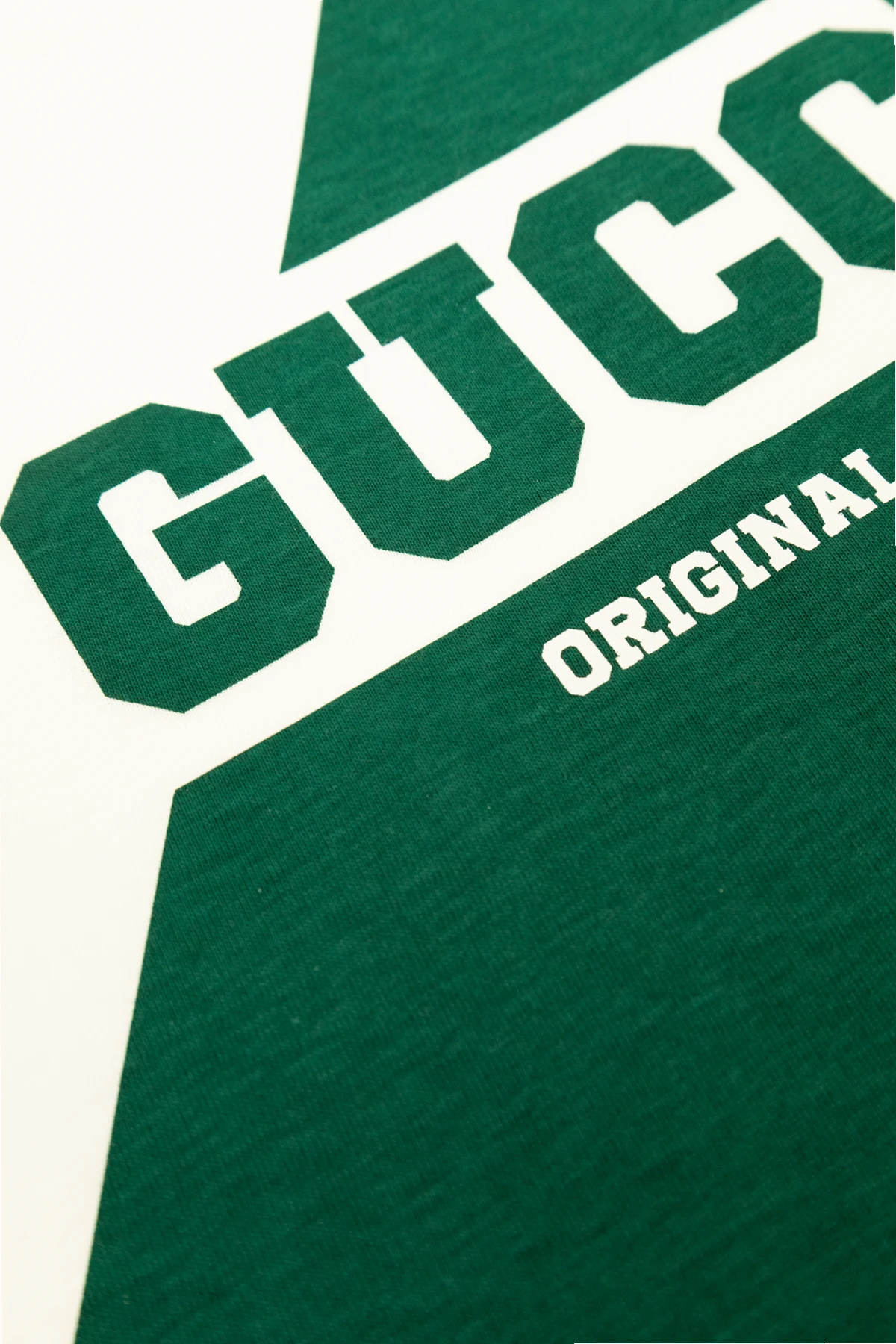 Dominujący biały kolor koszulki został urozmaicony szerokim, zielonym pasem biegnącym diagonalnie od lewej dolnej do prawej górnej strony. Na przodzie, w obrębie pasa, znajduje się duży napis "GUCCI" w białej, blokowej czcionce, uzupełniony mniejszym napisem "ORIGINAL". Klasyczny, okrągły kołnierzyk oraz krótkie rękawy dodają koszulce uniwersalności i wygody.