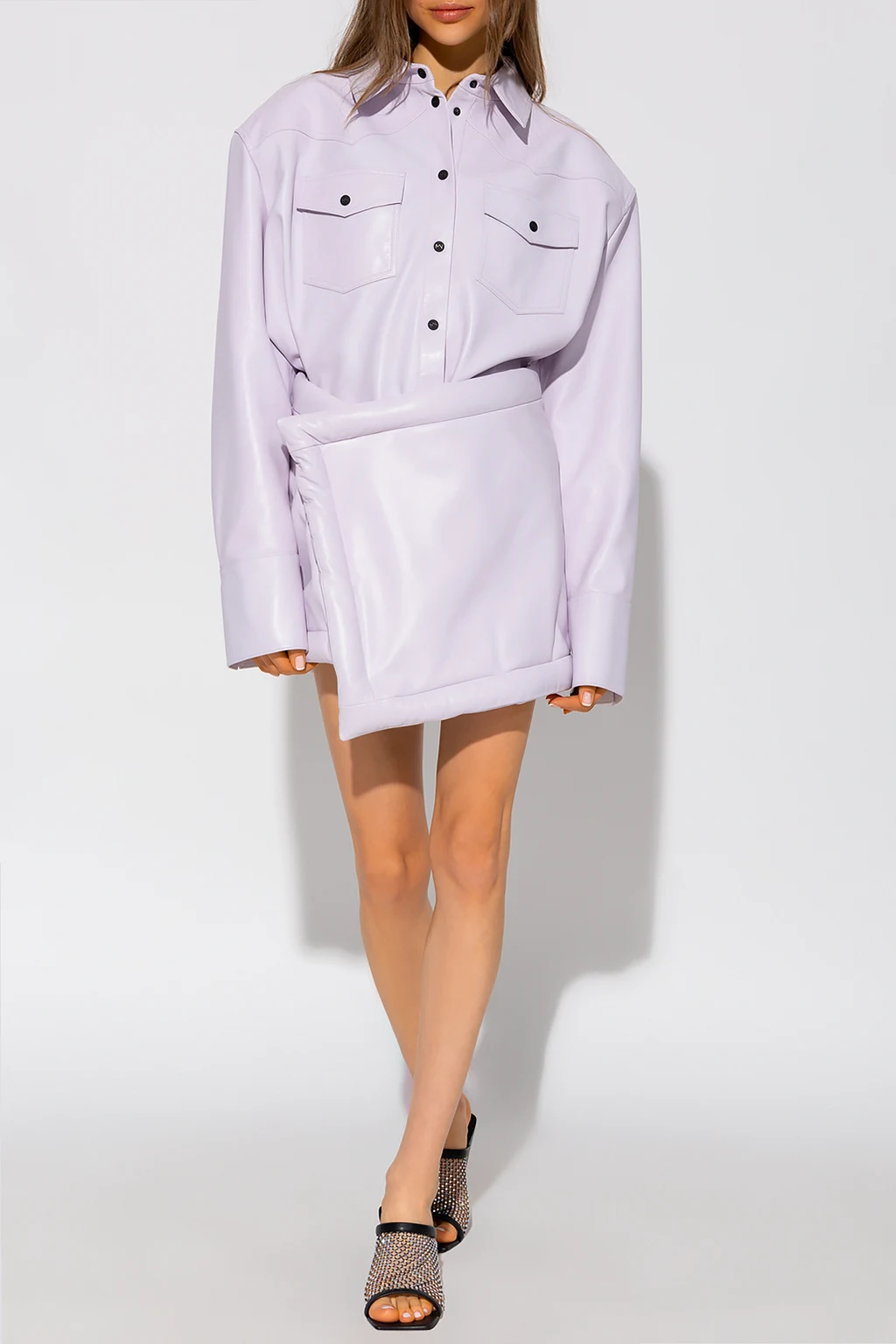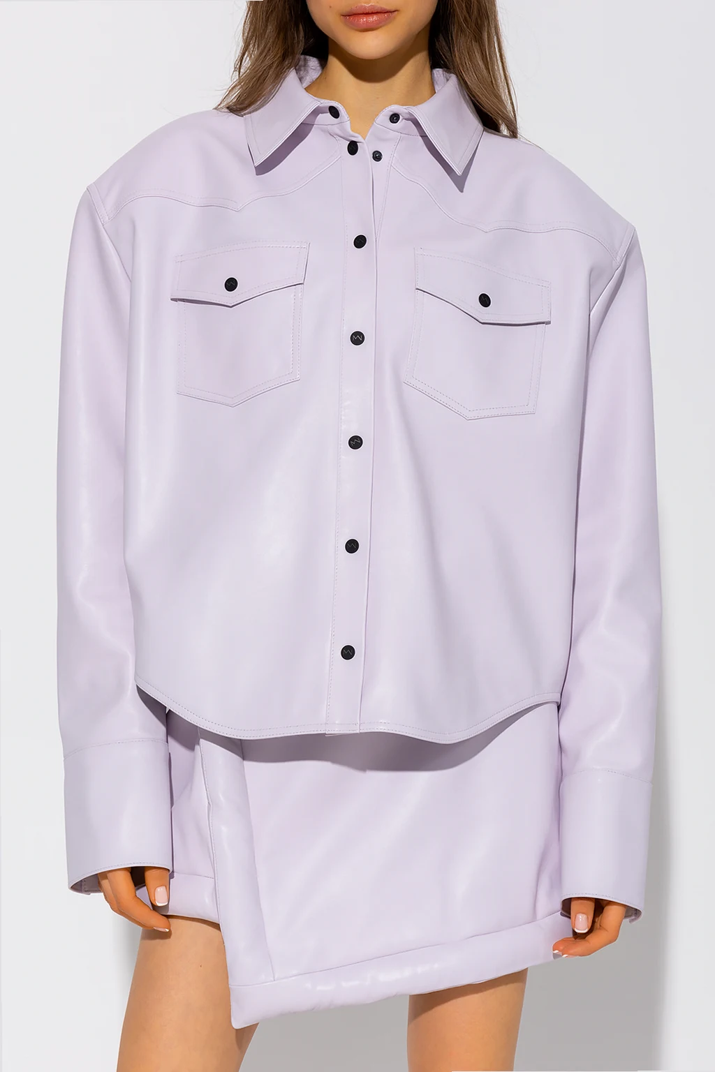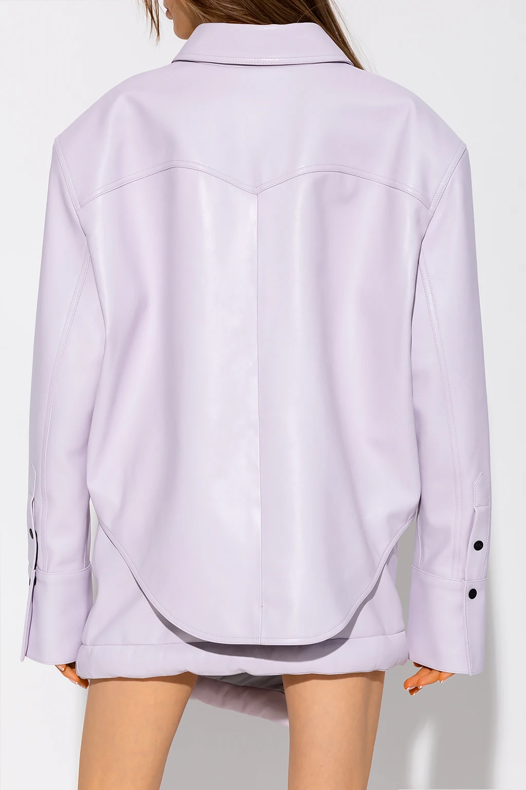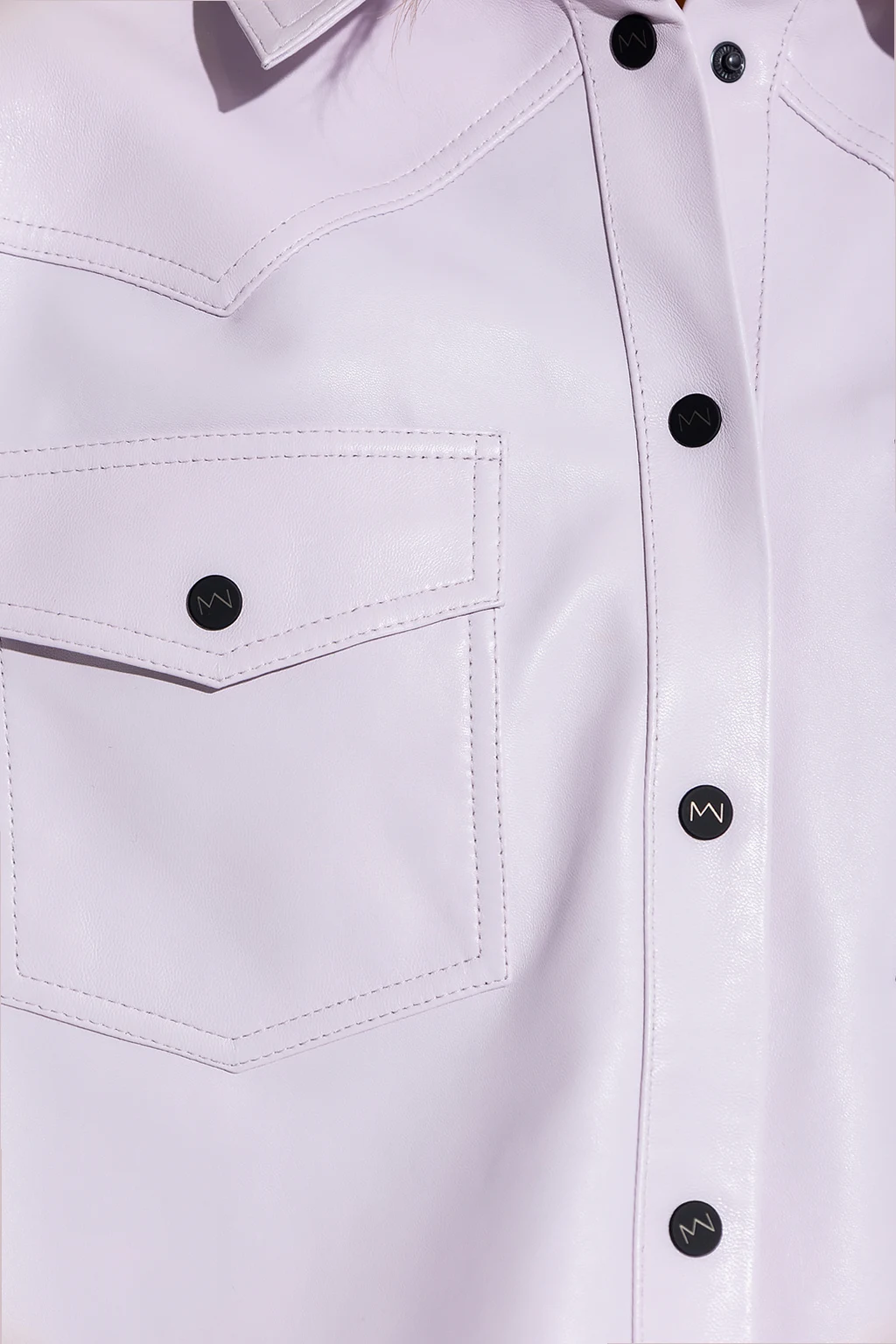 Jasnofioletowa koszula z kołnierzem, model ‘Palini’ The Mannei. Wykonana ze skóry jagnięcej. Zapinana na zatrzaski. Z przodu dwie kieszenie z patkami na zatrzask. Długie rękawy zakończone mankietami. W ramionach wszyte poduszki.