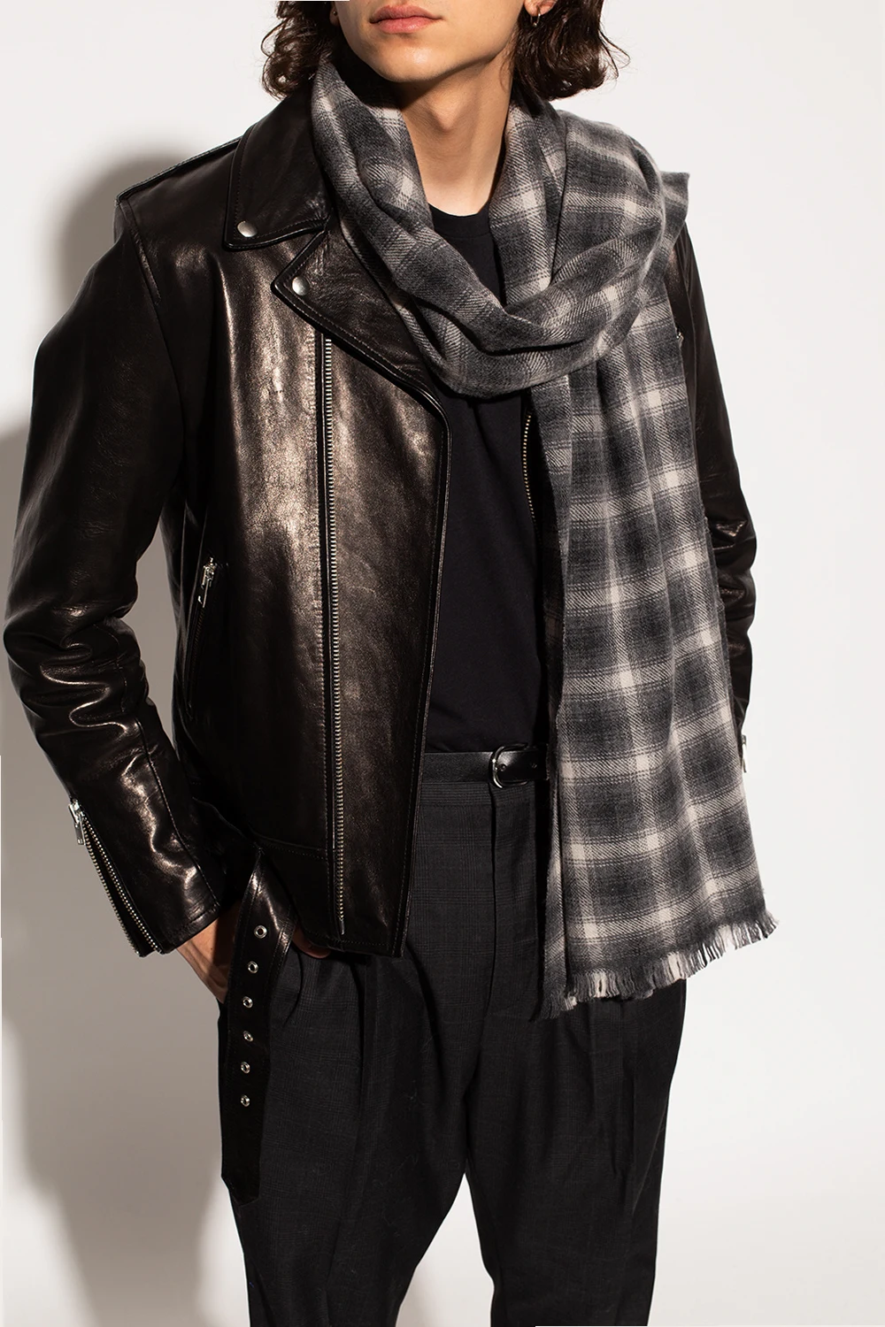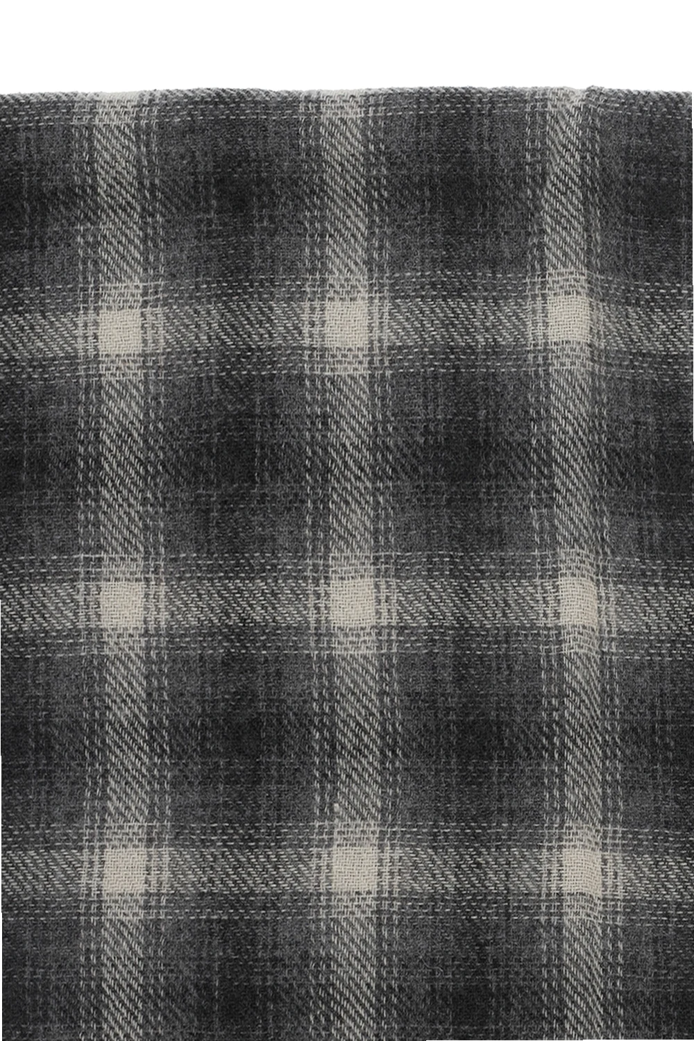Szary szal Isabel Marant. Wykonany z wełny i kaszmiru. Ozdobiony wzorem w kratę. Zakończony krótkimi frędzlami.