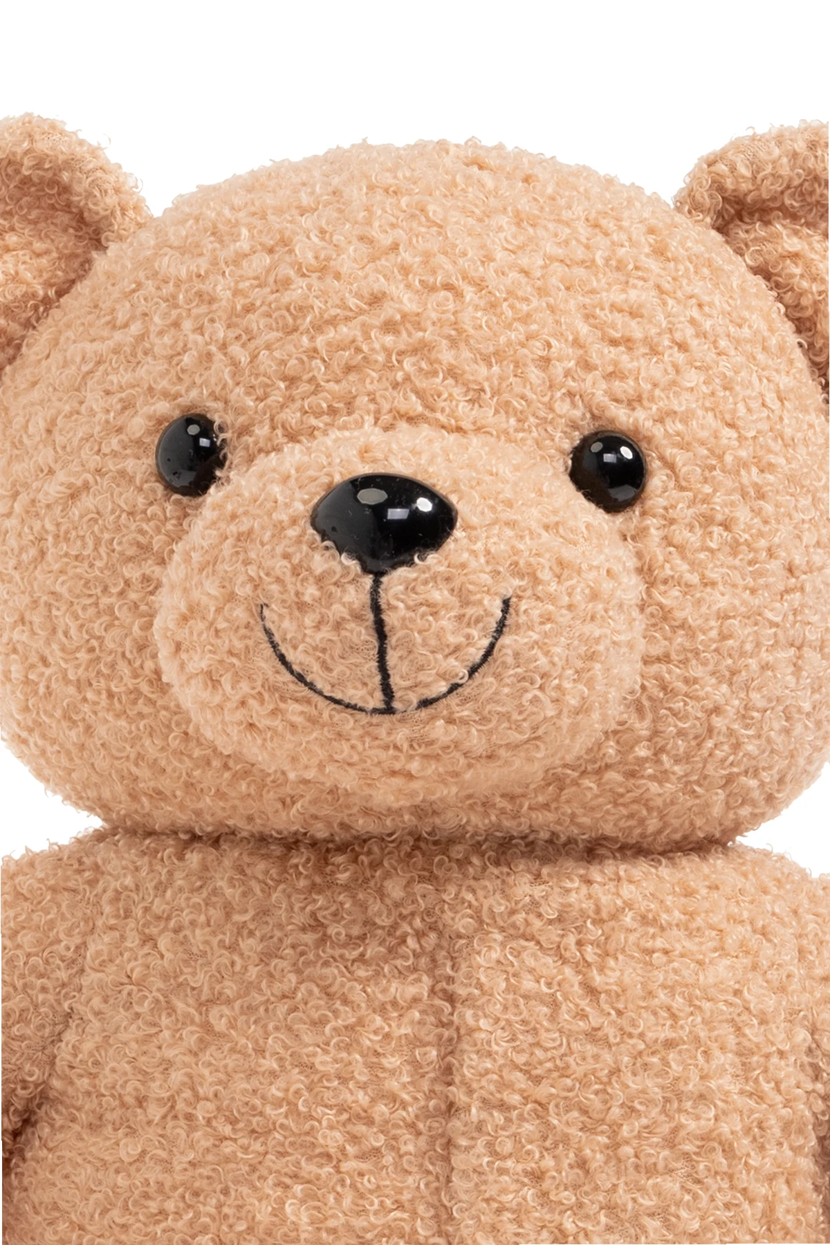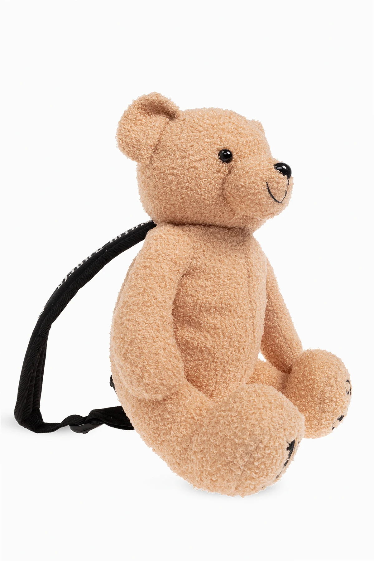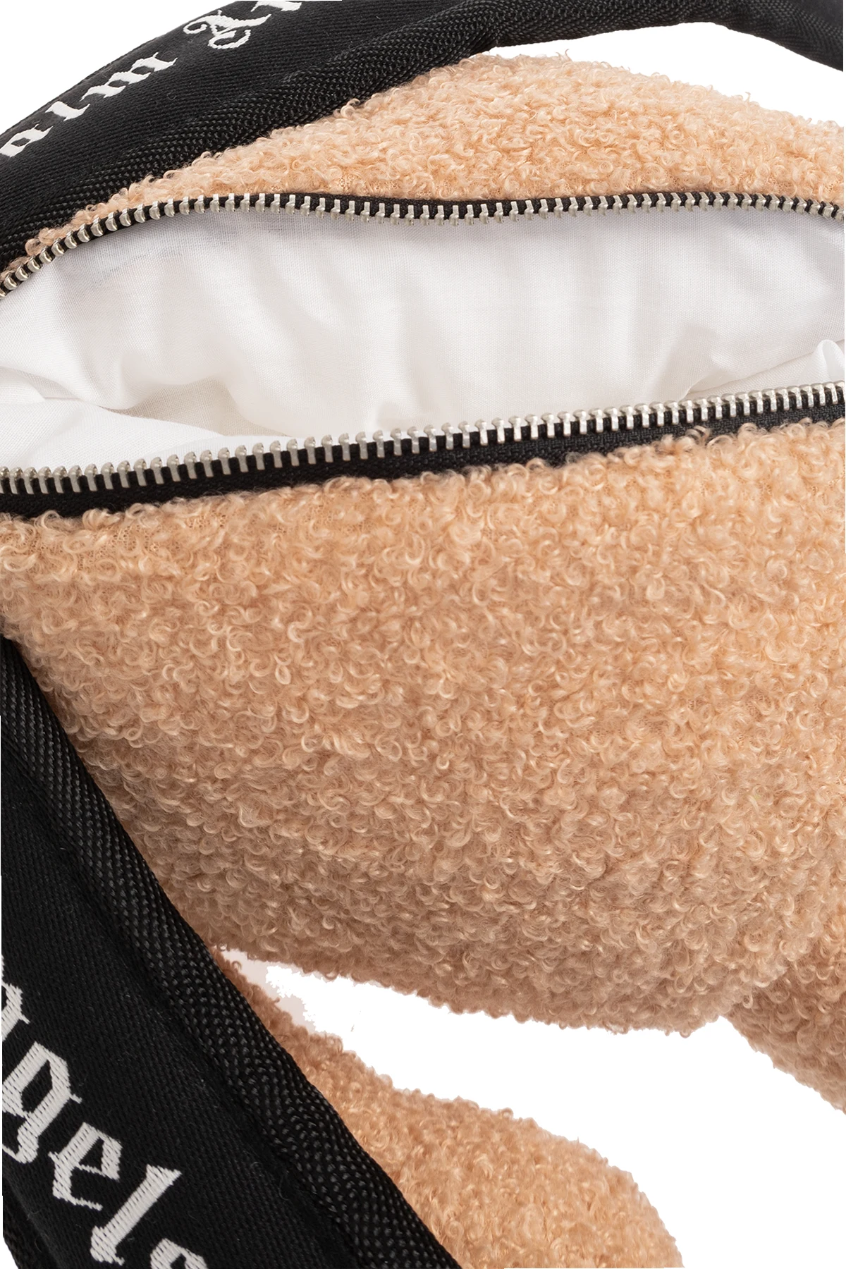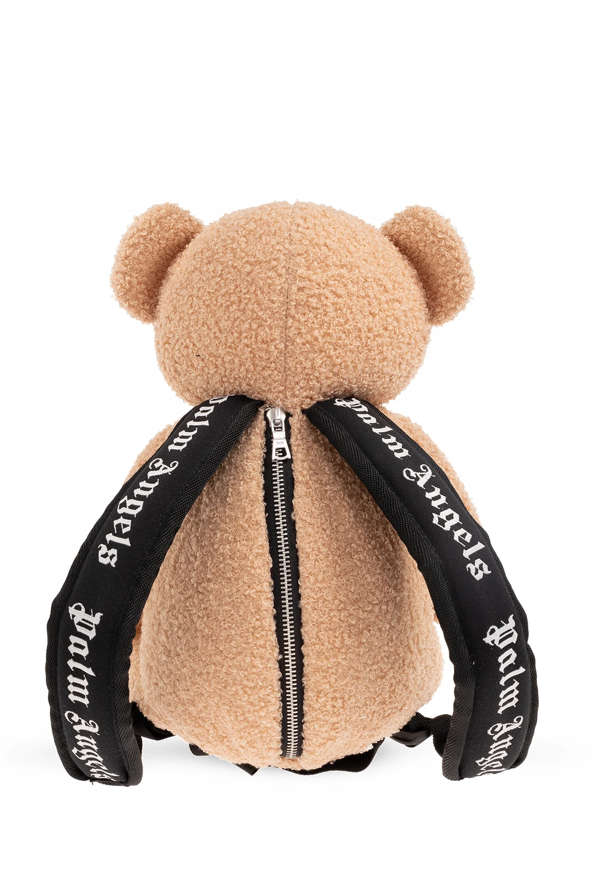 Beżowy plecak w kształcie misia Palm Angels Kids. Zapinany na zamek. Ozdobiony wyszytym czarnym logo. Czarne, regulowane szelki ozdobione wyszytym białym logo. Wypełnienie z poliestru.