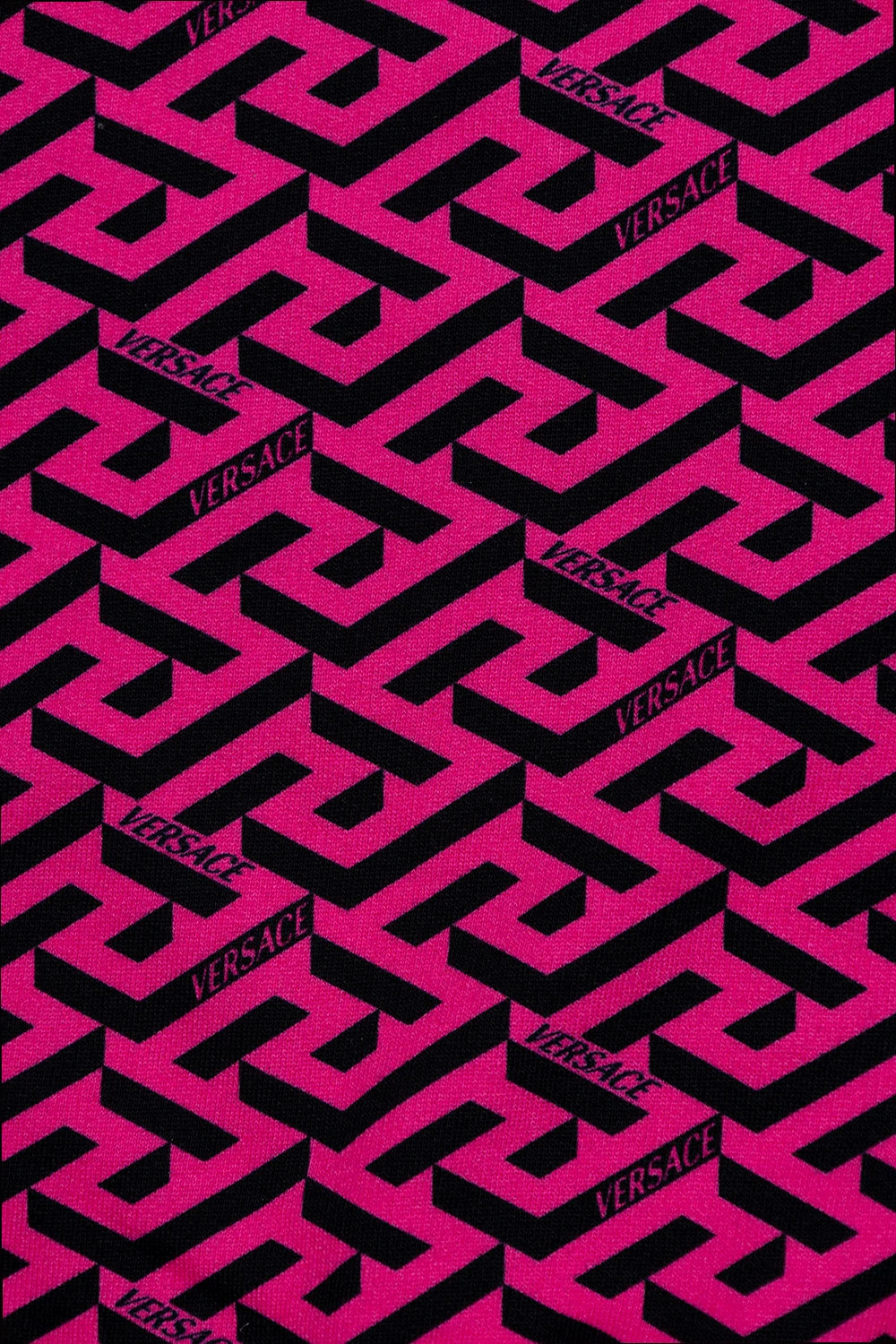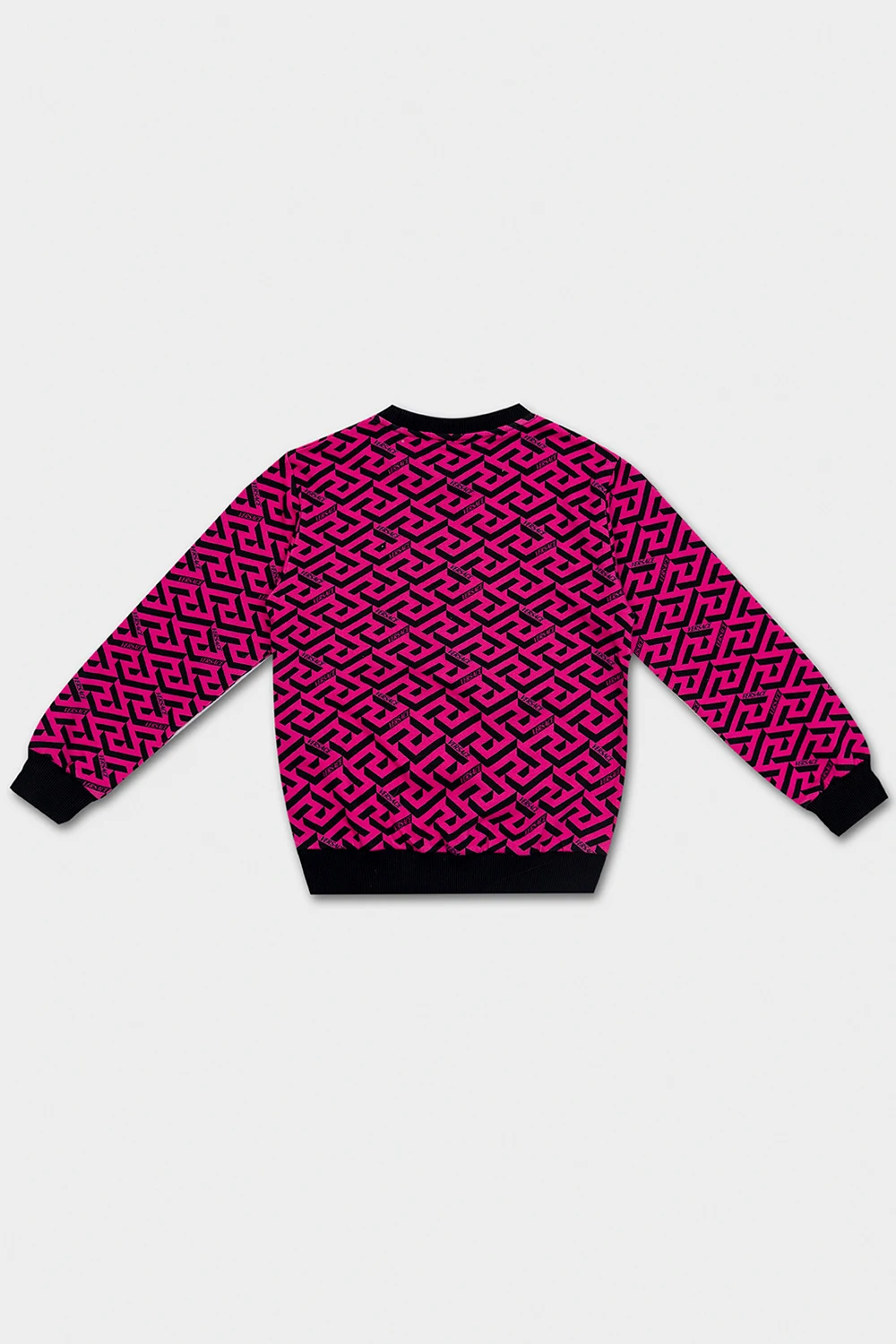 Ciemnoróżowo-czarna bluza Versace Kids. Wykonana z bawełny. Nadrukowany wzór ‘La Greca’ z logo. Okrągły dekolt. Zakończona ściągaczami.