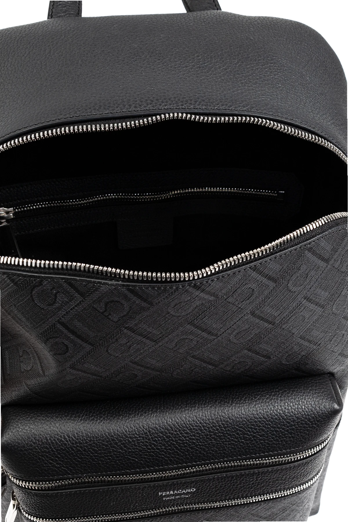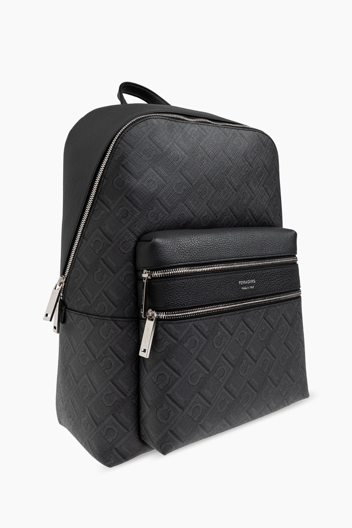 Plecak przyciąga uwagę klasycznym, prostokątnym kształtem z zaokrąglonymi krawędziami. Wyposażony w dwie przednie kieszenie zamykane na eleganckie metalowe zamki, z widocznym napisem "FERRAGAMO MADE IN ITALY", co podkreśla jego ekskluzywny charakter .
