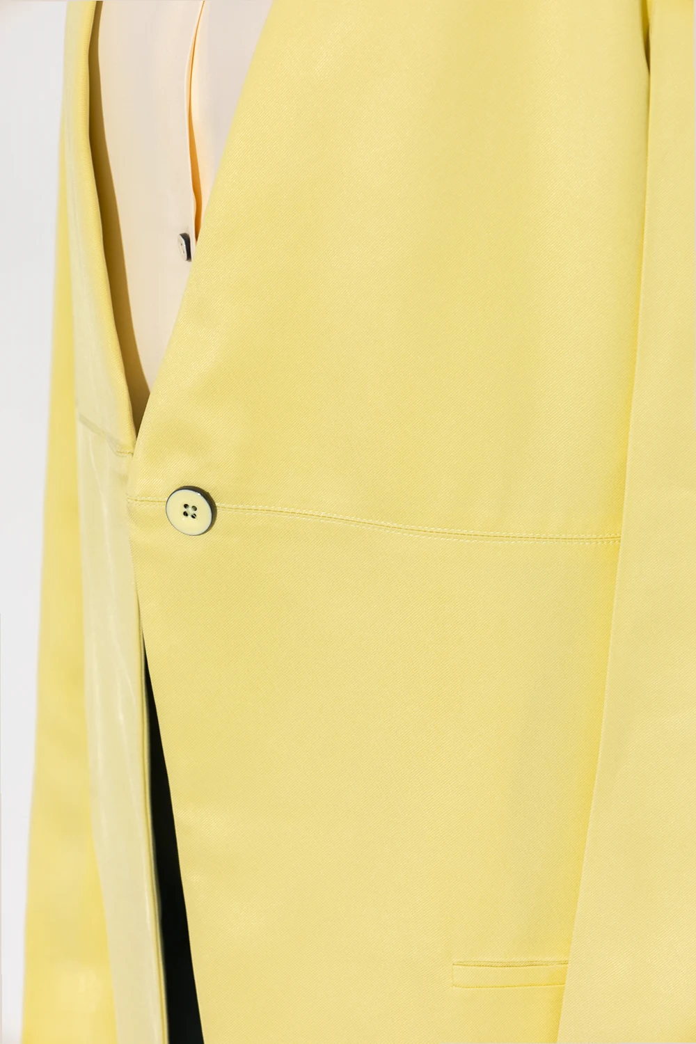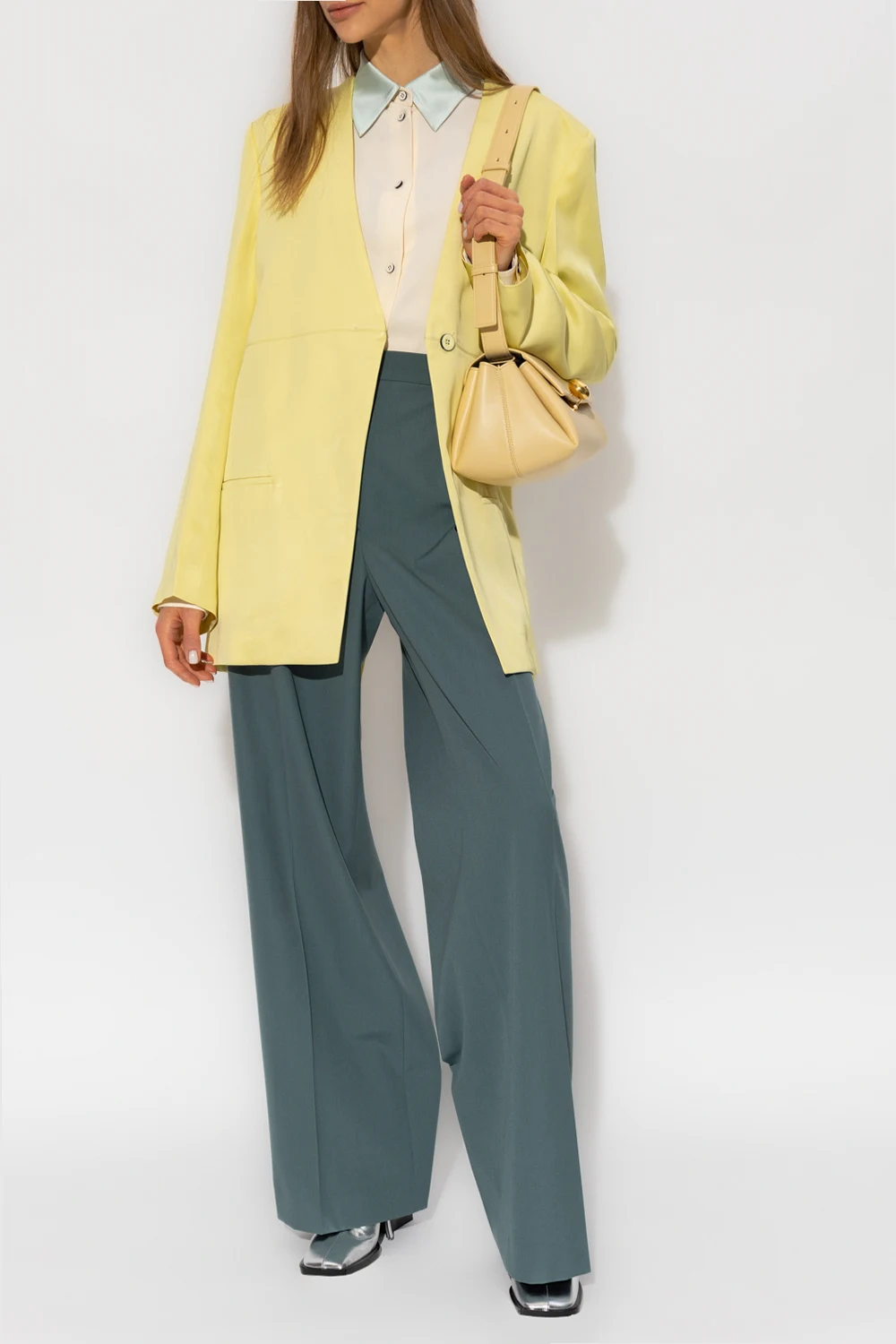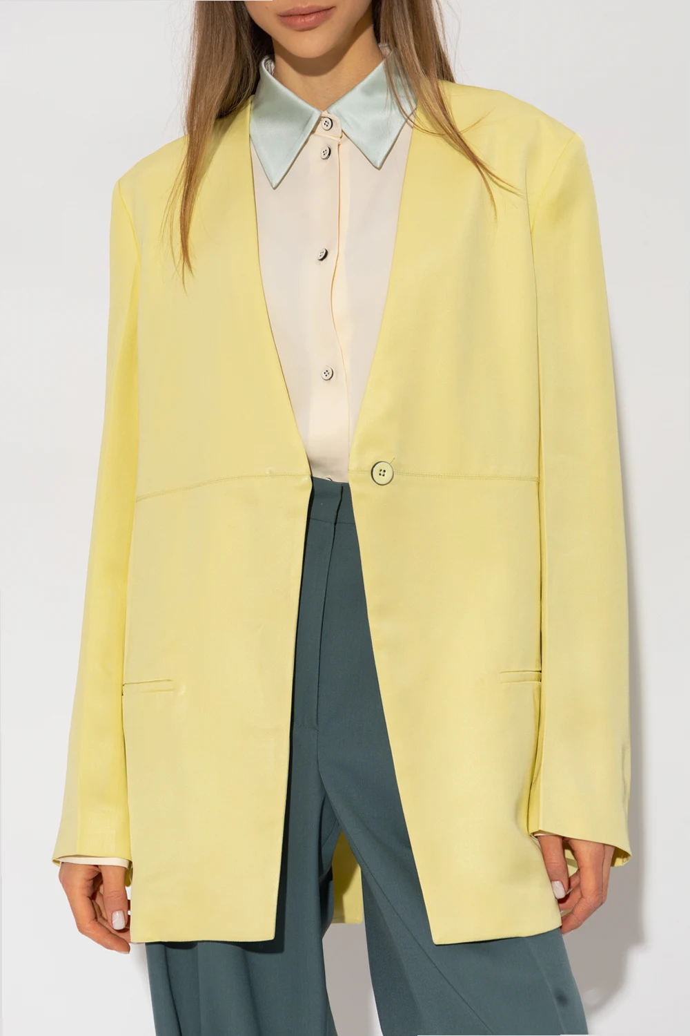 Żółta marynarka Jil Sander. Zapinana na guzik. Z przodu dwie wsuwane kieszenie. Z tyłu dekoracyjne, pojedyncze rozcięcie na długość pleców oraz wszyty szeroki pas. Długie rękawy.