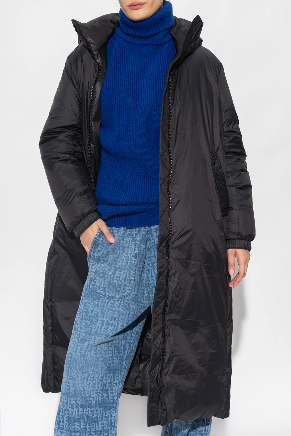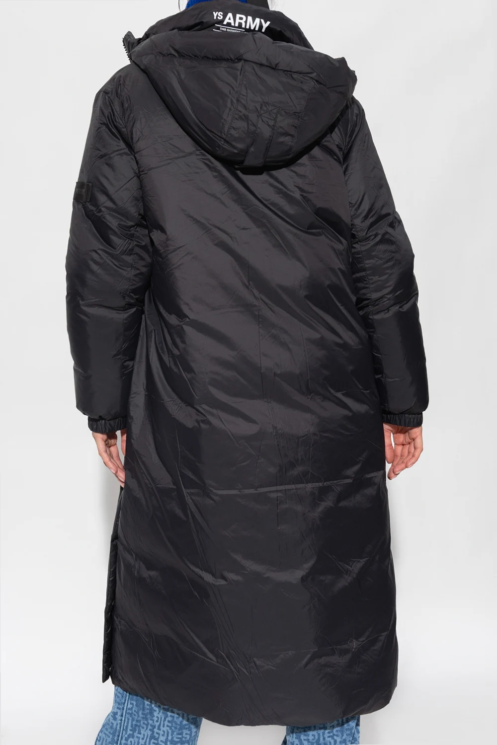Czarny, puchowy płaszcz Yves Salomon. Zapinany na zamek. Ozdobiony naszywką z logo. Dwie wsuwane kieszenie. Na dole dekoracyjne zapięcia na zatrzask. Długie rękawy wykończone ściągaczami.