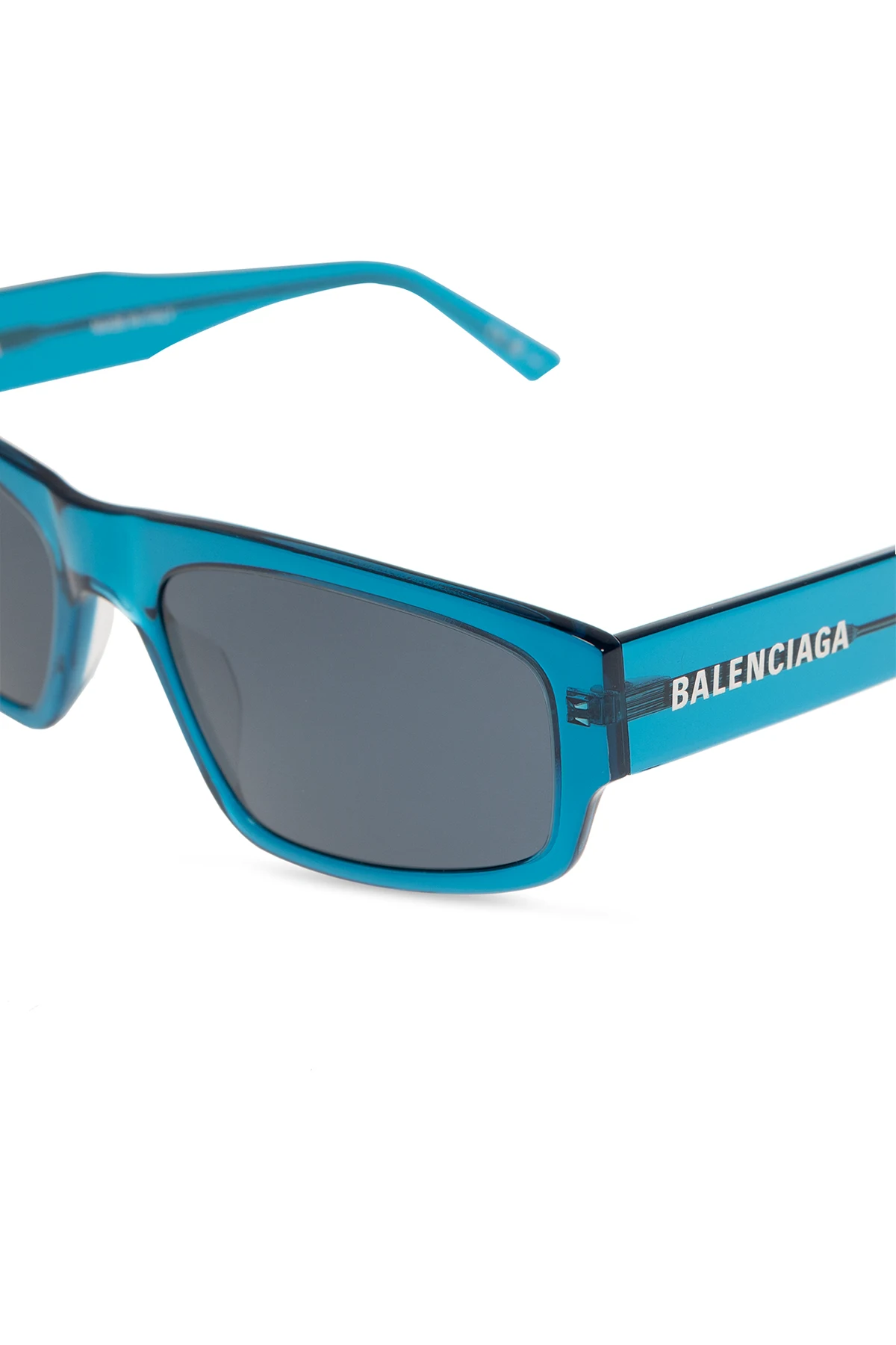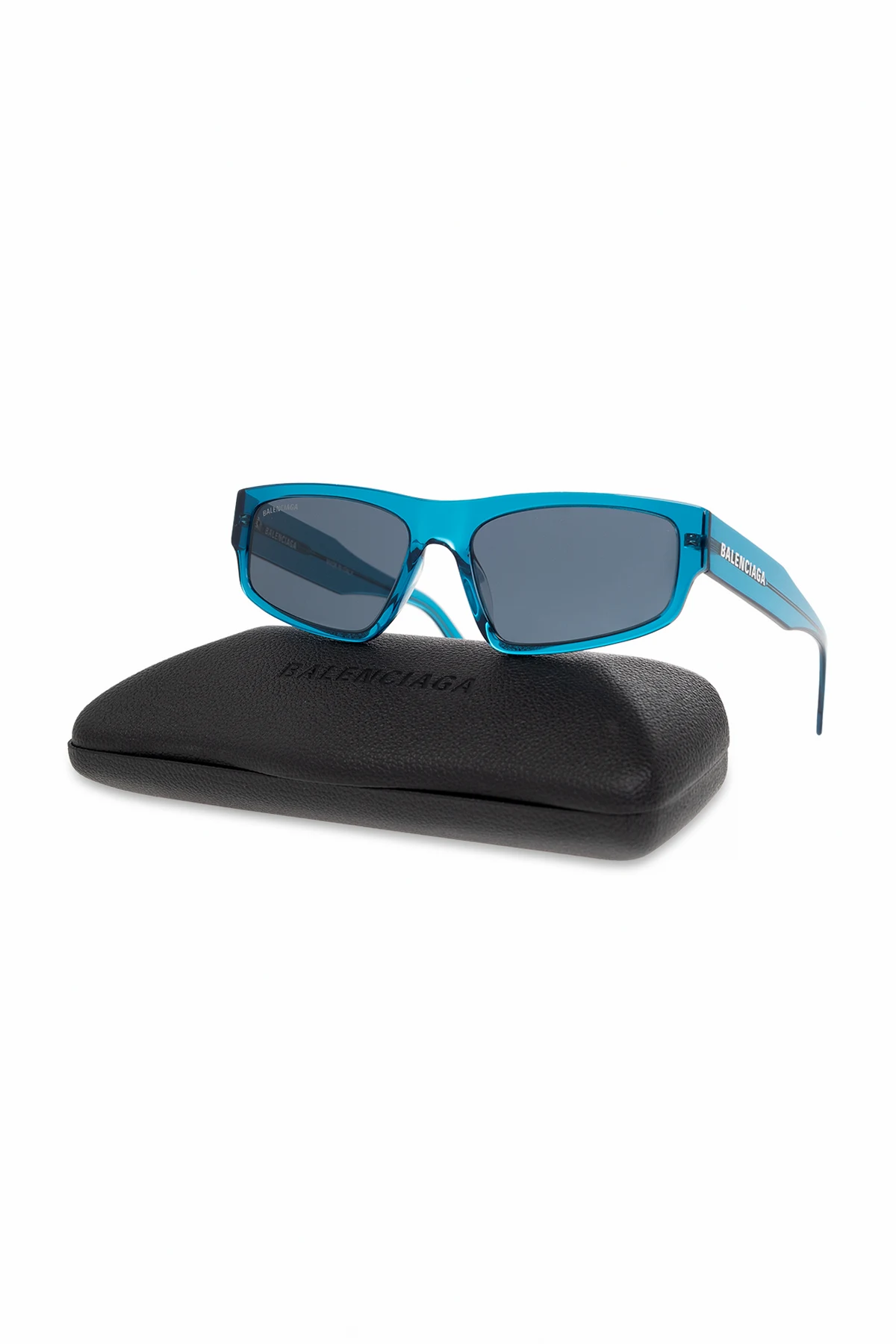 Niebieskie, transparentne okulary przeciwsłoneczne, model ‘Flat’ Balenciaga. Oprawki w kształcie litery ‘D’. Z boku ozdobione białym logo. Niebieskie soczewki ze 100% ochroną przed promieniowaniem UV. Dołączone etui.