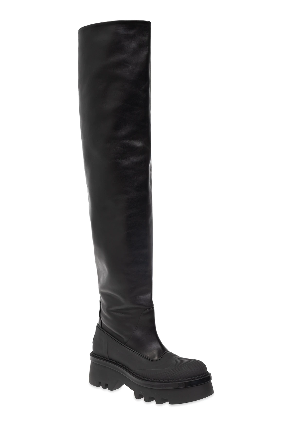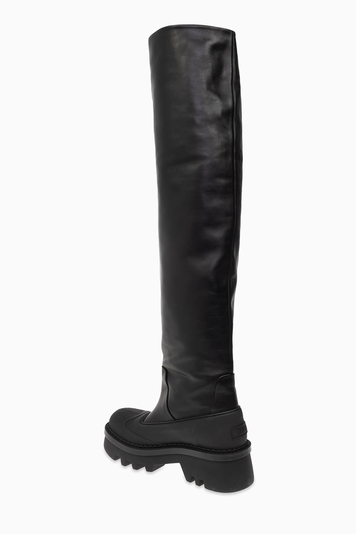 Czarne kozaki na platformie Chloe. Wykonane ze skóry. Z tyłu ozdobione logo. Migdałowy nosek. Czarna, gumowa podeszwa.