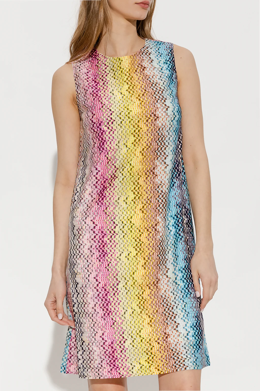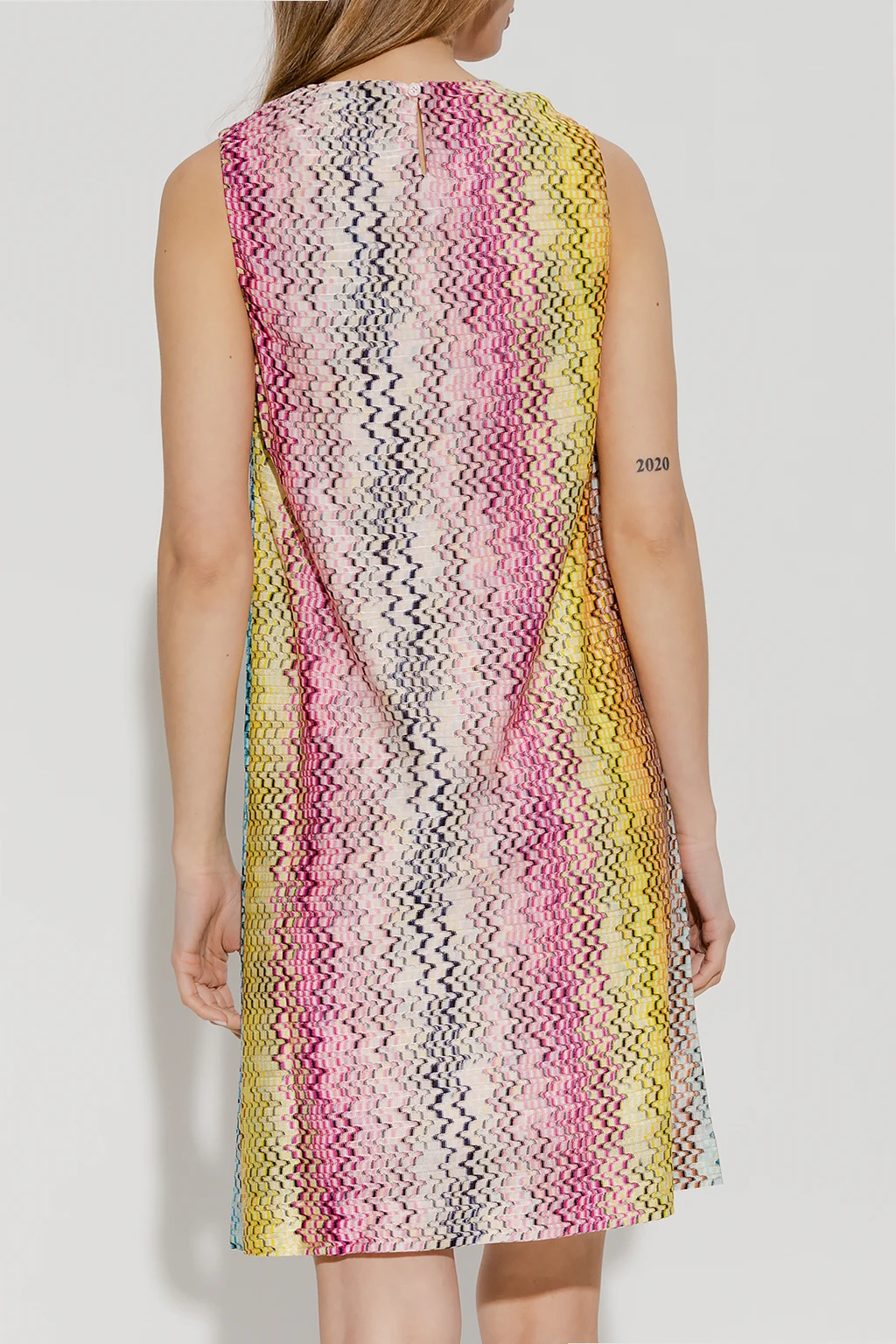 Kolorowa sukienka bez rękawów M Missoni. Ozdobiona geometrycznym wzorem. Z tyłu zapinana na guzik.