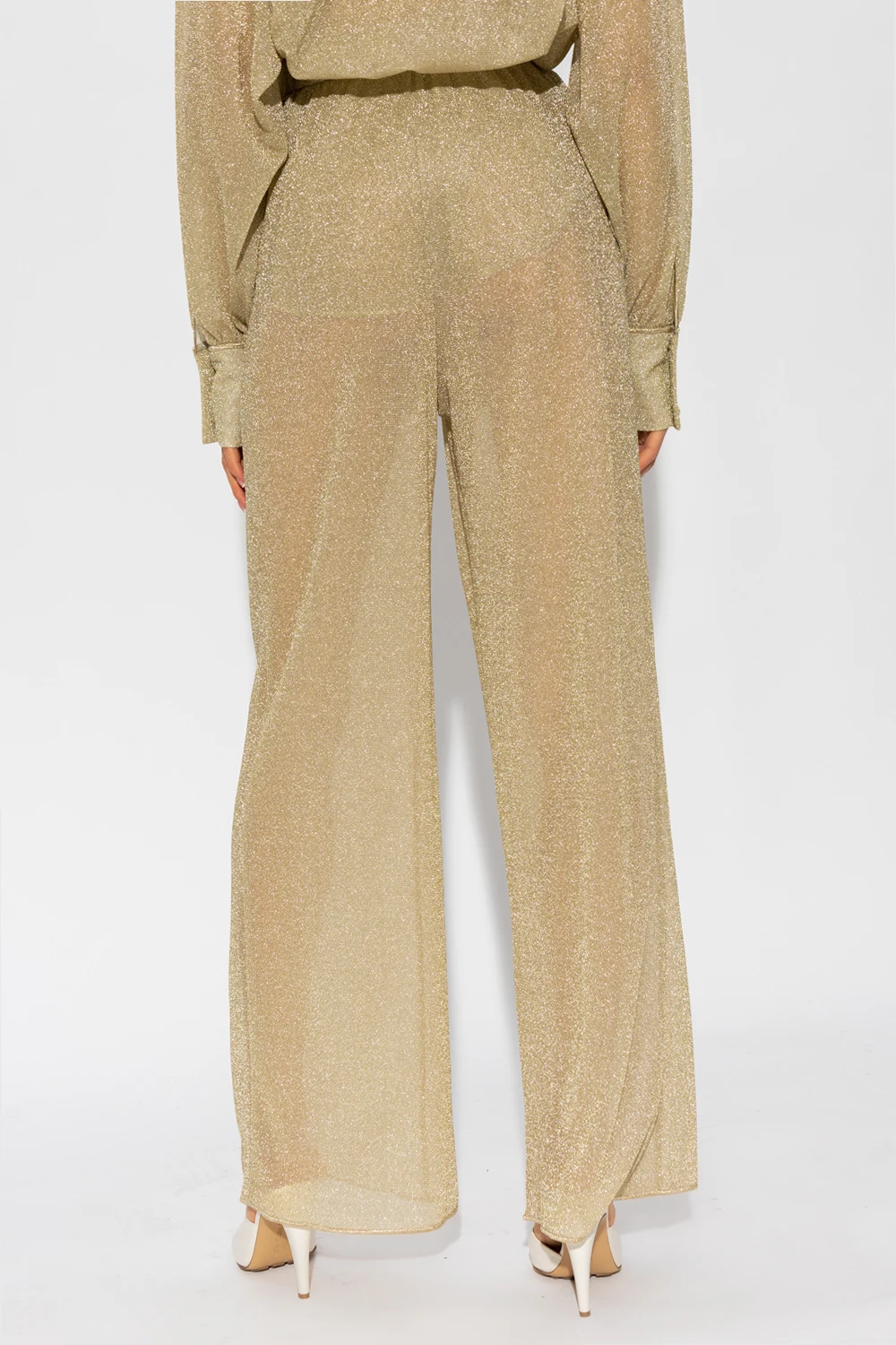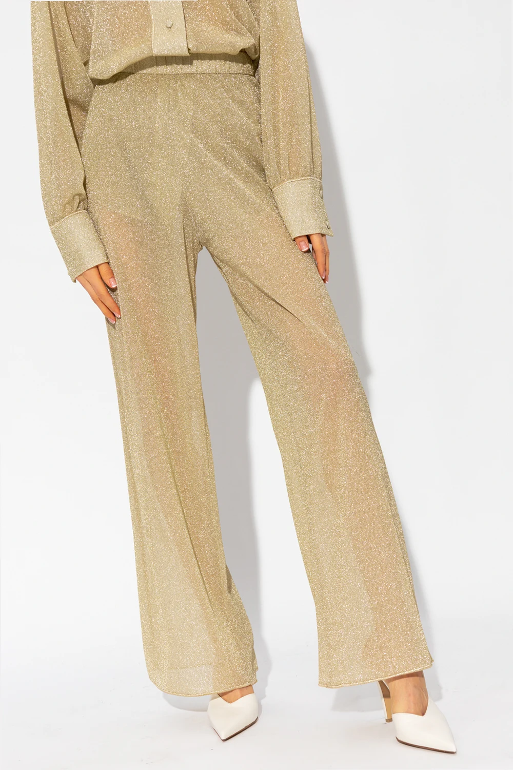 Spodnie w kolorze złotym Oseree. W pasie wszyta guma. Ozdobione lureksową nicią. Nogawki o prostym kroju.