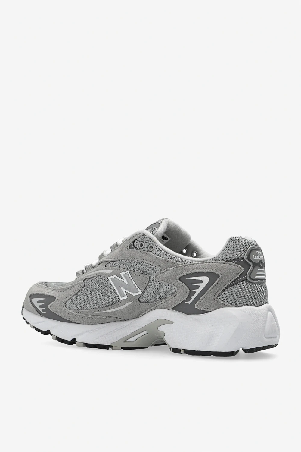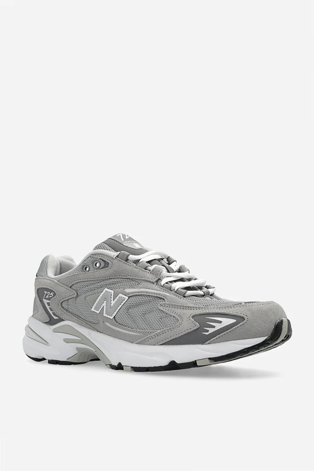 Szare, sznurowane buty sportowe, model ‘725’ New Balance. Formą nawiązujące do butów do biegania z początku lat 2000. Cholewka wykonana z wysokiej jakości materiałów syntetycznych, siatki i wykończona zamszem. Na języku oraz zapiętku logo. Profil ozdobiony charakterystyczną dla marki naszywką. Dobrze zamortyzowana podeszwa środkowa wyposażona w system ABZORB. Czarno-szaro-biała, wytrzymała podeszwa zewnętrzna wzbogacona o twarde tworzywo gumowe N–Durance zapewniające odpowiednią trwałość i dodatkową ochronę pięty podczas uderzeń o twarde nawierzchnie.