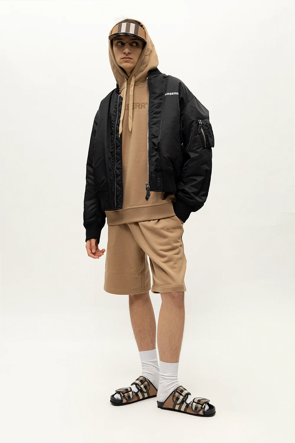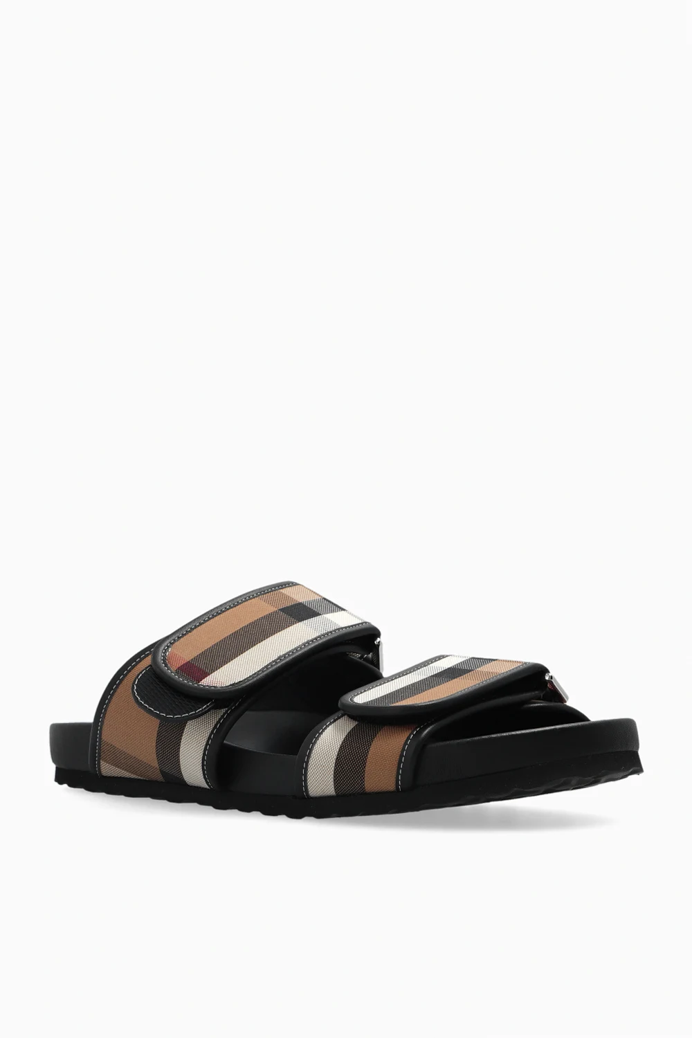Brązowo-kremowo-czarne klapki, model ‘Thornham’ Burberry. Wykonane ze skóry i materiału. Ozdobione wzorem z charakterystyczną dla marki kratą ‘Nova Check’. Zapinane na rzep. Czarna, gumowa podeszwa.