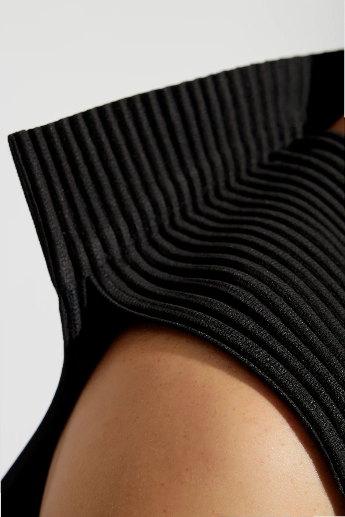 Jego głęboki, czarny odcień, wzbogacony o cienkie, precyzyjnie ułożone plisy, tworzy zjawiskowy efekt światłocieni, który przyciąga wzrok i podkreśla unikatowość kreacji. Okrągły dekolt harmonijnie komponuje się z szerokimi ramionami, nadając sylwetce smukłości i elegancji. Subtelny, asymetryczny detal na plecach, w postaci delikatnie wydłużonego materiału, dodaje topowi nowoczesnego charakteru, pozostając wiernym zasadom minimalistycznego designu.
