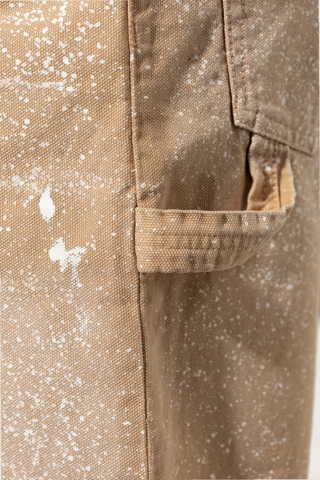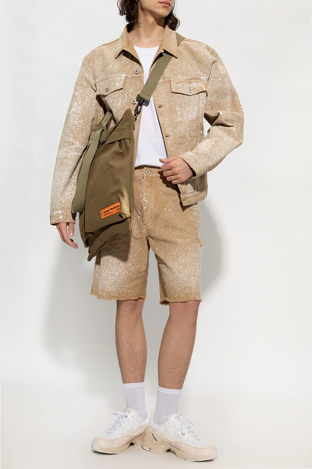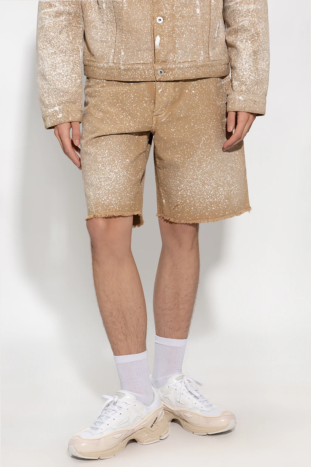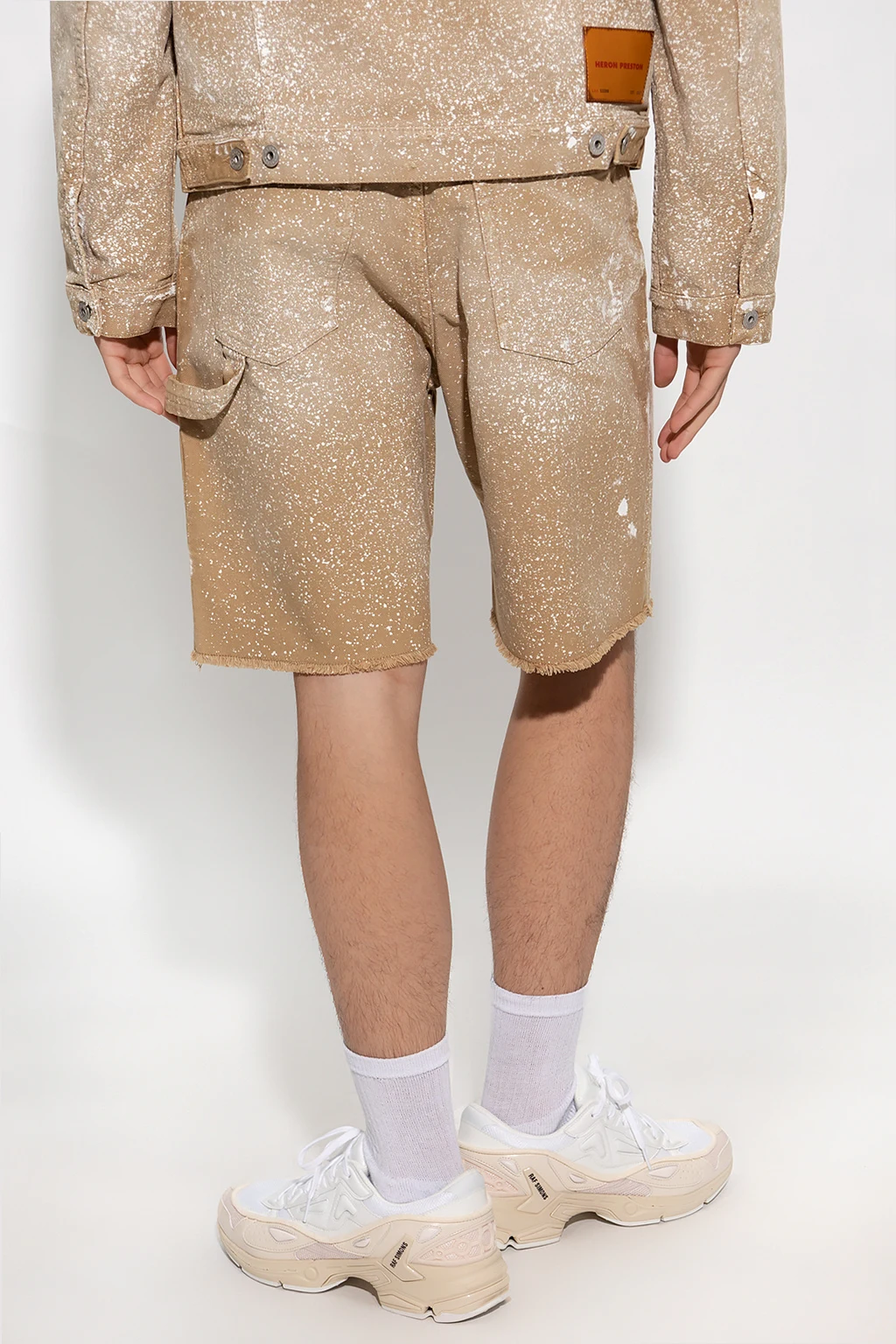 Beżowe szorty Heron Preston. Wykonane z bawełny. Ozdobione białym nadrukiem z efektem plam po farbie. Zapinane na guzik i zamek. Pięć wsuwanych kieszeni: trzy z przodu oraz dwie z tyłu. Z tyłu naszywka z logo. Nogawki krótkie, surowo wykończone.