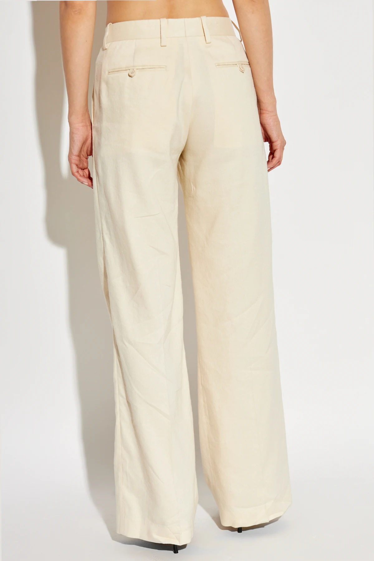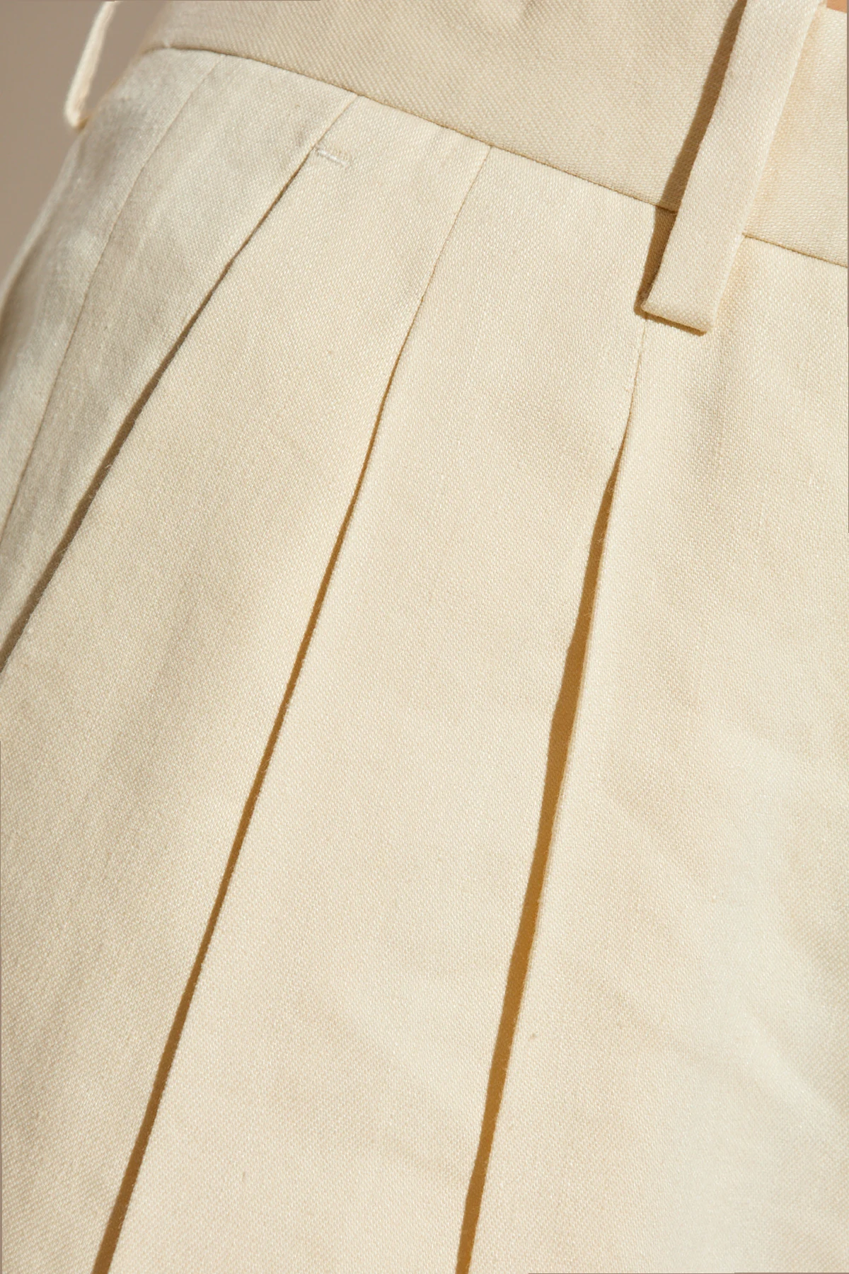 Lniany materiał, z którego wykonane są spodnie, uwydatnia ich ekskluzywny charakter dzięki charakterystycznej teksturze oraz precyzyjnym szwom, widocznym na detalach. To wyraźny znak rzemiosła i dbałości o każdy, nawet najmniejszy element wykonania.