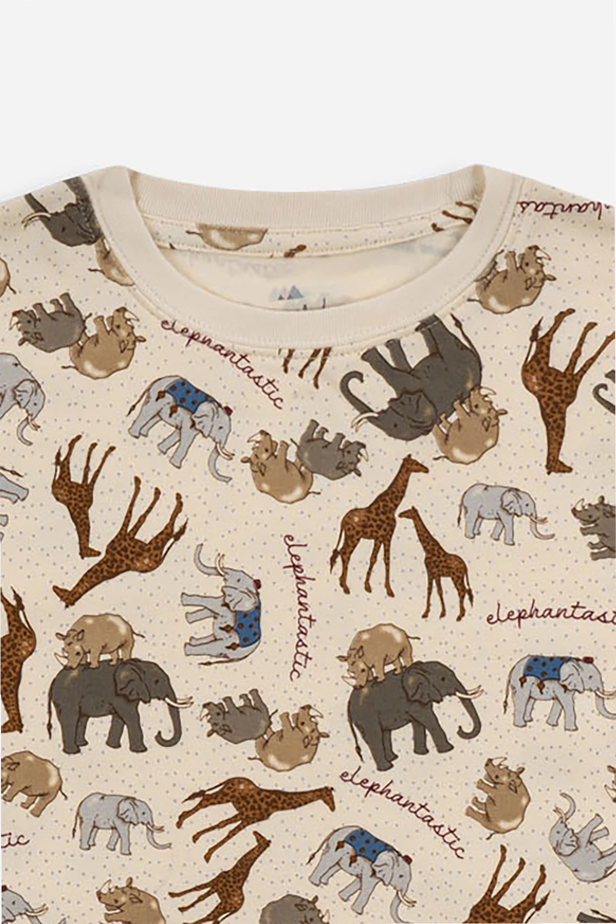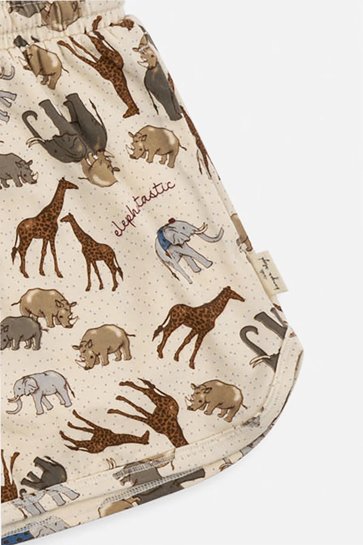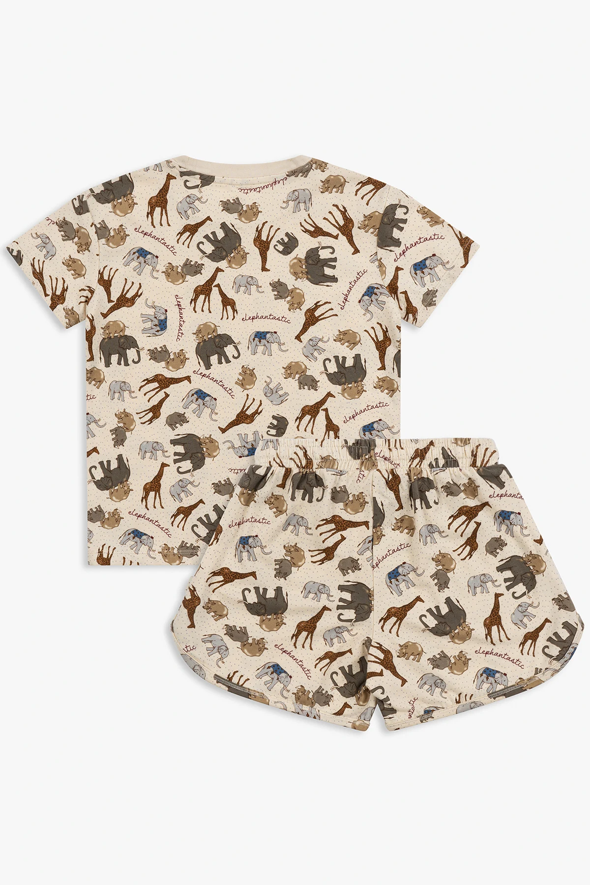 Kremowy komplet: t-shirt i szorty Konges Slojd. Wykonany z bawełny organicznej z certyfikatem GOTS. Ozdobiony kolorowym wzorem z motywem zwierząt. T-shirt z okrągłym dekoltem wykończonym lamówką z zapięciem na zatrzaski na ramieniu i krótkimi rękawami. Szorty z wszytą w pasie gumą.