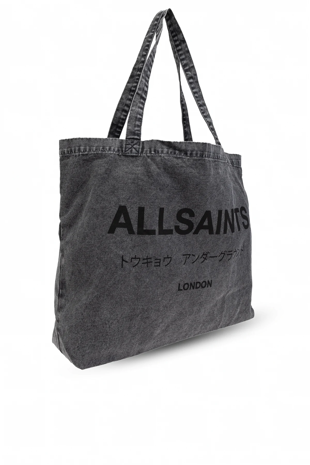 Dominującym kolorem torby jest szary, a jej przód zdobi wyrazisty nadruk z nazwą marki ALLSAINTS oraz napisem w języku japońskim, co podkreśla unikalny charakter produktu. Na dole torby umieszczono napis LONDON , dodający jej elegancji i klasy.