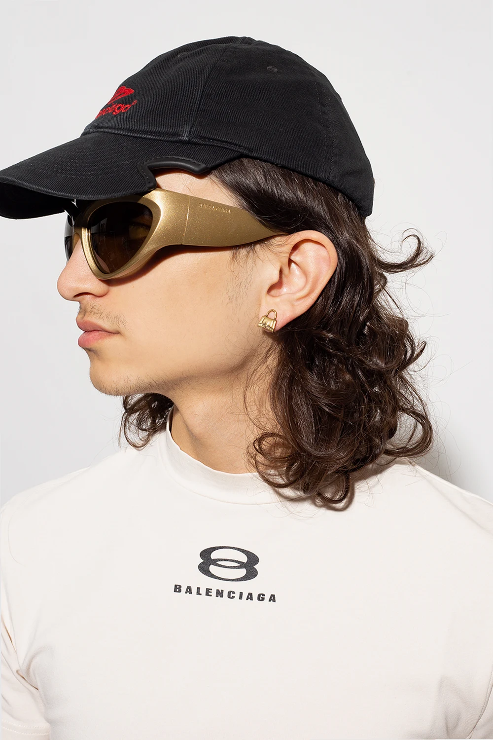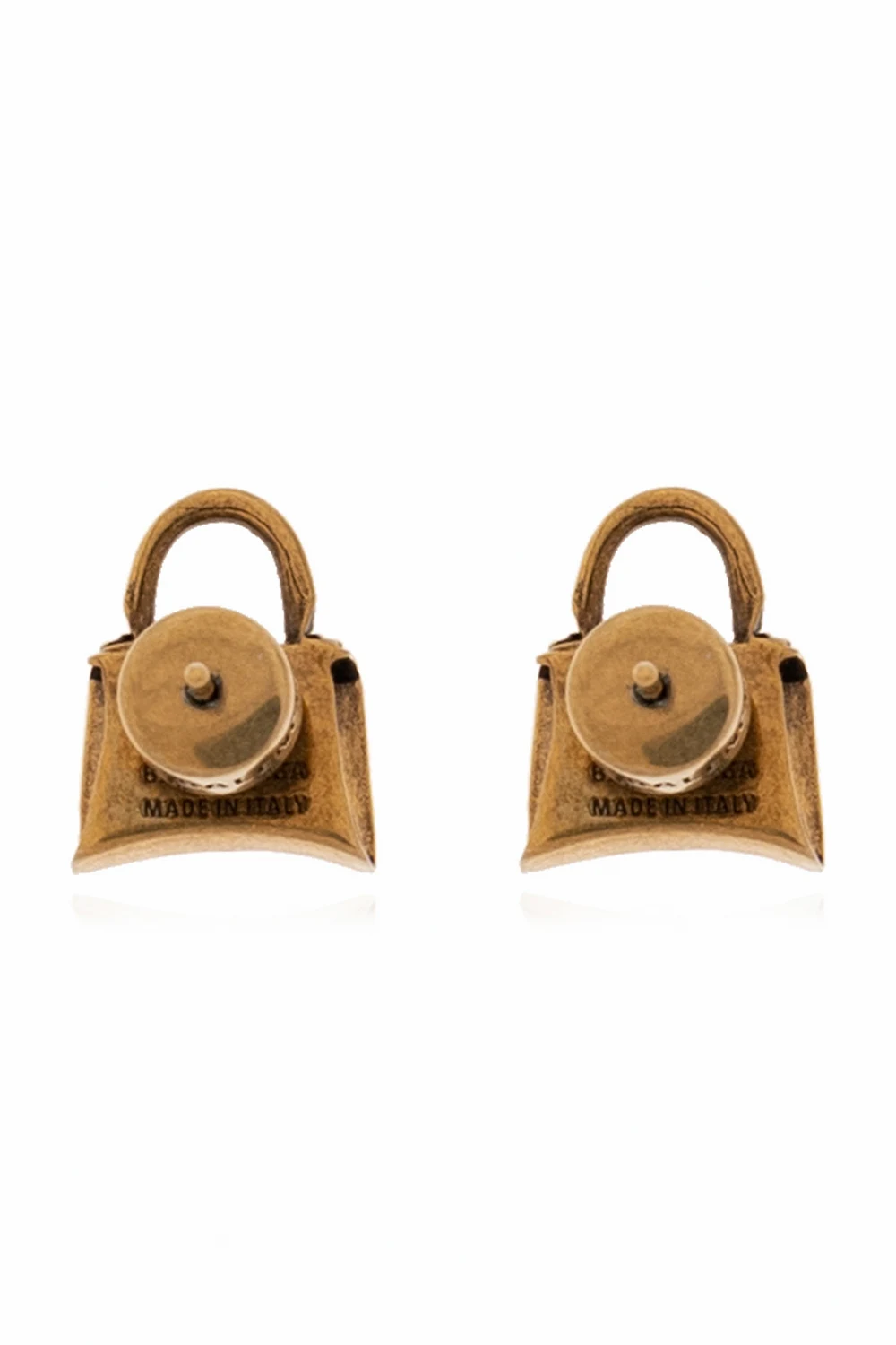 Kolczyki w kształcie charakterystycznej torby ‘Hourglass’ w kolorze postarzanego złota Balenciaga. Wykonane z brązu i mosiądzu. Zapinane na sztyft.