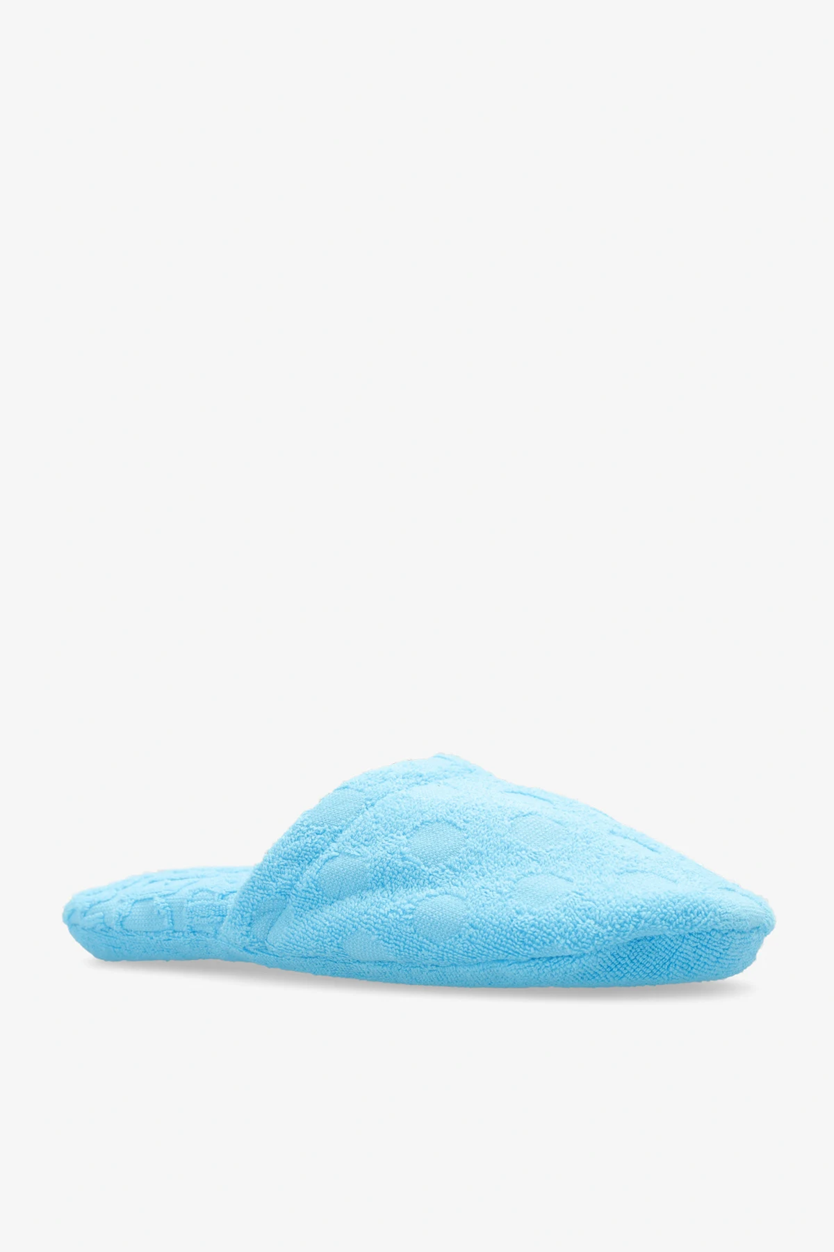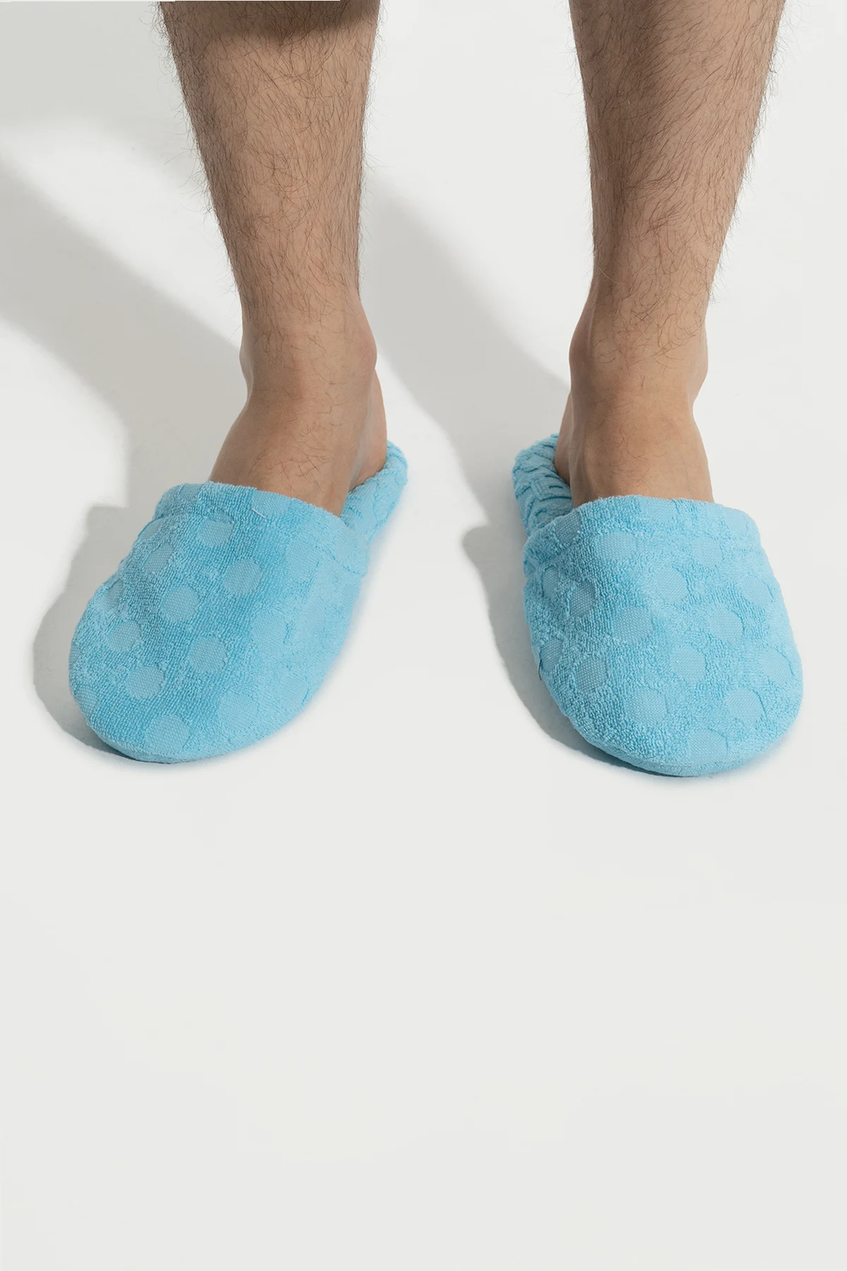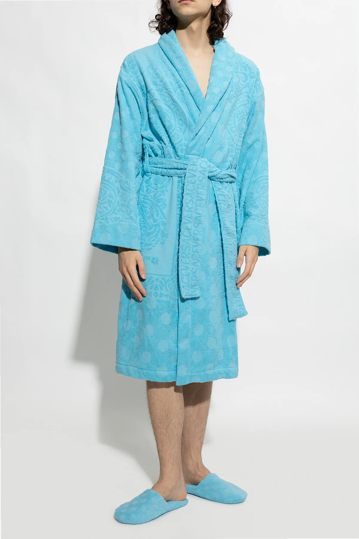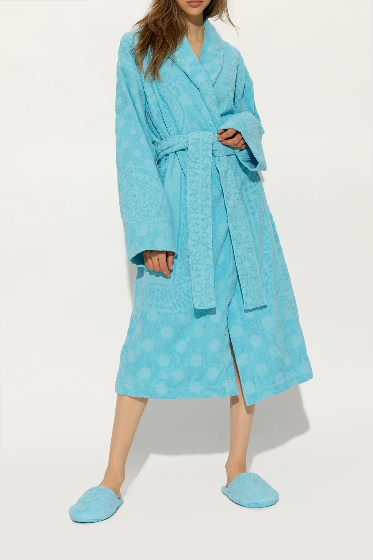 Jasnoniebieskie, bawełniane klapki Versace Home. Ozdobione wzorem w grochy.