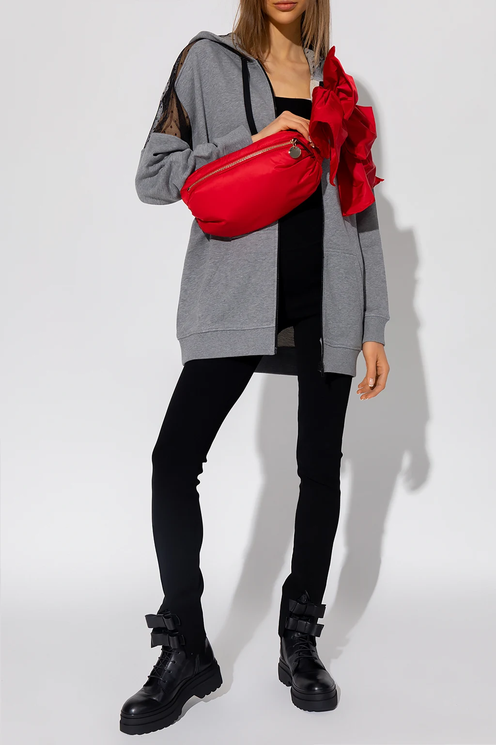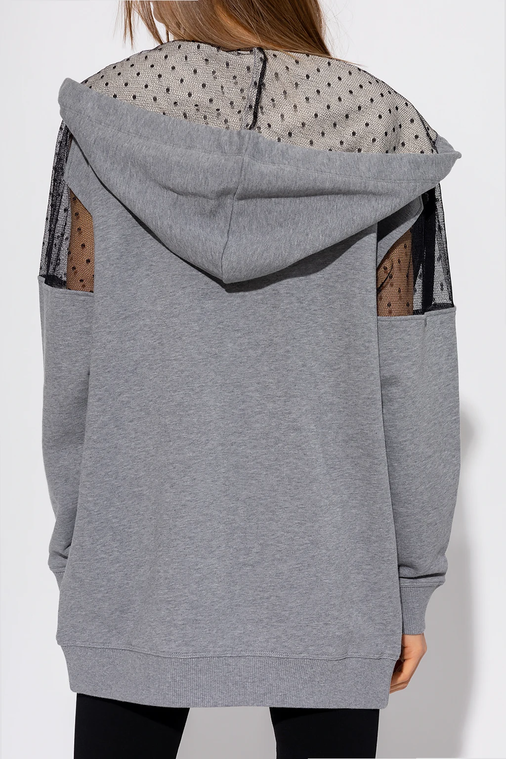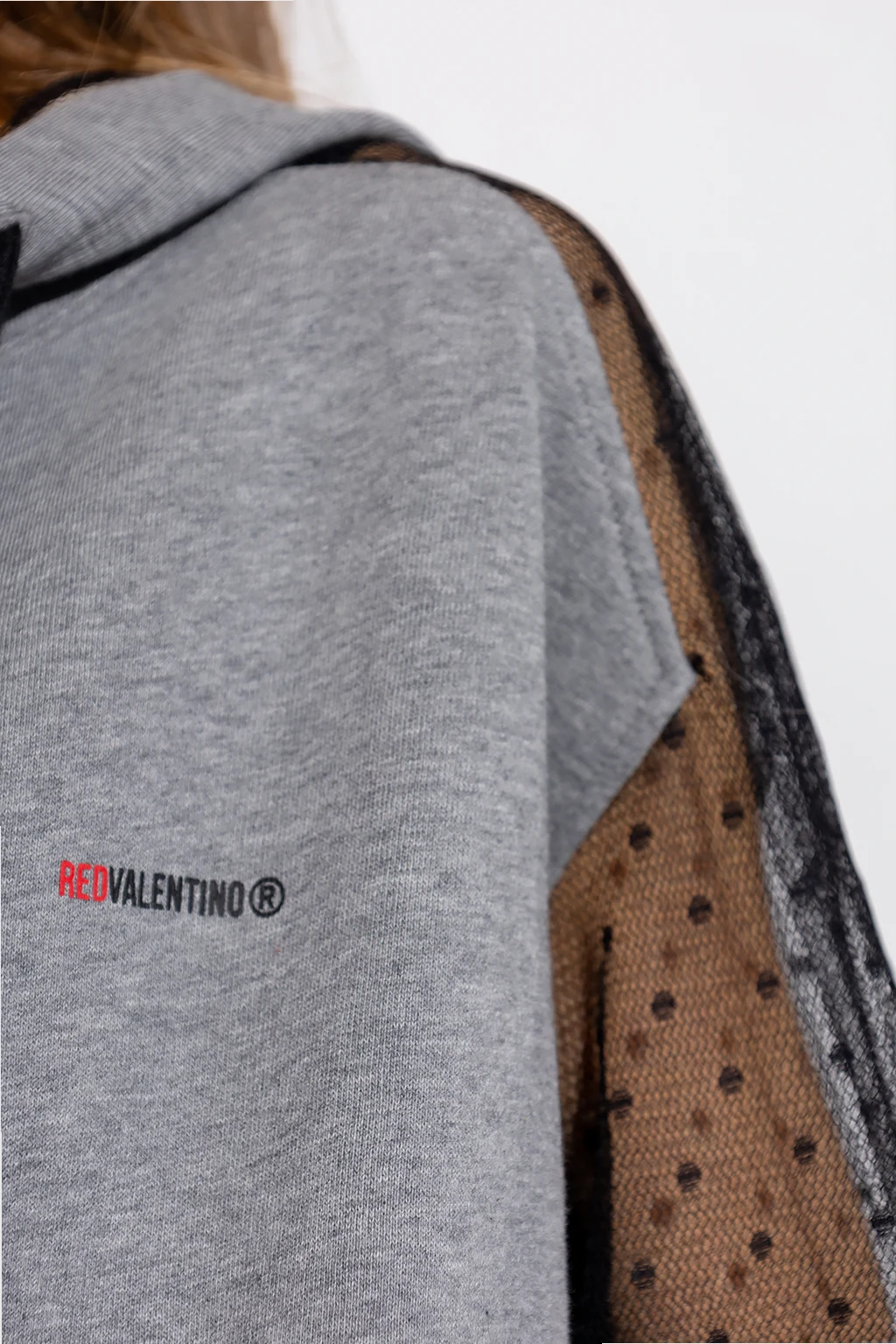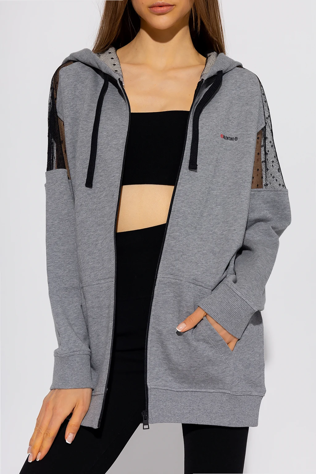 Szara bluza typu ‘oversize’ Red Valentino. Wykonana z bawełny. Zapinana na zamek. Kaptur ściągany trokami. Z przodu nadrukowane logo. Na ramionach dekoracyjne wstawki z tiulu ozdobionego charakterystycznym dla marki wzorem ‘Point d’Esprit’. Dwie wsuwane kieszenie. Długie rękawy i dół zakończone ściągaczem.