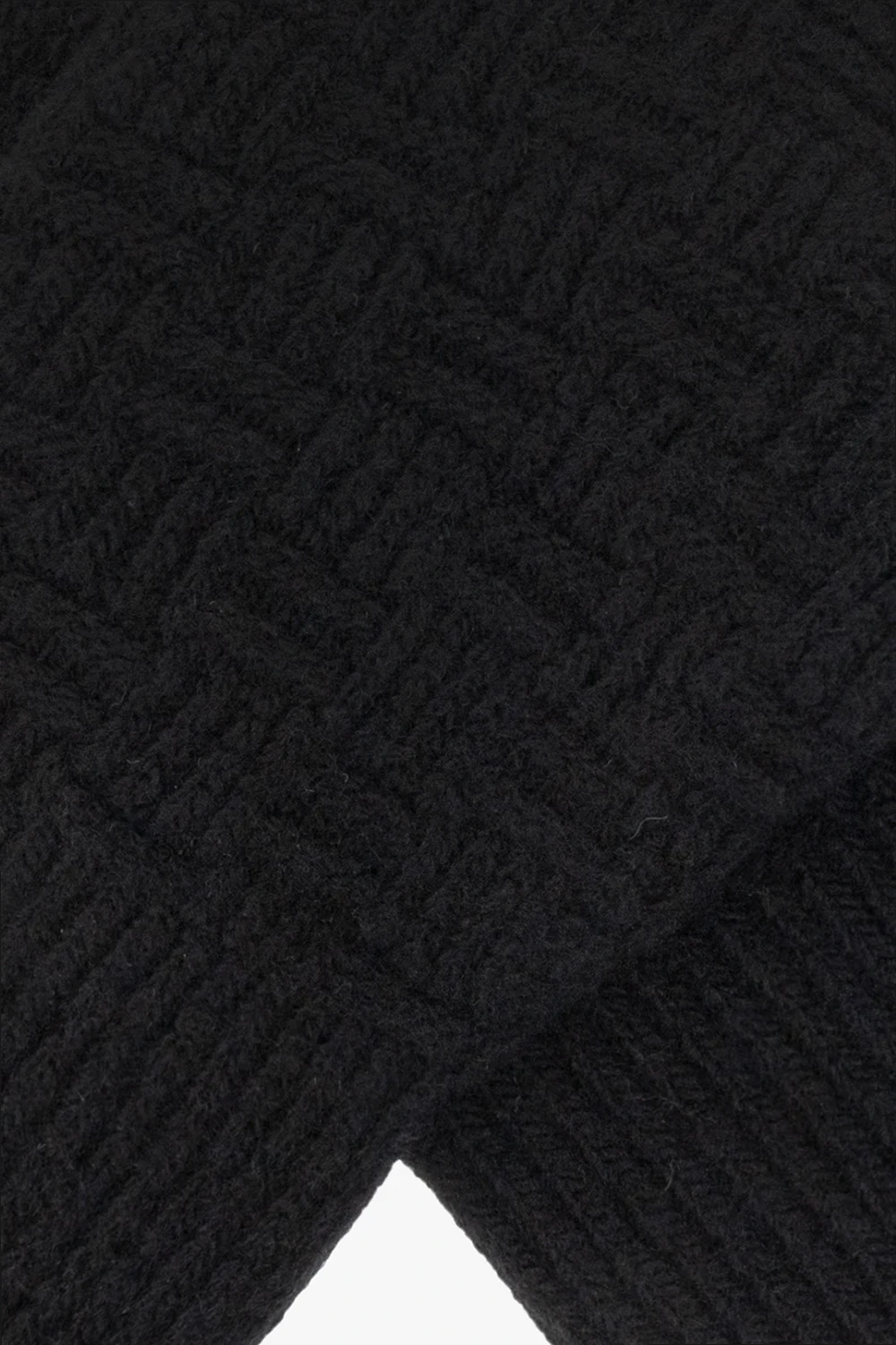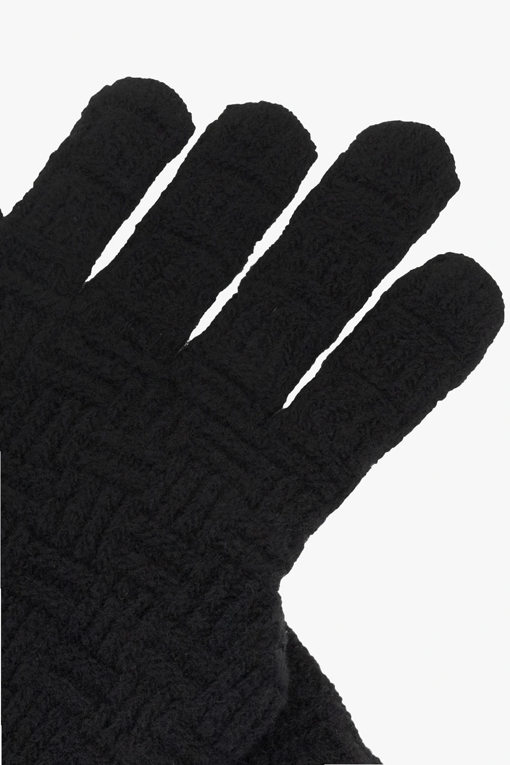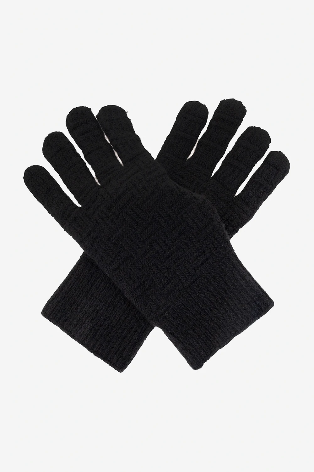 Czarne rękawiczki Bottega Veneta. Wykonane z mieszanki wełny i kaszmiru. Ozdobiona wzorem imitującym charakterystyczną dla marki plecionkę ‘Intreccio’. Wykończone ściągaczem.