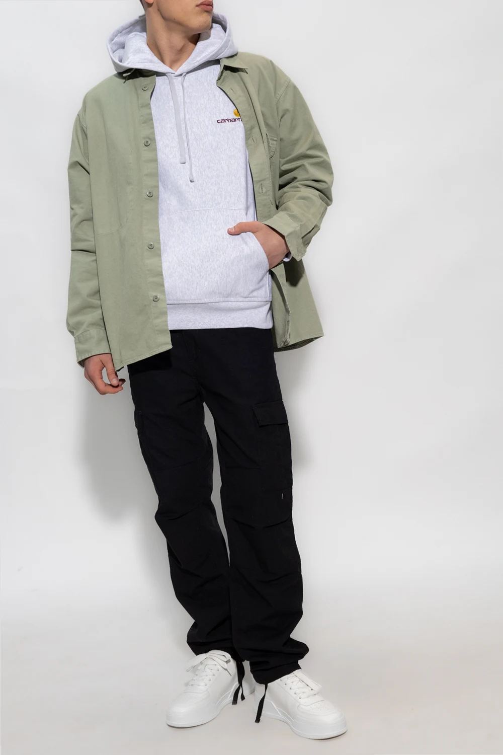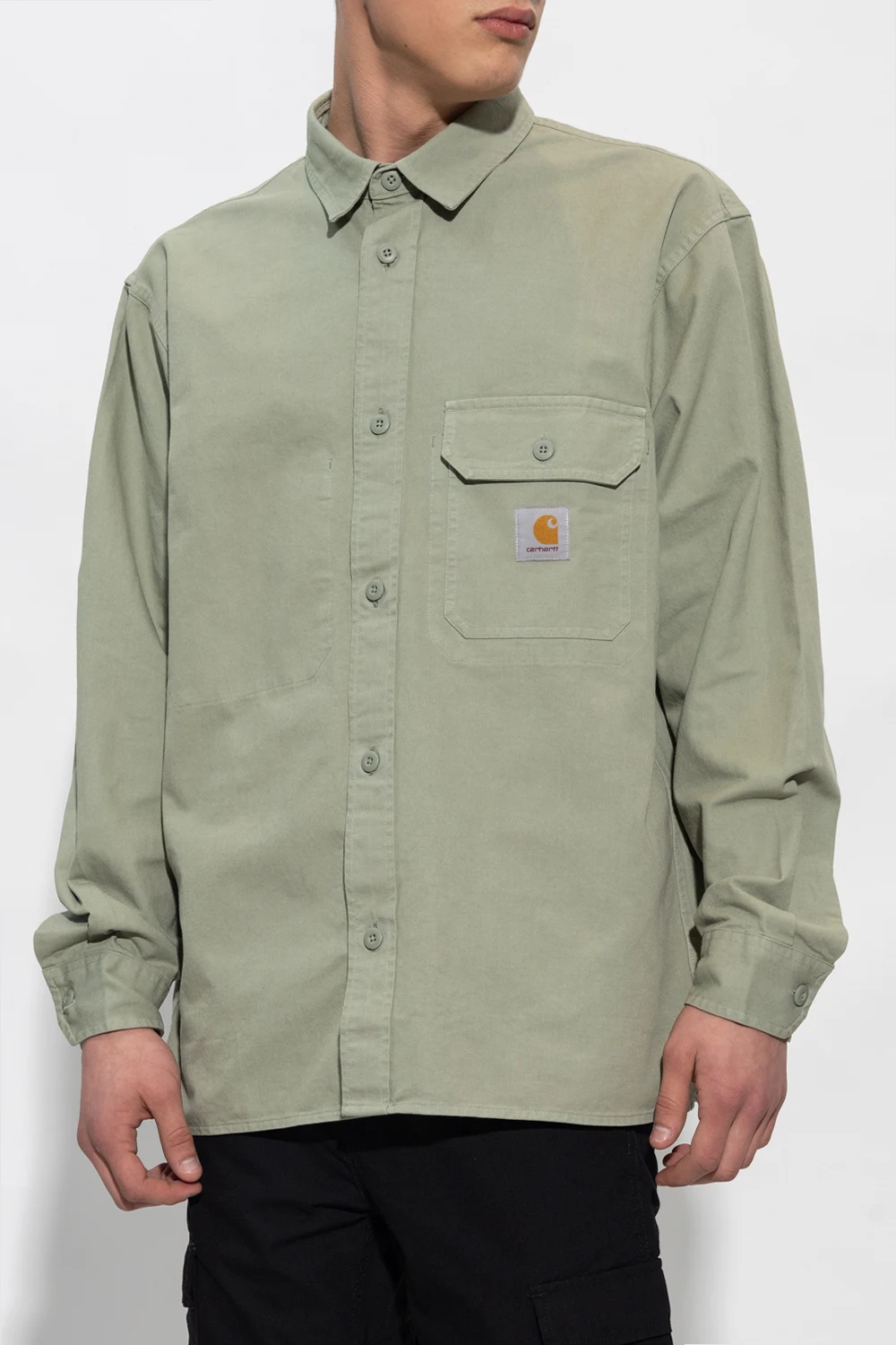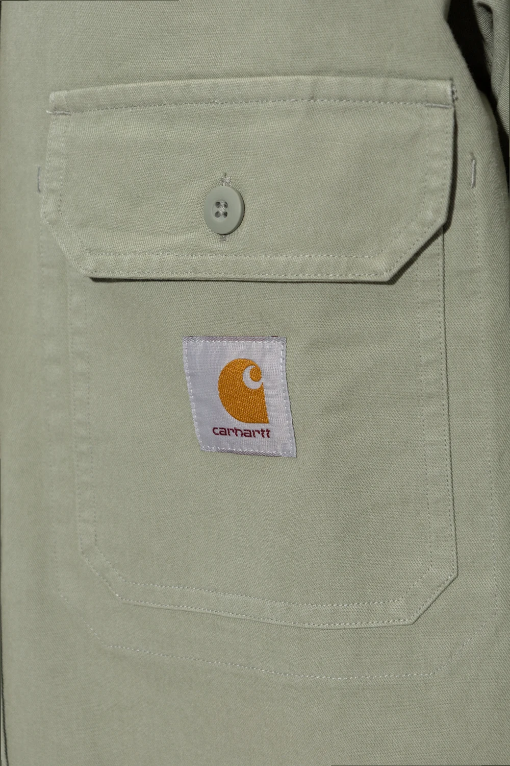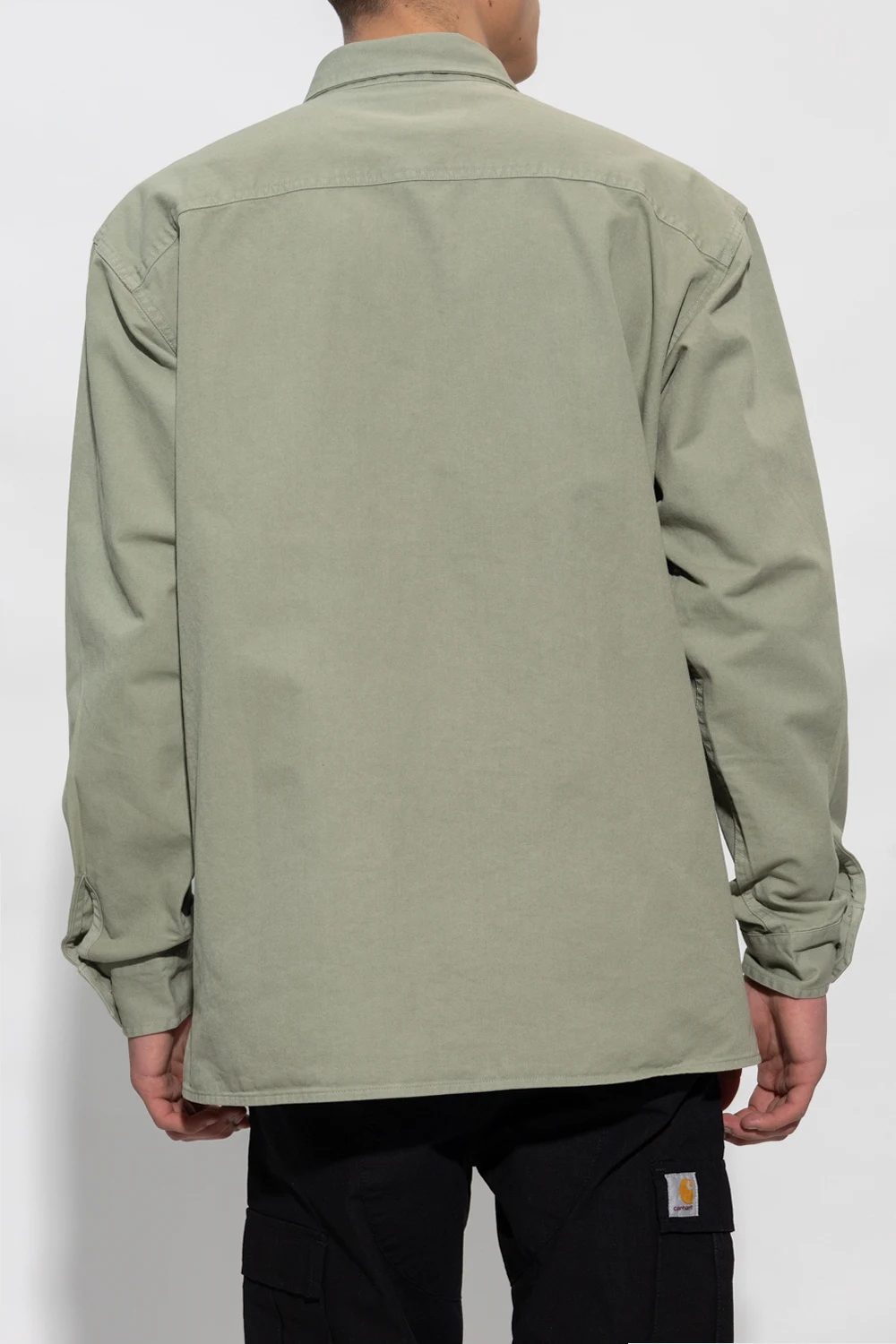 Zielona, bawełniana koszula Carhartt WIP. Zapinana na guziki. Z przodu kieszeń z patką zapinaną na guzik i naszywka z logo. Długie rękawy, mankiety zapinane na guzik.