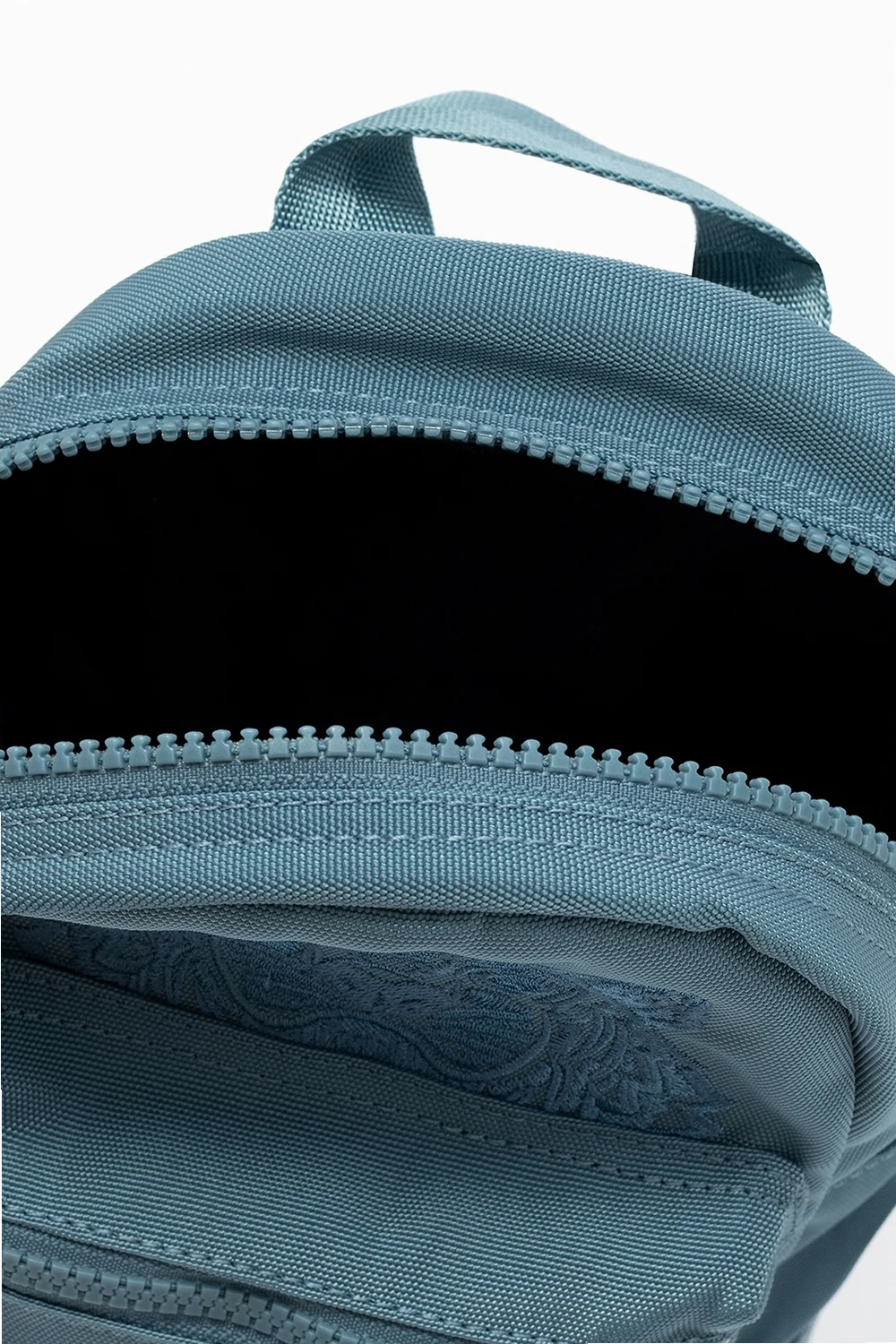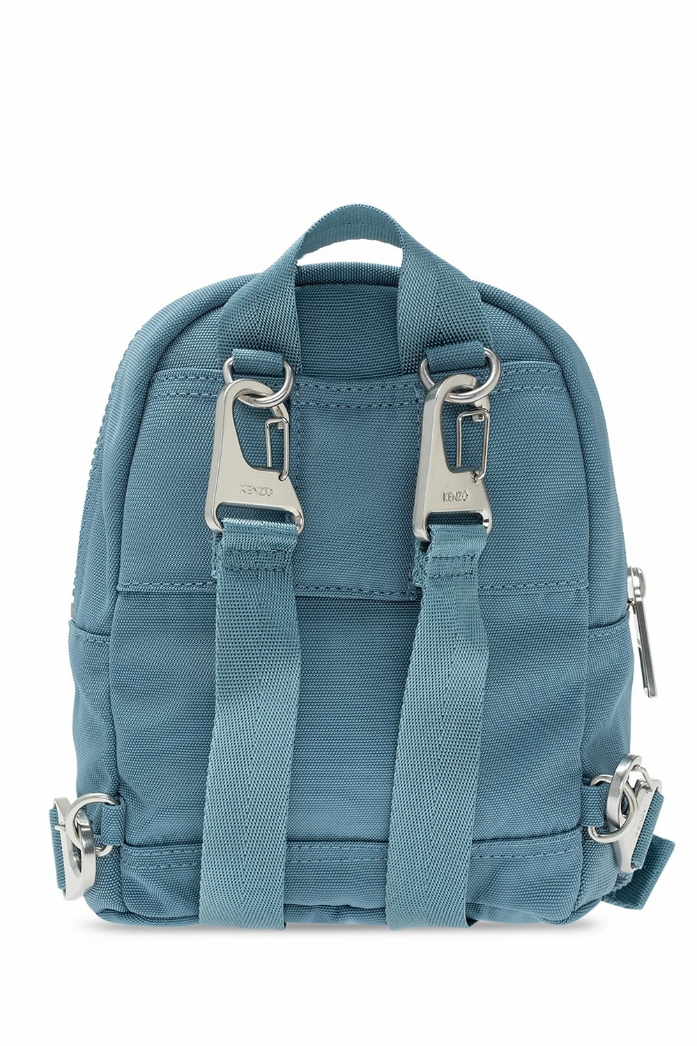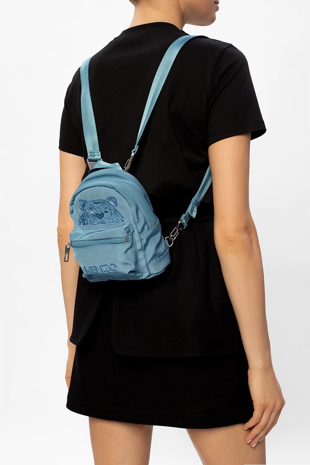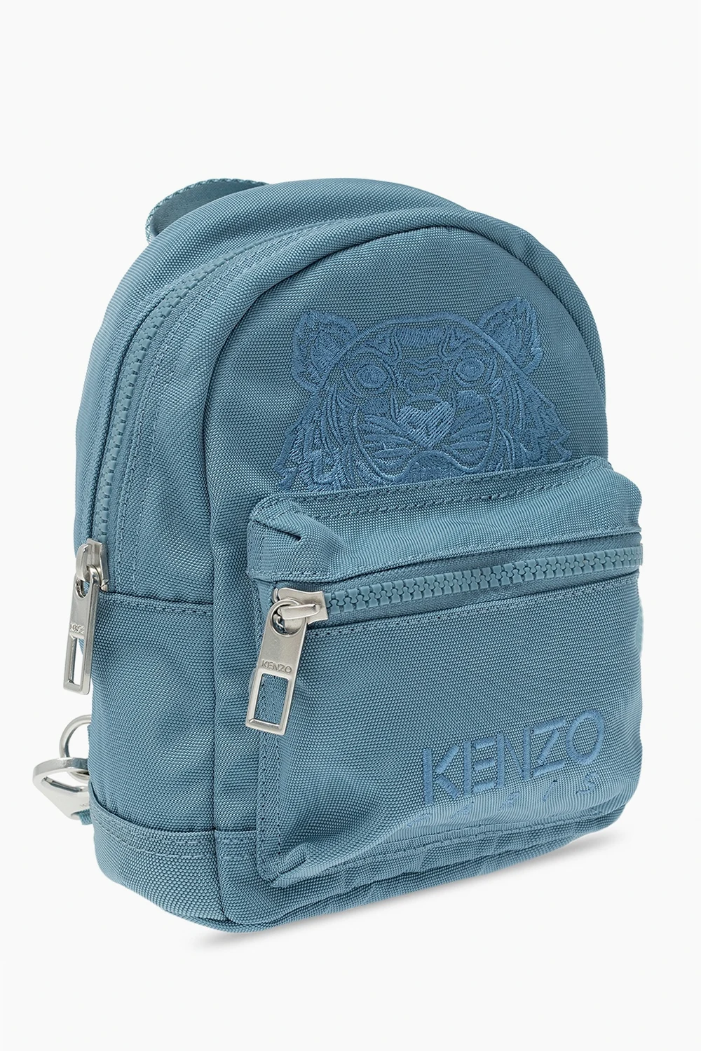 Jasnoniebieski plecak Kenzo. Zamykany na zamek. Z przodu kieszeń zamykana na zamek oraz wyszyte logo i charakterystyczna dla marki głowa tygrysa. Półokrągła rączka. Odpinane, regulowane szelki. Wewnątrz komora.