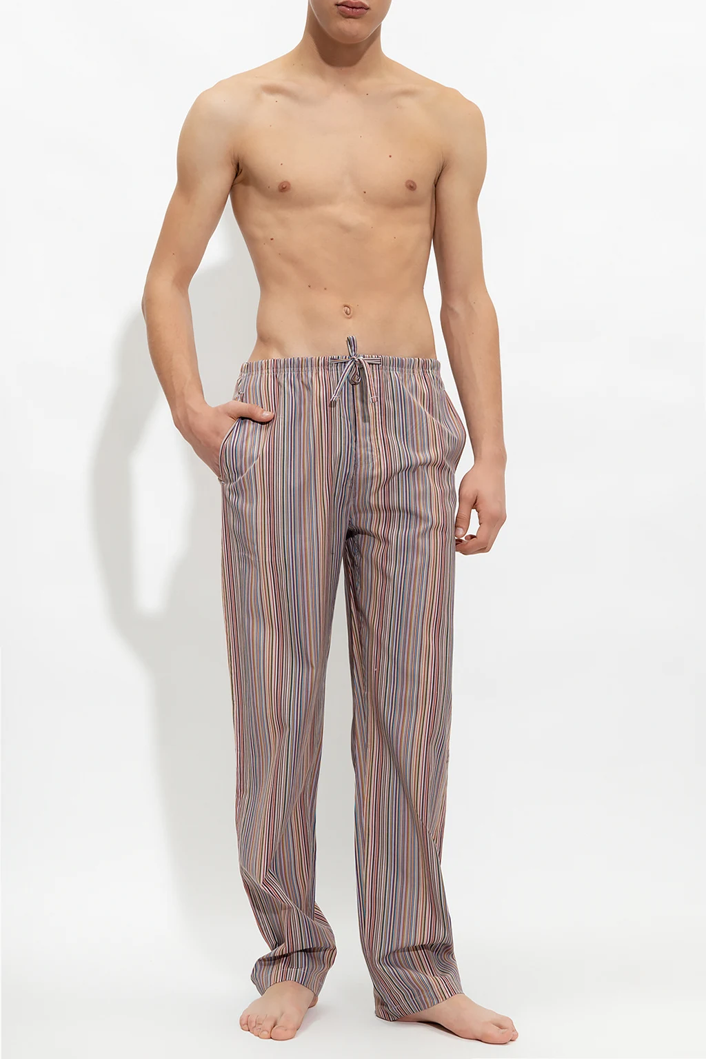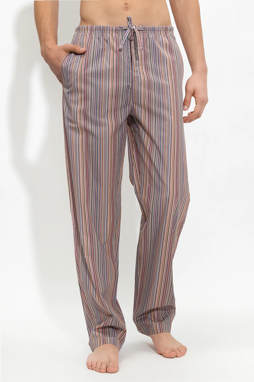 Kolorowy, bawełniany dół od piżamy Paul Smith. Zapinany na guziki i ściągane trokami. Ozdobiony wzorem w pasy. Z przodu dwie kieszenie. Z boku naszywka z logo. Długie nogawki o prostym kroju.