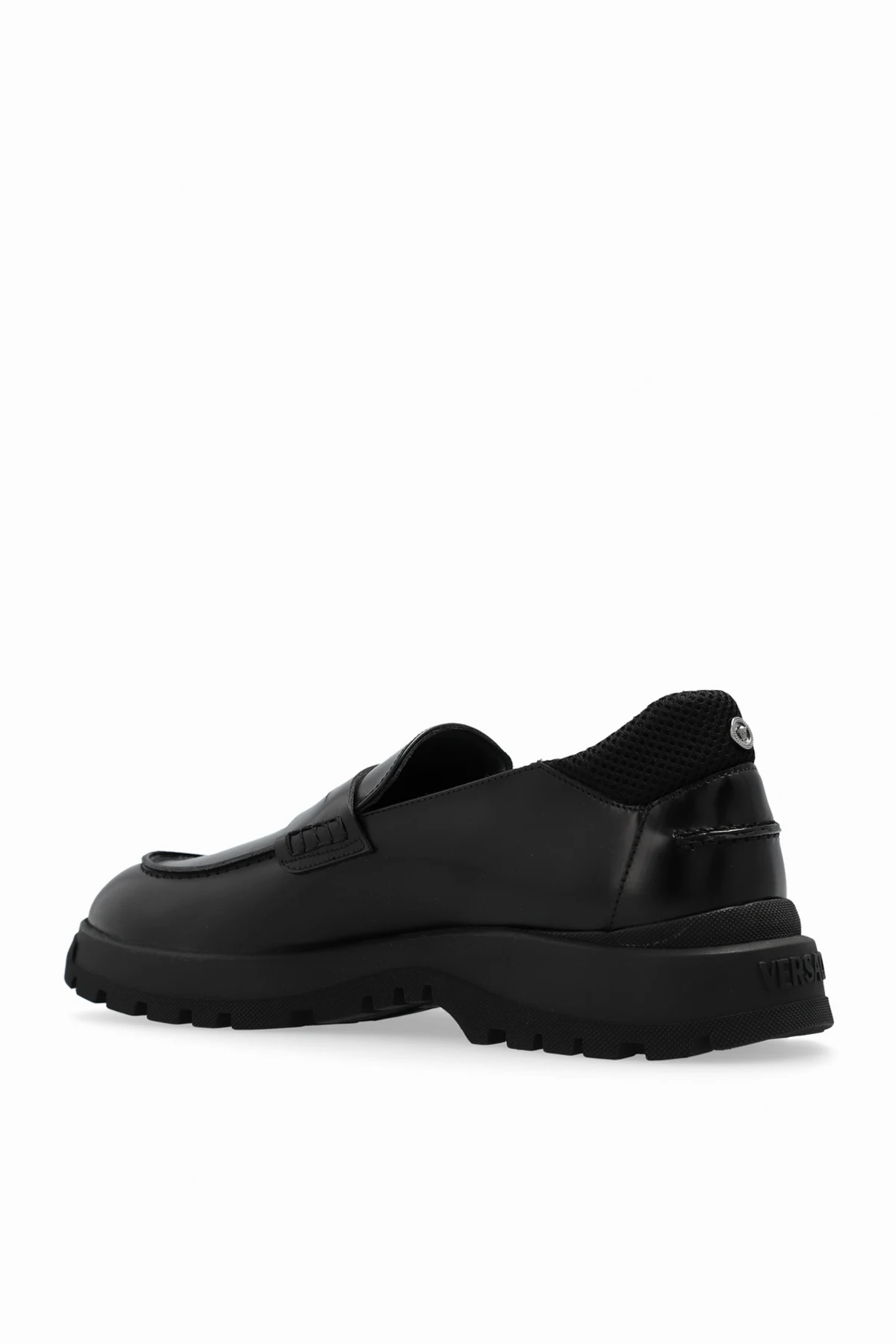 Czarne mokasyny, model ‘Elios’ Versace. Wykonane ze skóry. Ozdobione pasem z wycięciem. Z tyłu siateczkowa wstawka z aplikacją ‘Medusa’. Czarna, gumowa podeszwa.
