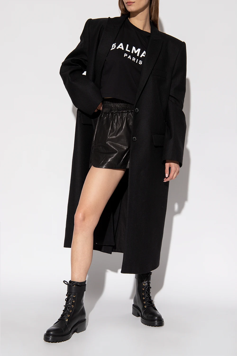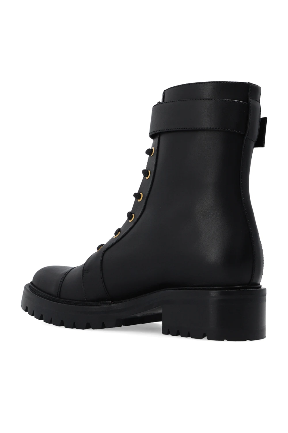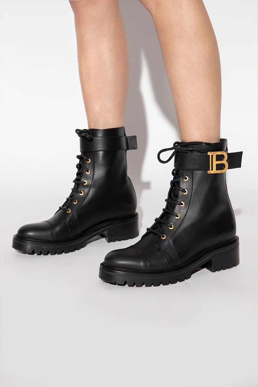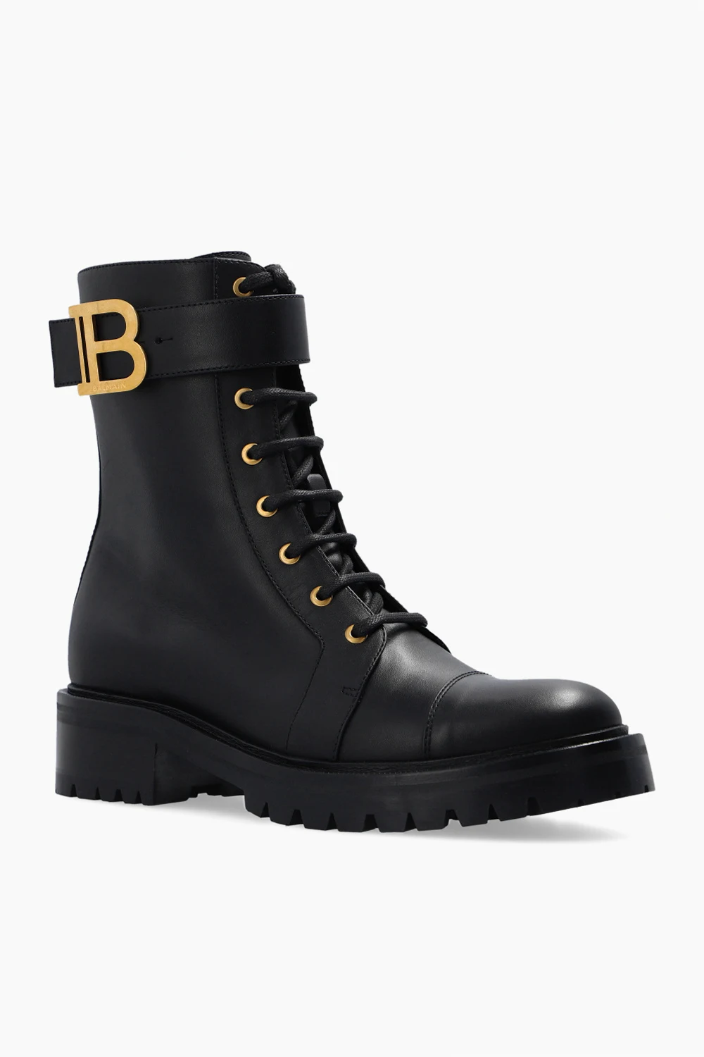 Czarne, sznurowane buty za kostkę Balmain. Wykonane ze skóry. Po bokach ozdobione czarnym pasem z klamrą w kształcie logo w kolorze złotym. Czarna, gumowa podeszwa.