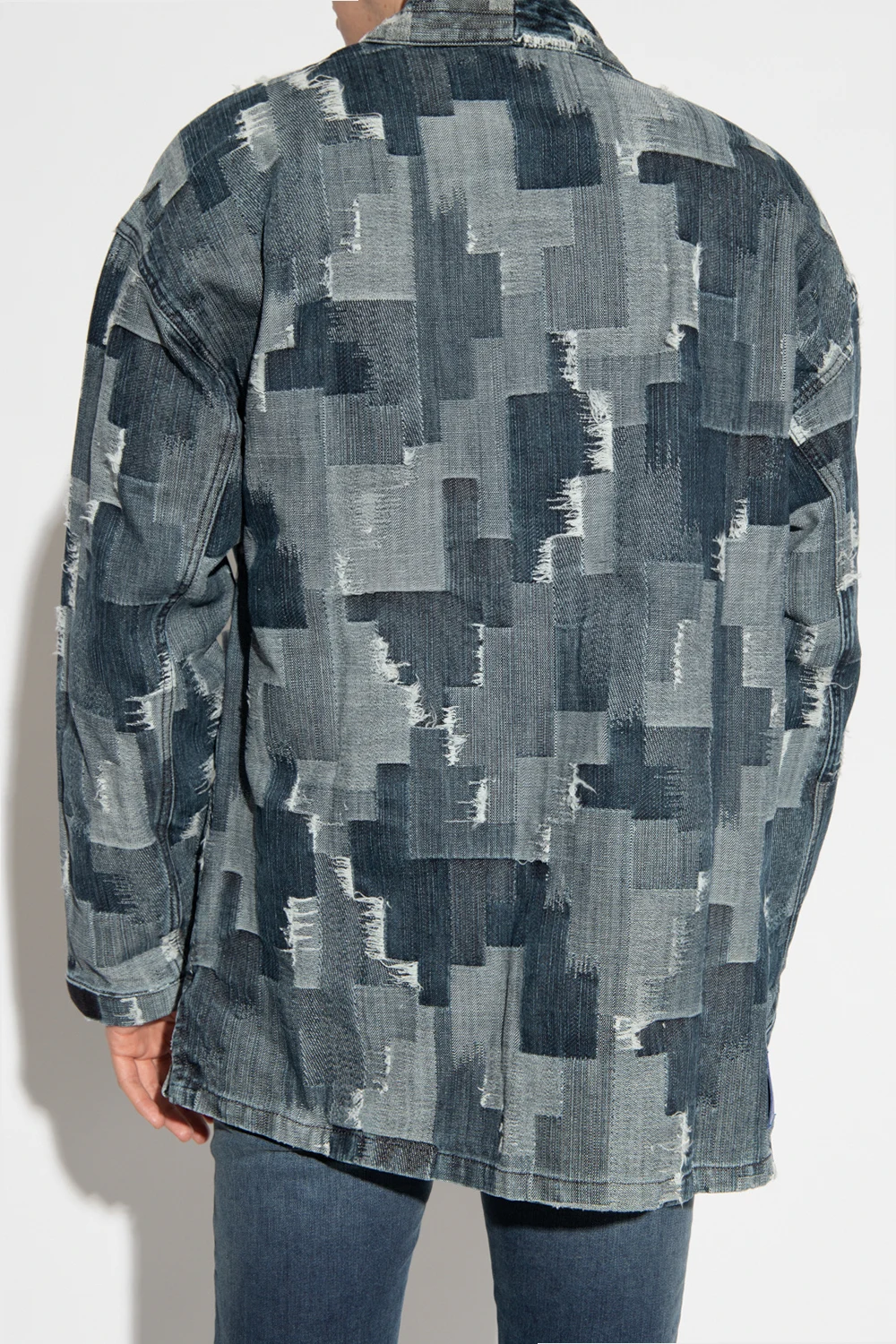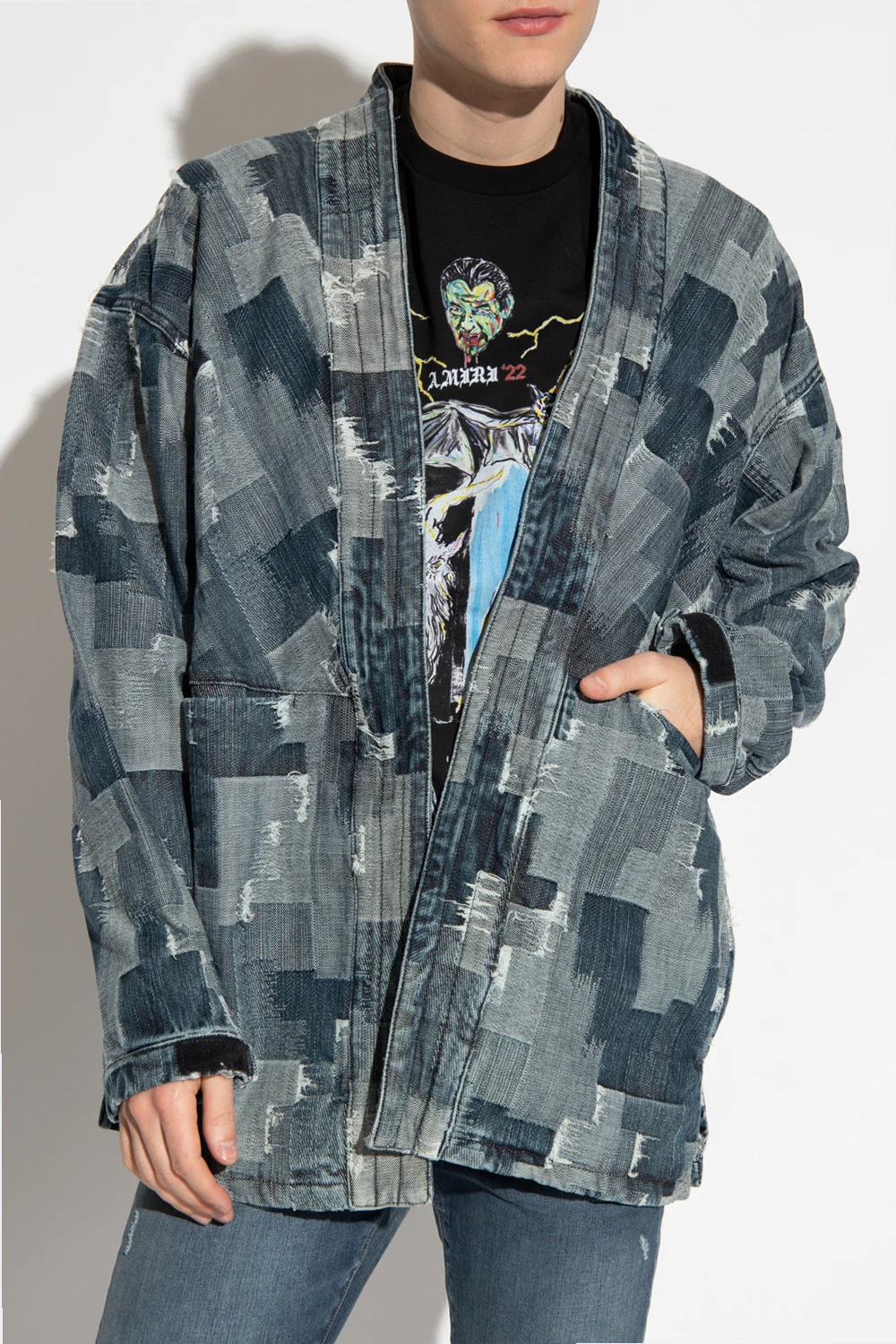 Niebiesko-granatowa, jeansowa kurtka Marcelo Burlon. Efekt ‘vintage’. Z przodu cztery kieszenie. Długie rękawy regulowane na rzep. Po bokach rozcięcie. Z tyłu niebieska naszywka z logo.