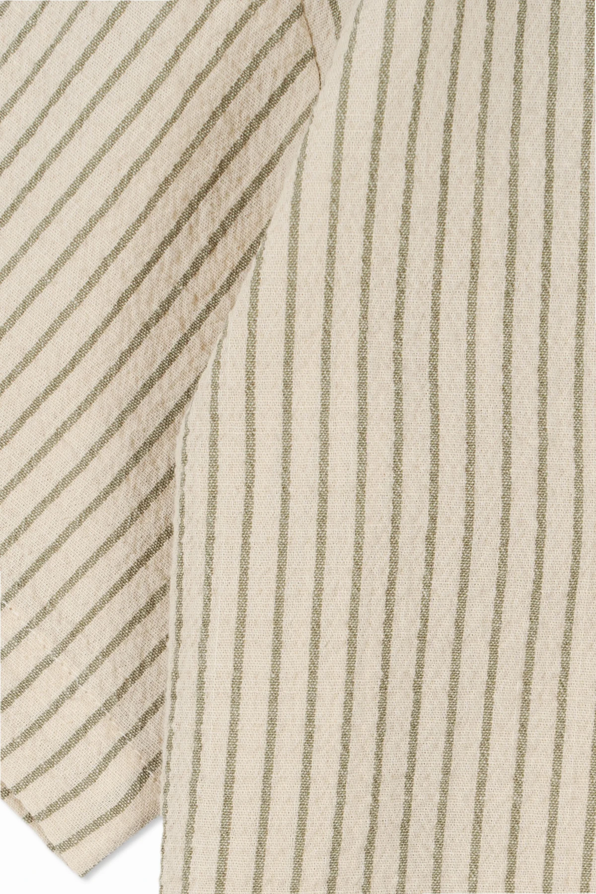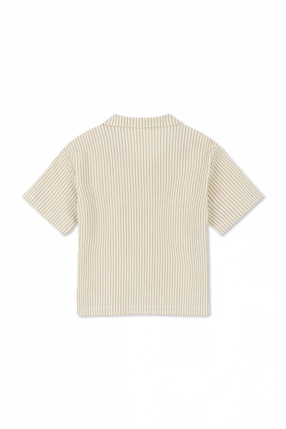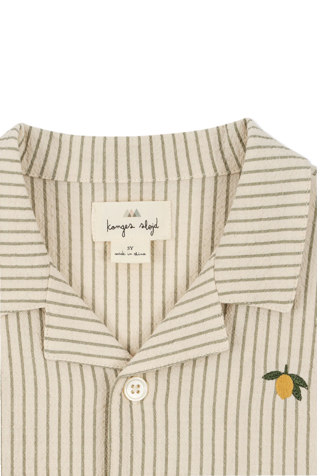 Pozwól sobie na dotyk luksusu z naszą ekskluzywną koszulą ‘Elliot’ od renomowanej marki Konges Sløjd . Wykonana z najwyższej jakości 100% bawełny organicznej , ta koszula łączy w sobie elegancję i komfort noszenia. Kremowy odcień tkaniny, wzbogacony o subtelne, pionowe pasy dodaje szlachetności, a kolorowe logo w kształcie owocu, umieszczone na lewej piersi, wprowadza nutę oryginalności.
